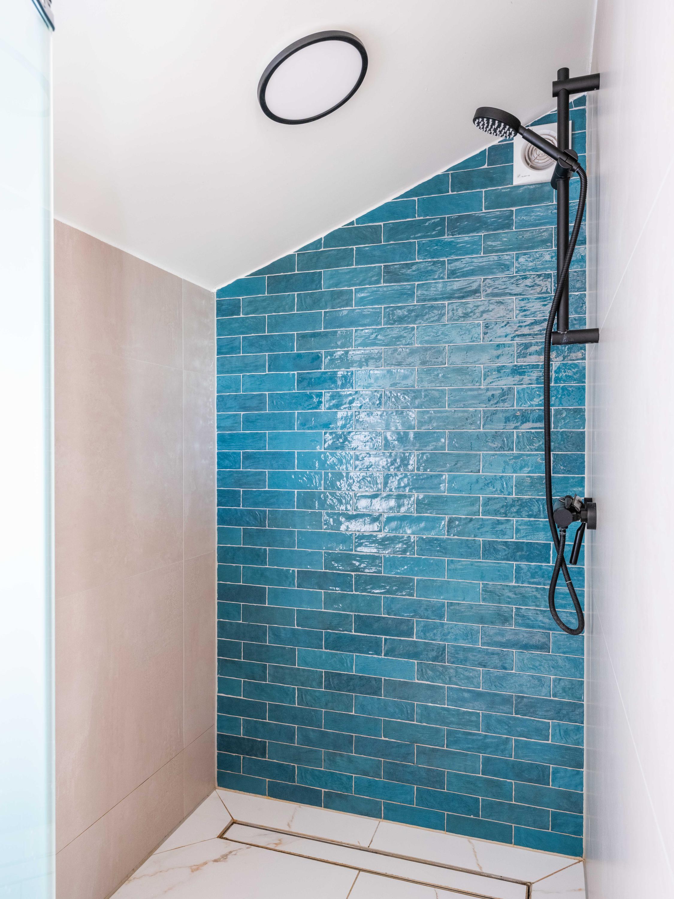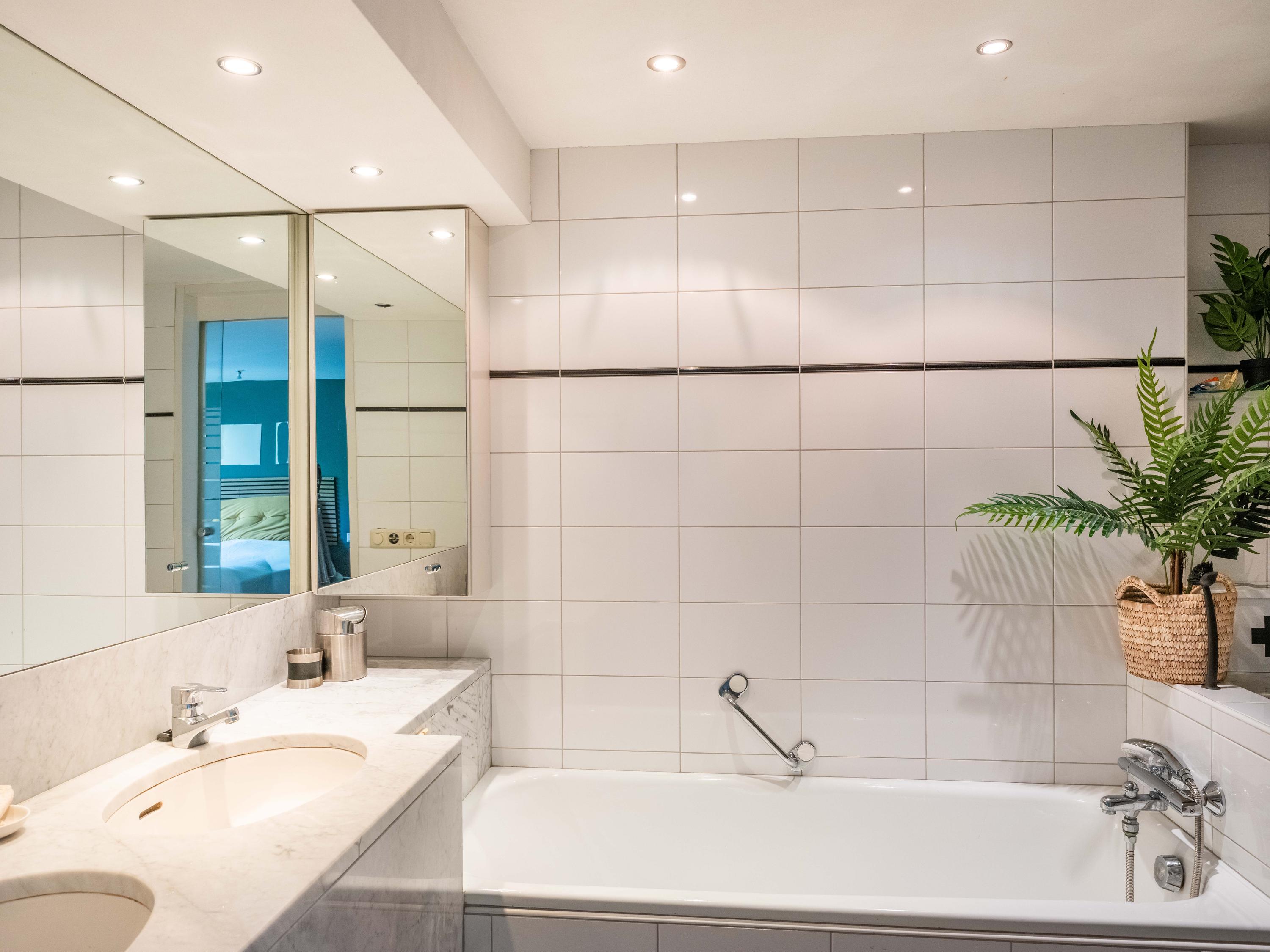 De master bedroom op de begane grond beschikt over een inloopkast en een complete, lichte badkamer met ligbad, inloopdouche, dubbele wastafel, vloerverwarming en toilet. Levensloopbestendig wonen is dus hier prima mogelijk.