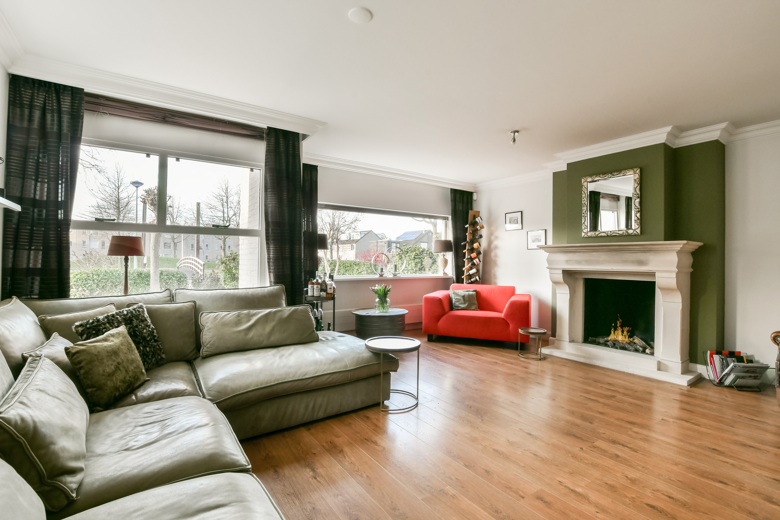 De ruime woonkamer aan de voorzijde is voorzien van een gezellige gashaard, een erker en een fraaie laminaatvloer.