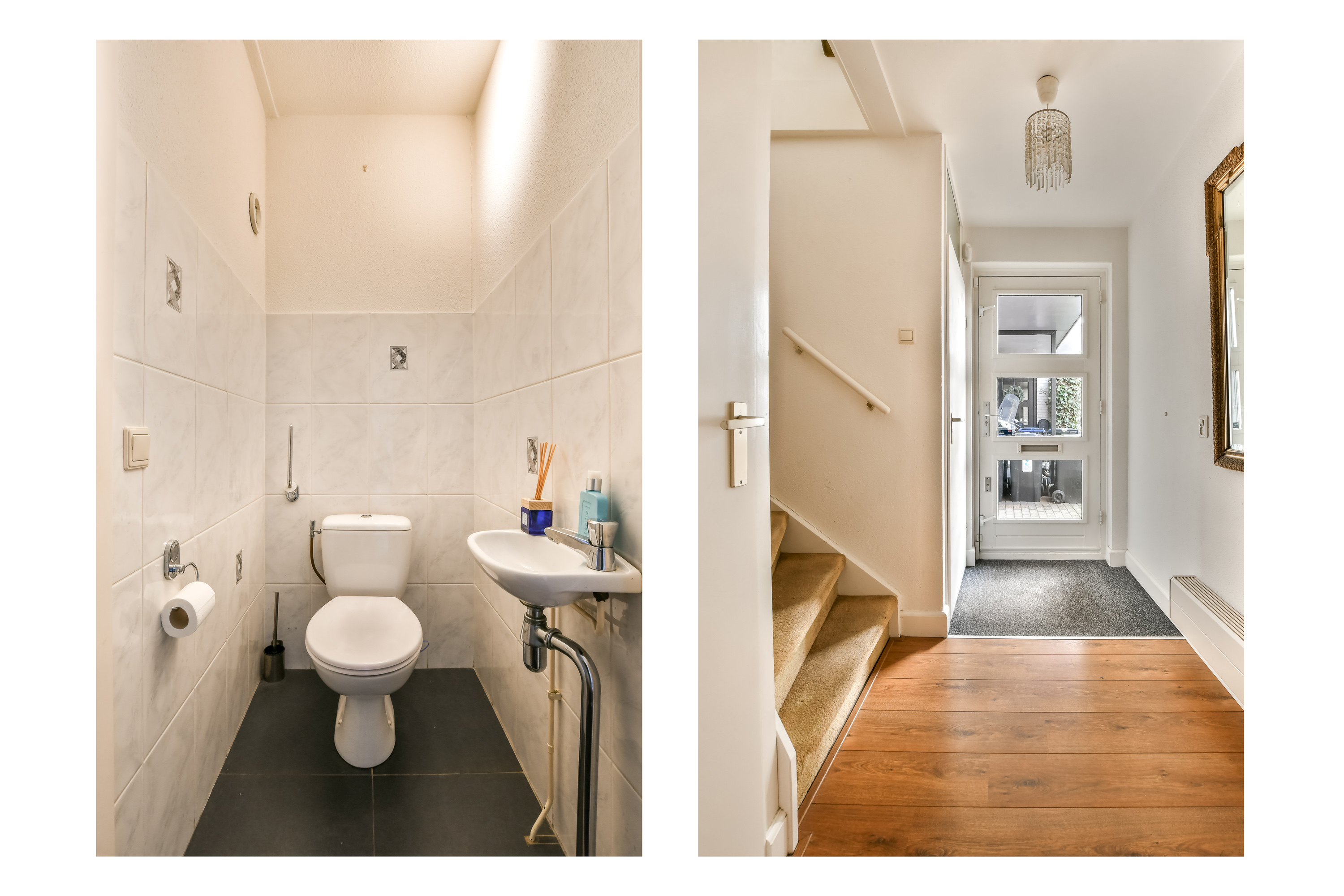 Entree/hal met meterkast, toilet, trapkast, trap naar de eerste verdieping en toegang tot de woonkamer.