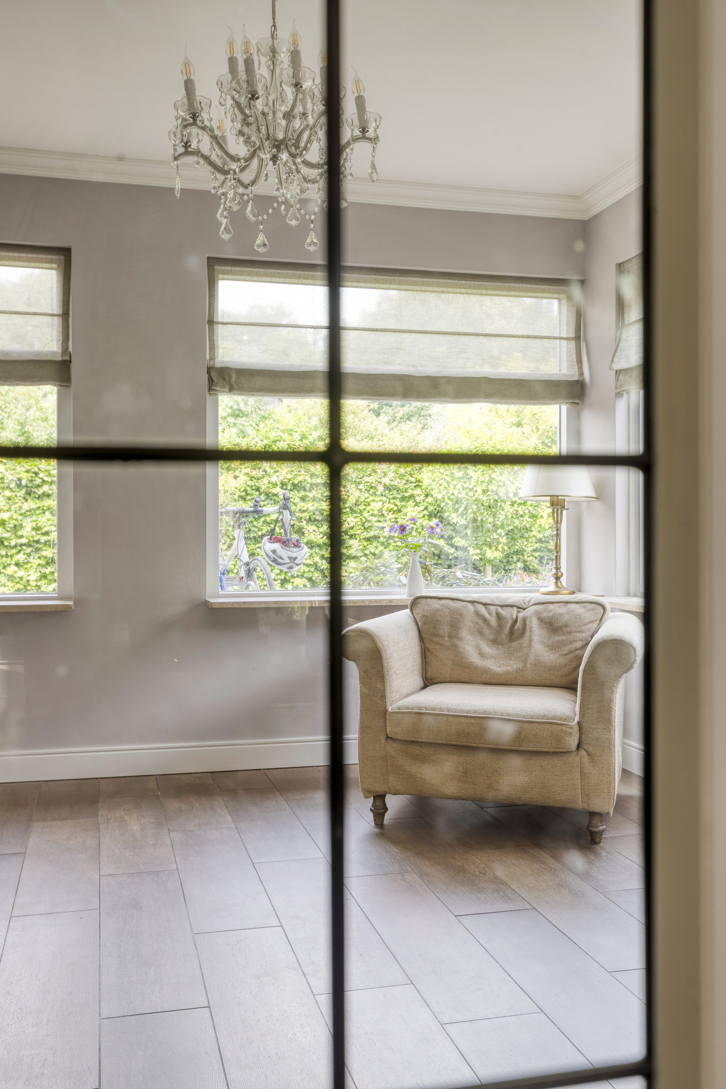 De gehele begane grond inclusief de veranda is voorzien van een houtlook tegelvloer met vloerverwarming.