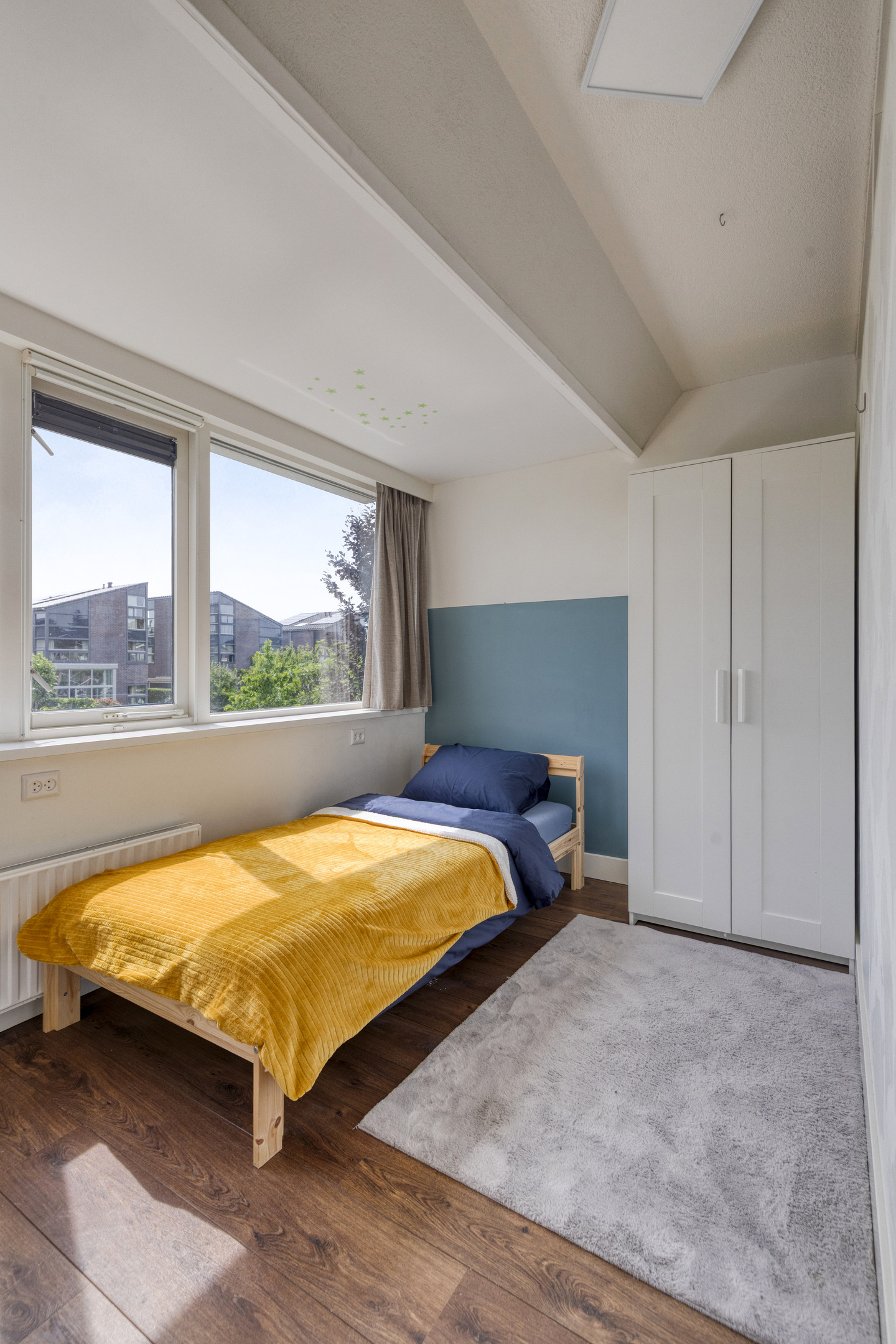 Slaapkamer met dakraam en zijraam en vaste kast. Extra bergruimte is er te vinden achter knieschotten onder het schuine dak.