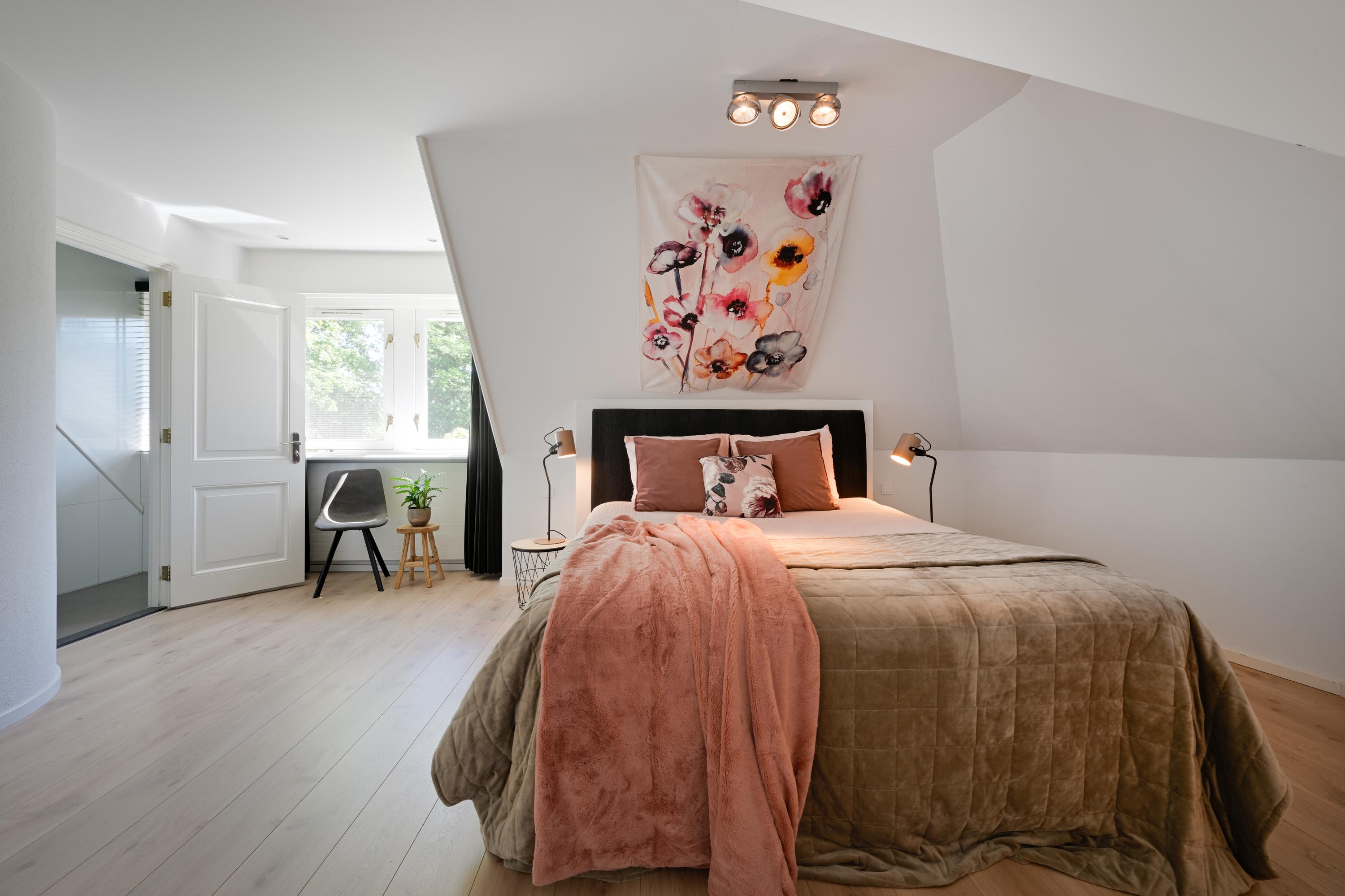 Hal met bordestrap en lift, werkkamer met ronde erker met prachtig uitzicht, ruime slaapkamer met toegang tot balkon, tweede grote (ouder-)slaapkamer met beschut balkon met fraai uitzicht over de tuin, gang naar kleedkamer en eigen badkamer met ligbad, douche, dubbele wastafel in meubel, urinoir en toilet, vloerverwarming. Derde slaapkamer en vierde slaapkamer beide met dakkapel en beide met toegang naar badkamer met bad, douche, toilet, urinoir, wastafelmeubel en vloerverwarming.