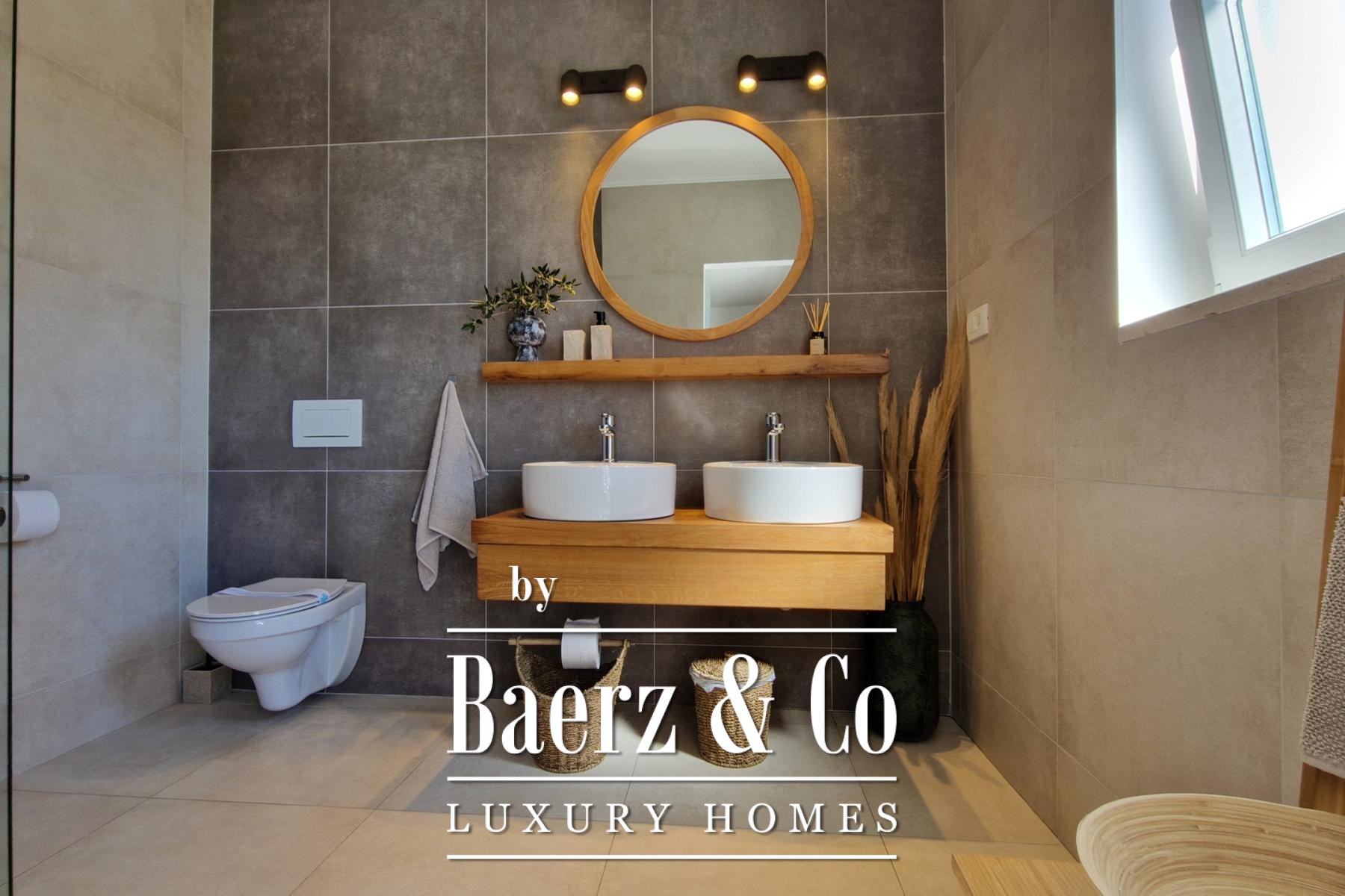 Bij binnenkomst zijn er drie slaapkamers, elk met een eigen en-suite badkamer. De badkamers beschikken over vloerverwarming en de gehele villa is voorzien van airconditioning. Het interieur balanceert zorgvuldig tussen rustiek karakter en moderne luxe, met een royale woonkamer met open haard, een volledig uitgeruste keuken en een eetruimte die uitkomt op een overdekt terras van 36 m². Een extra gastentoilet en een technische ruimte van 14 m² bieden praktische verfijning.