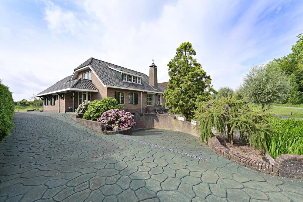 Via een fraaie houten glaswand met bijpassende deur betreedt u de sfeervolle woonkamer in L-vorm waar grote raampartijen zorgen voor een overvloed aan daglicht en een prachtig zicht op de voortuin en zijkant van het perceel. Een marmeren plateau met afsluitbare houtgestookte open haard vormt het centrale punt voor een gezellige zithoek. Aan de achterzijde is volop ruimte voor een grote eettafel, pal naast de openslaande deuren naar het verhoogde en onderheide terras – met een adembenemend uitzicht over de tuin, het water en het uitgestrekte polderlandschap. De eetkamer staat via een elegante toog in verbinding met de ruime, lichte keuken, die voorzien is van dubbele openslaande ramen met zicht op de achtertuin. De keuken is uitgerust met volop kastruimte en diverse inbouwapparatuur: een vaatwasser, oven, elektrische kookplaat met afzuigkap en een koel-/vriescombinatie. Aansluitend treft u de praktische bijkeuken met vaste kast (waar zich de verdeling van de vloerverwarming bevindt), extra opbergruimte, en aansluitingen voor de wasmachine en de wasdroger, een extra wastafel én een deur naar het verhoogde terras. De gehele begane grond is voorzien van een doorlopende tegelvloer met comfortabele vloerverwarming. Alle raamkozijnen zijn uitgevoerd in hardhout, en alle ramen zijn voorzien van houten luiken of rolluiken – een stijlvolle combinatie van comfort en klassieke charme.