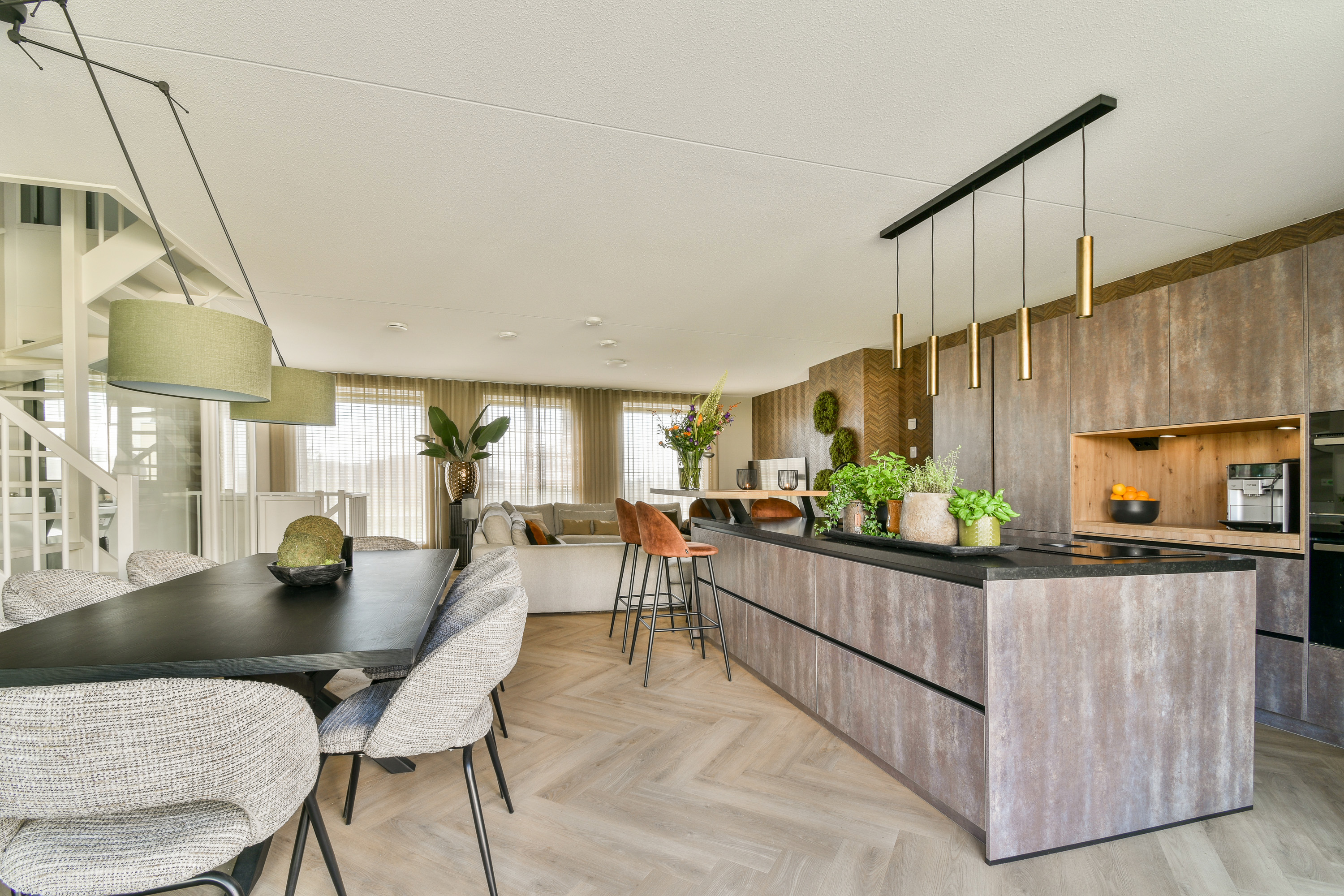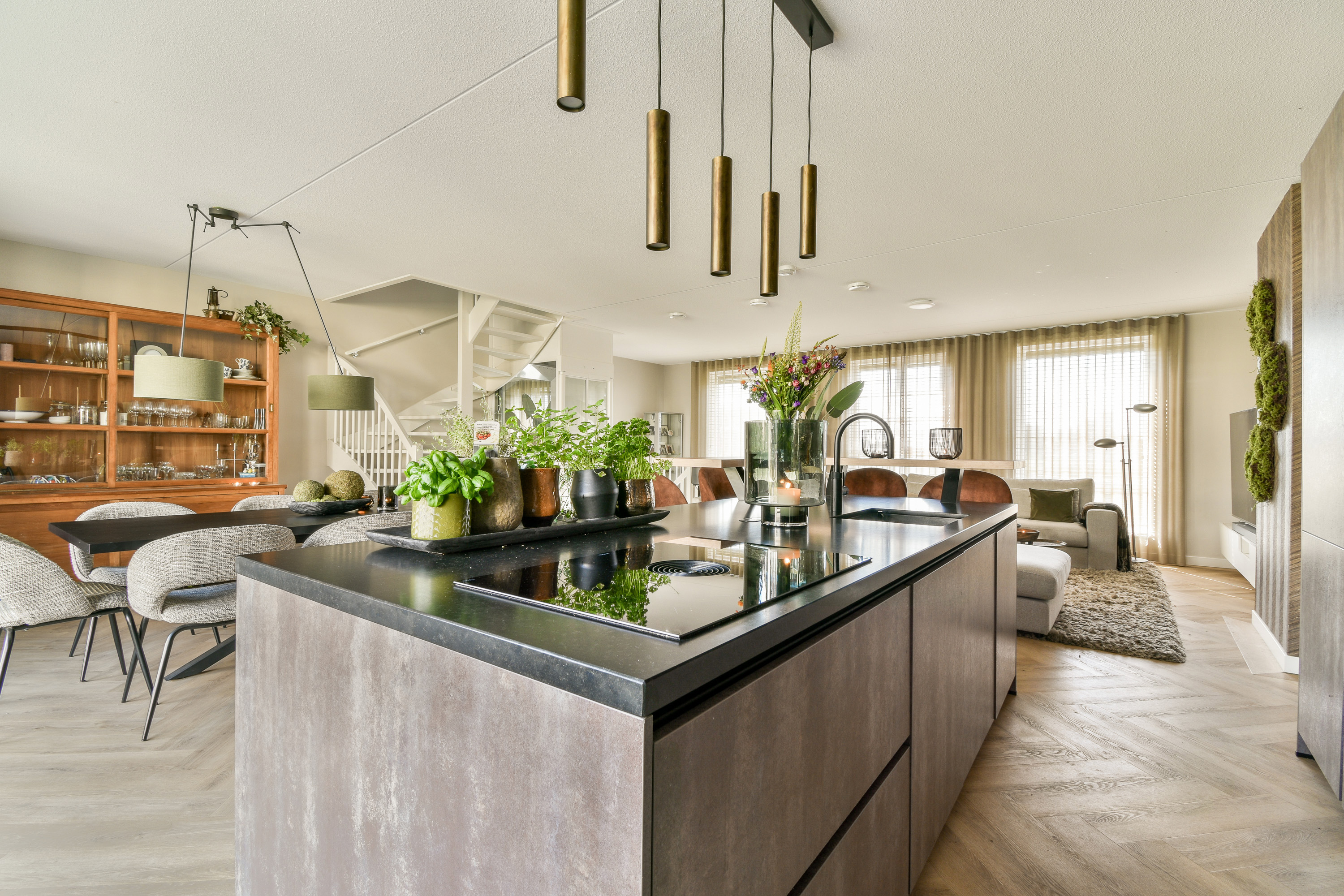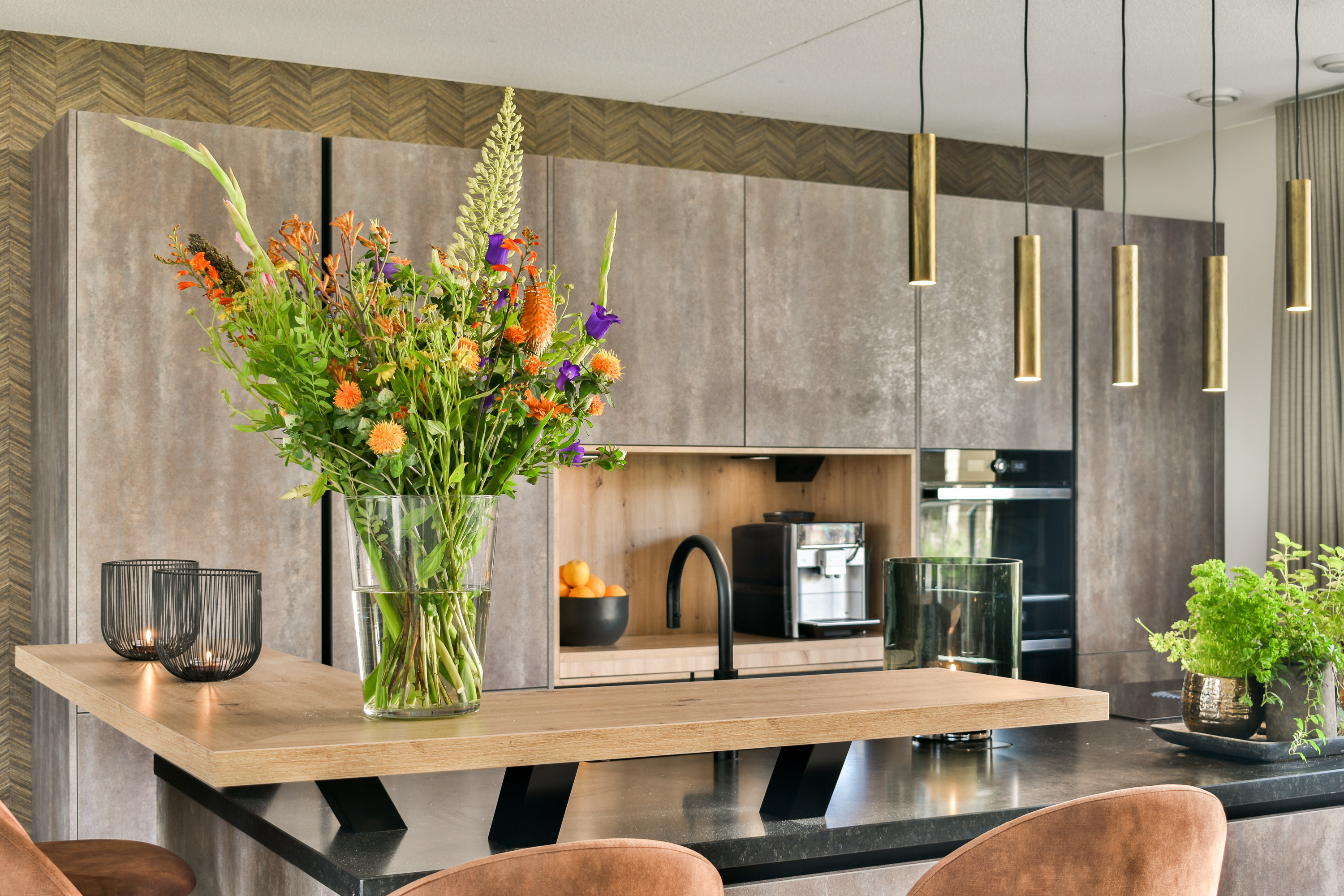 In de hoek van de living bevindt zich de heerlijke leefkeuken. Een keuken is natuurlijk niet alleen gemaakt om in te koken. Het is ook vaak de plek waar de dag begint en eindigt. Om dit gevoel te optimaliseren hebben de huidige eigenaren dan ook gekozen voor een zeer luxe en uitgebreide keukeninrichting. De inrichting is geplaatst in een recht deel met een kookeiland. Men heeft de beschikking over talloze gemakken, zoals een inductiekookplaat met geïntegreerd afzuigsysteem (Bora), een grote koelkast, een grote vriezer, een oven, magnetron, een vaatwasser, een spoelbak met Quooker-kraan en veel bergruimte in de (bestek-)lades en bergkasten. Verder is de gehele keuken voorzien van een granieten werkblad met zitbar.