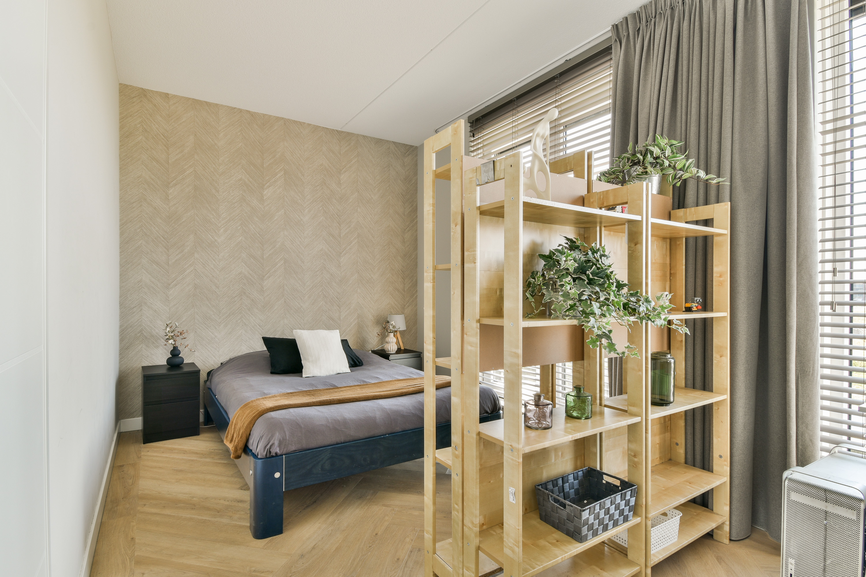 Deze slaapkamer is eveneens aan de achterzijde van de woning gelegen en is afgewerkt met een PVC-vloer (visgraat gelegd) en renovlies behang op de wanden.