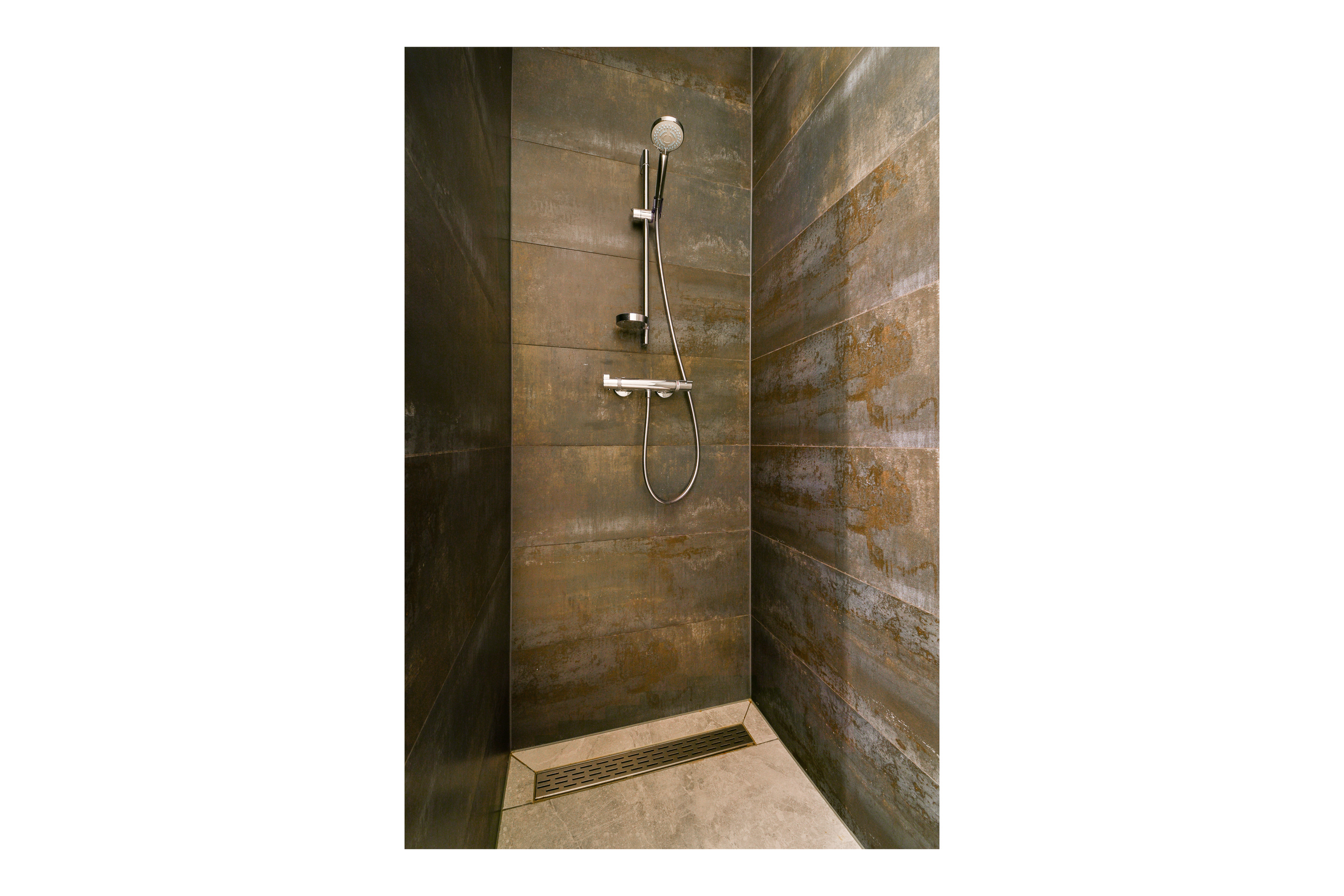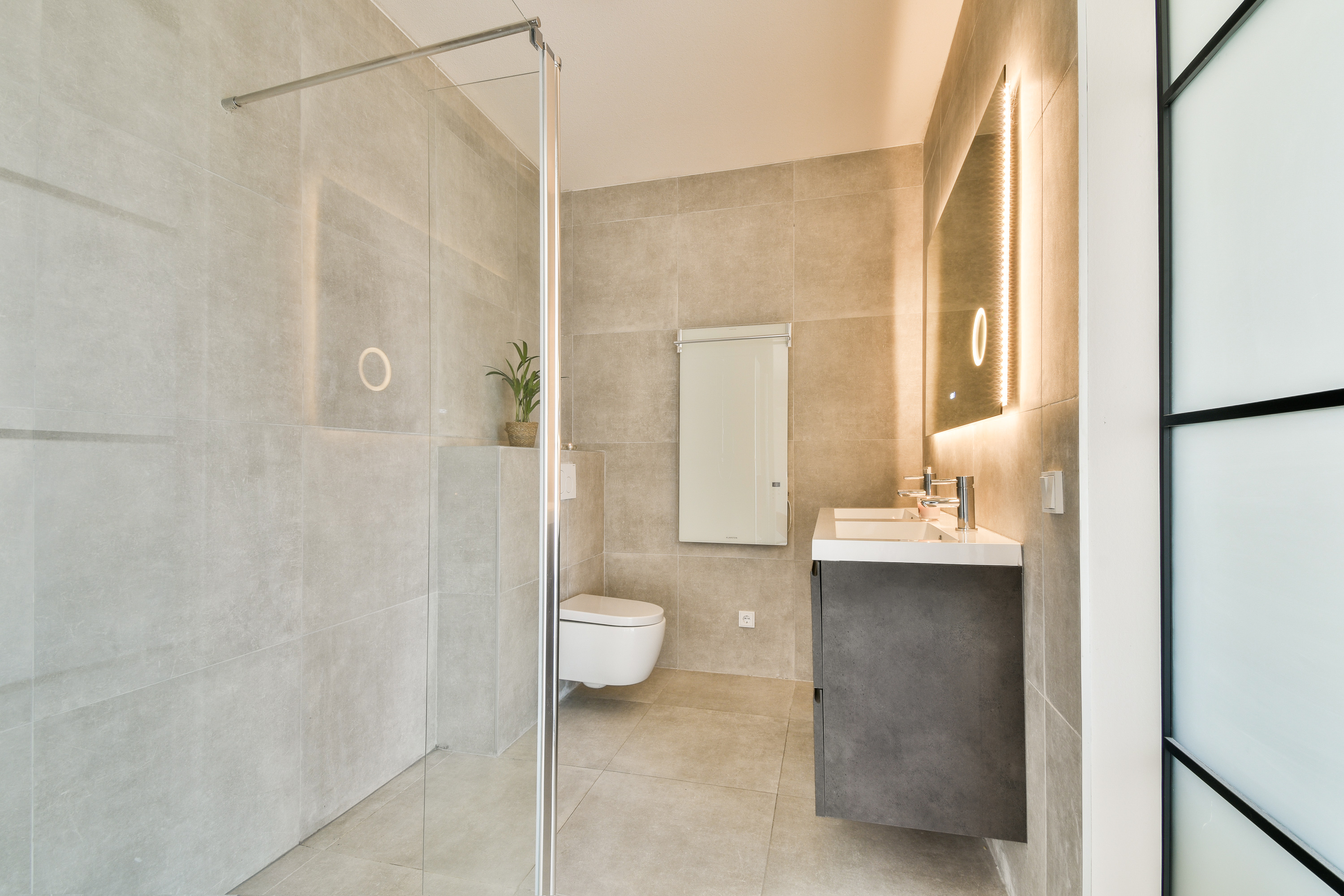 De luxe badkamer is geheel betegeld en voorzien van een inloopdouche (met thermostaatkraan en regendouche), een zwevend closet en een dubbele wastafel. Een infrarood verwarmingspaneel zorgt voor net wat meer comfort.