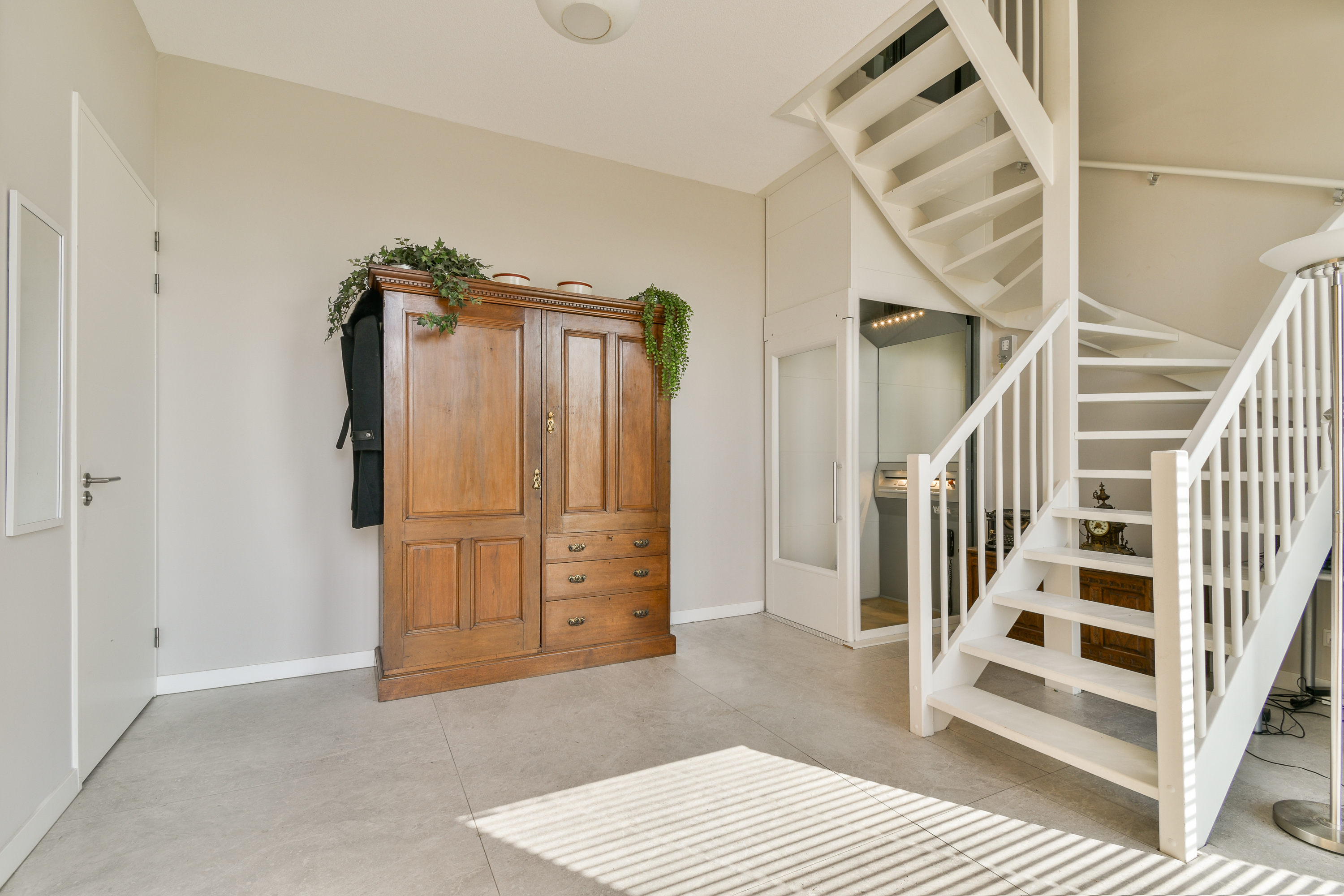 Entree in royale hal met trapopgang, toegang tot de lift, inpandige berging en de toiletruimte.