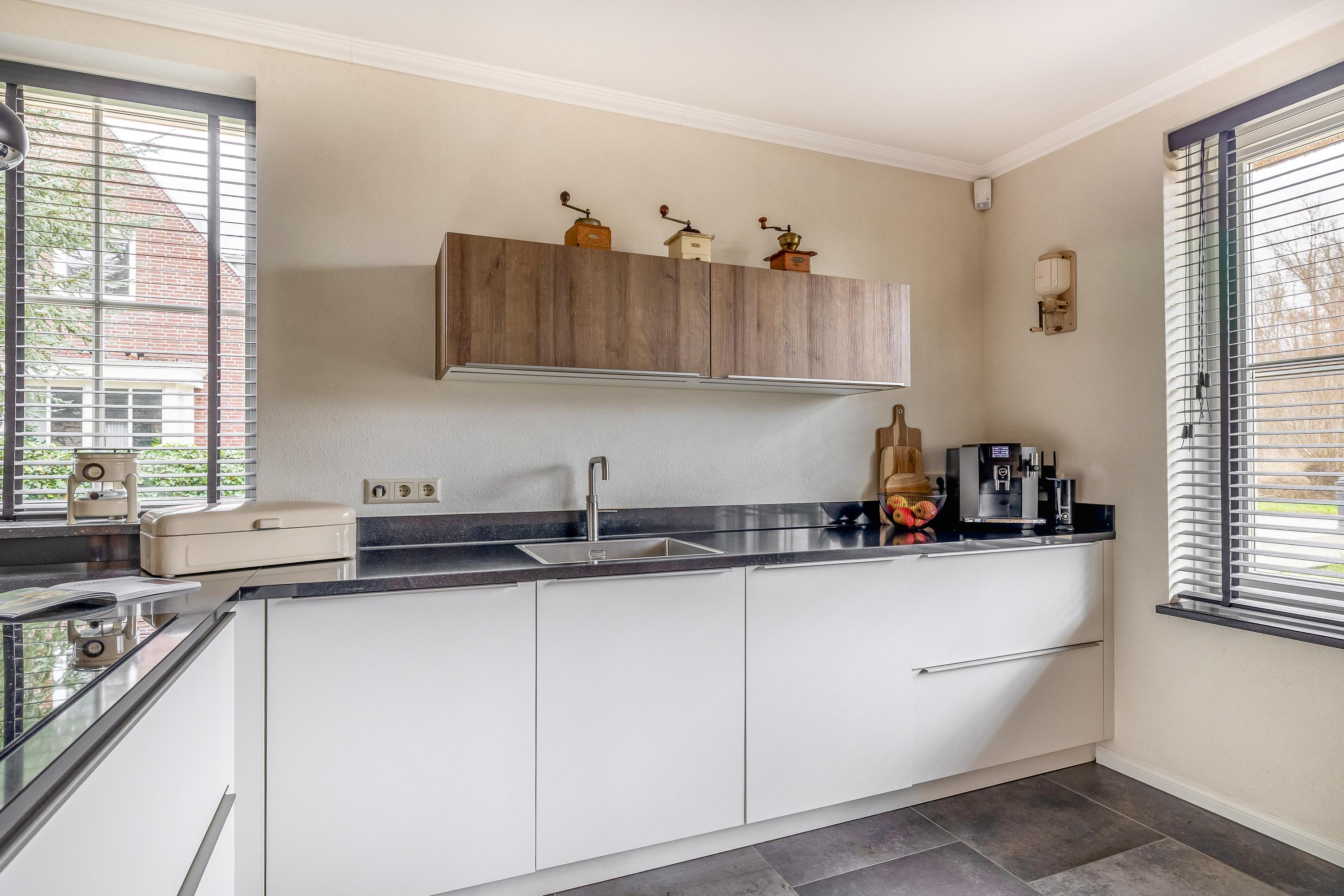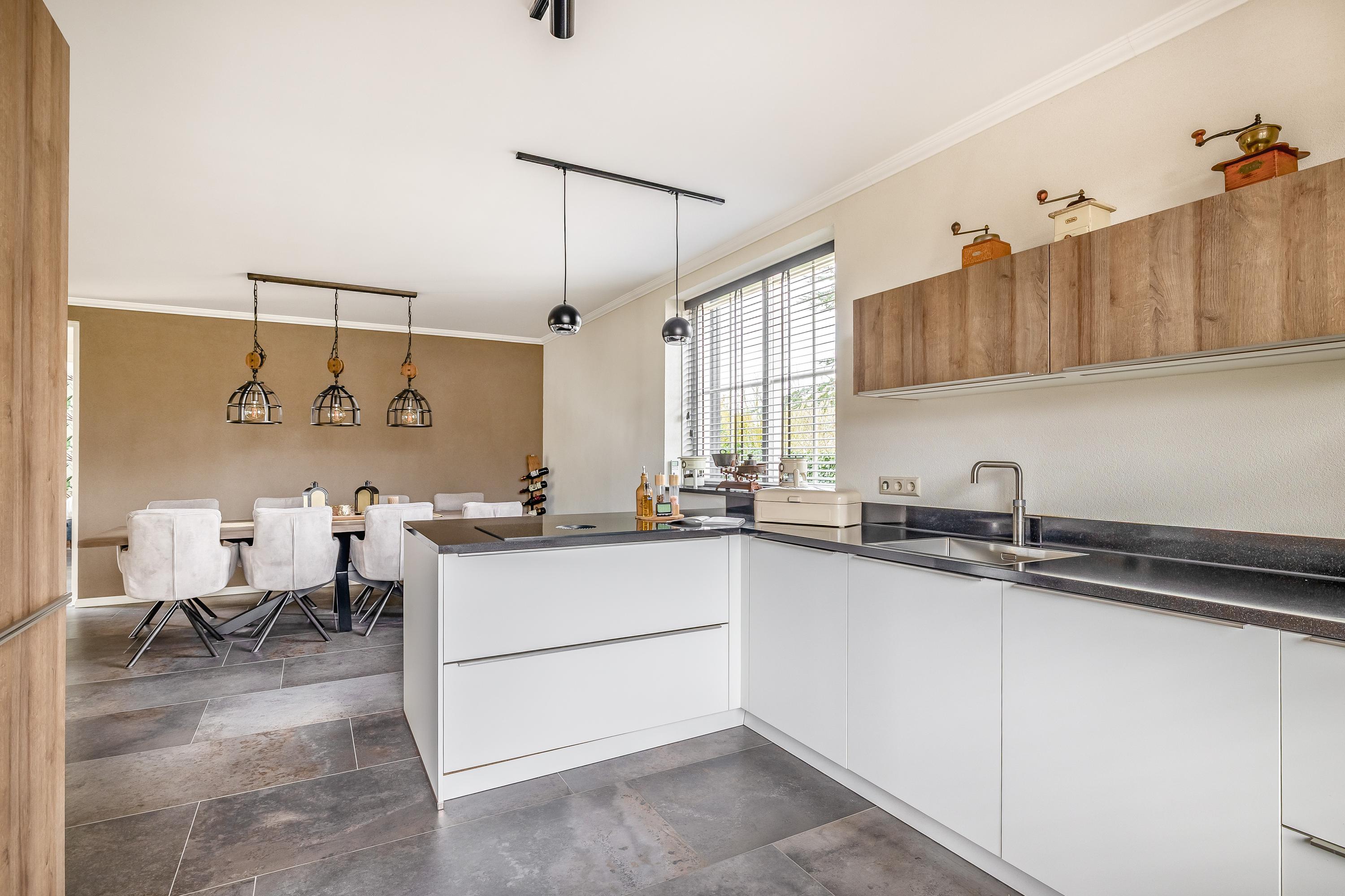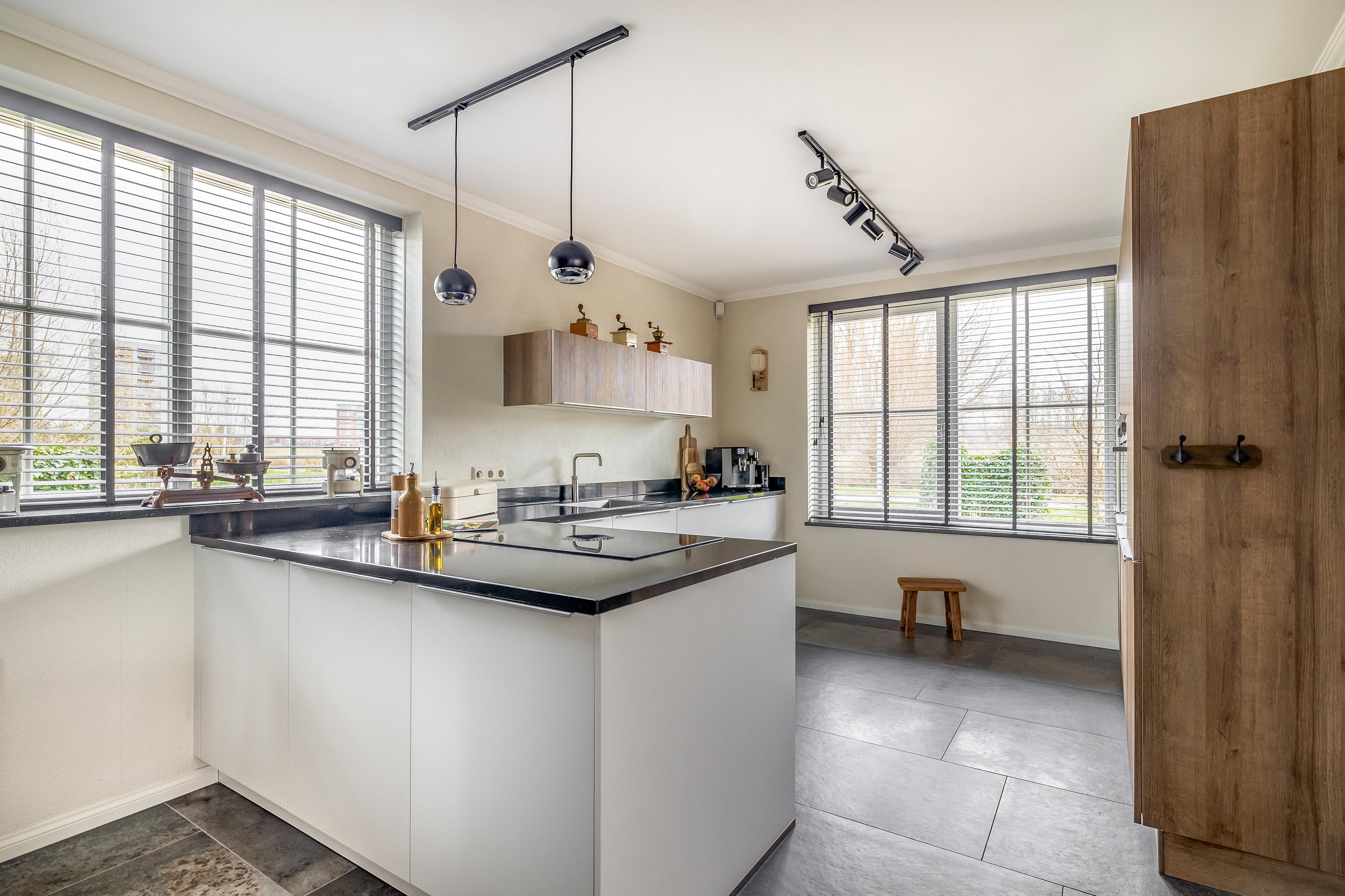 Via de stijlvolle entree kom je binnen in een ruime hal met vernieuwd zwevend toilet en fonteintje. Dubbele deuren leiden naar de zeer royale living, die in 2022 volledig is verbouwd. De leefruimte bestaat uit een luxe woonkeuken, eetkamer en zithoek met erker en openslaande deuren naar het terras. De moderne keuken is van alle gemakken voorzien: een inductiekookplaat met Bora-afzuiging, 2 identieke combi-ovens, grote koelkast en vriezer, vaatwasser, Quooker en een composiet werkblad. In de bijkeuken vind je aansluitingen voor wasmachine en droger en een deur naar buiten. Dankzij de grote raampartijen en de erker met openslaande deuren valt het daglicht rijkelijk binnen. De sfeervolle gashaard en inbouwspots maken het plaatje compleet. Op de begane grond bevindt zich verder een ruime slaapkamer met maatwerkkasten en een luxe badkamer ensuite (2022) met inloopdouche, zwevend toilet, wastafelmeubel en designradiator. Dit maakt gelijkvloers wonen mogelijk zonder in te leveren op comfort.
