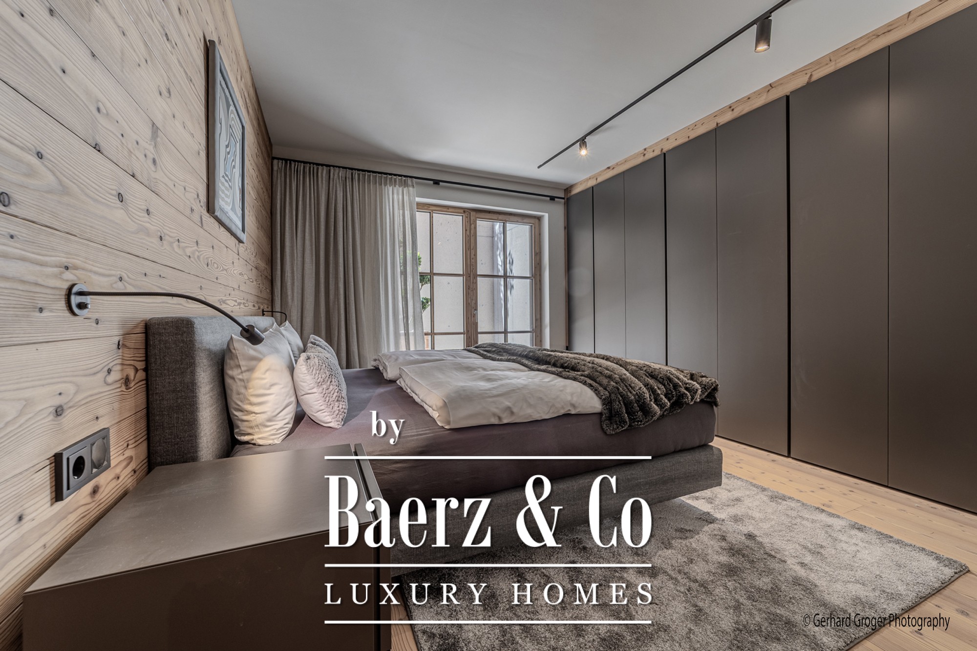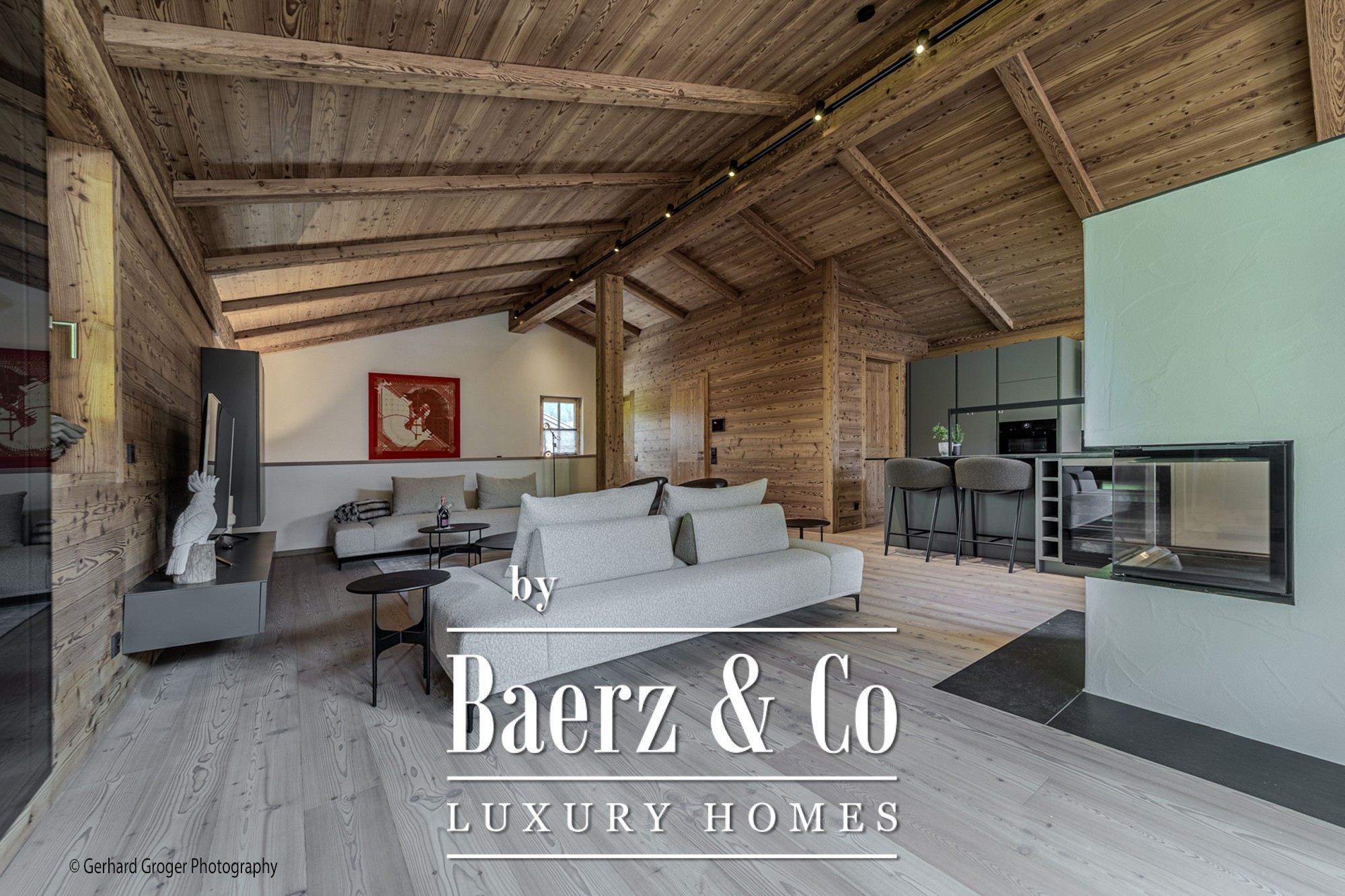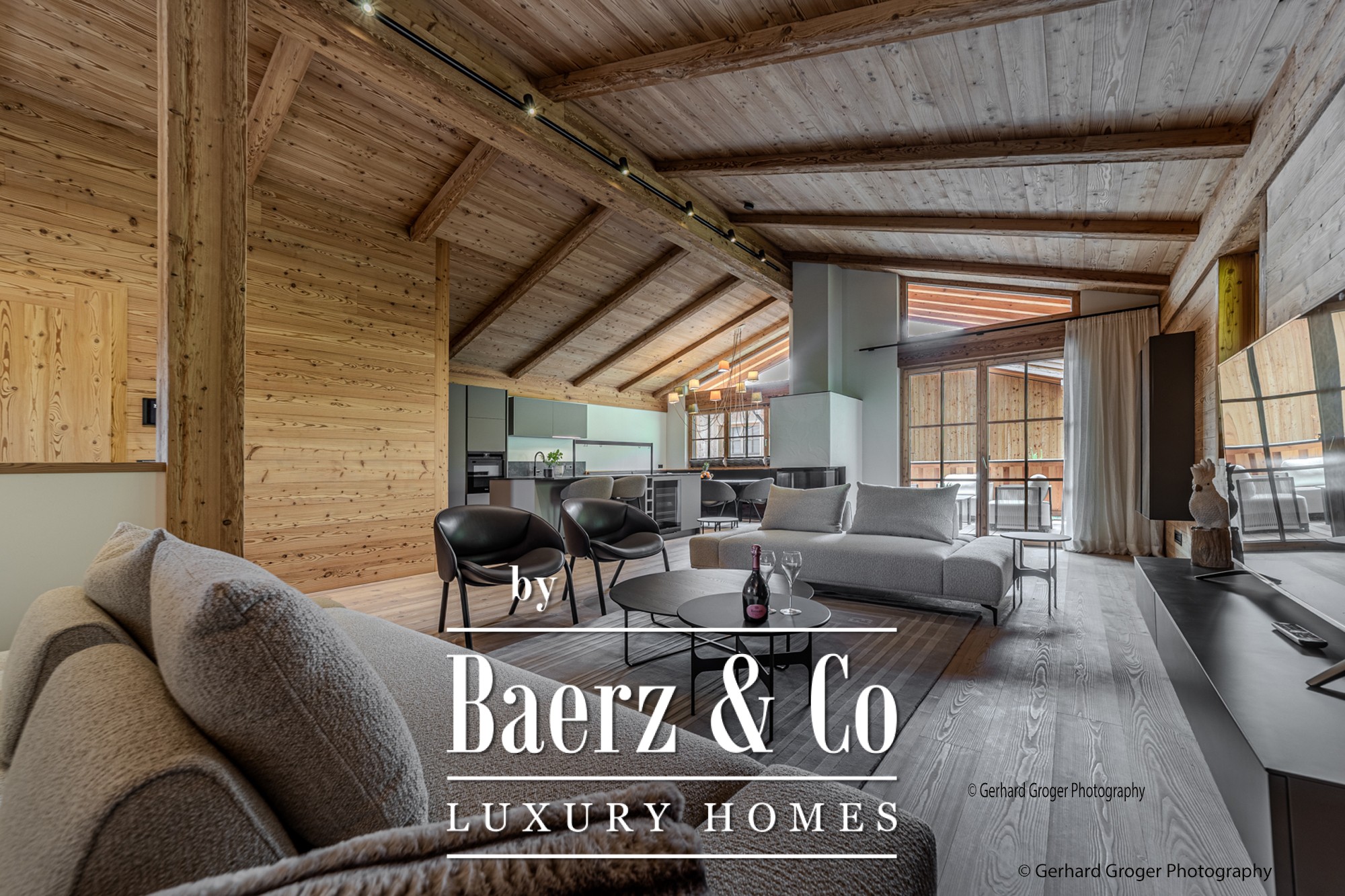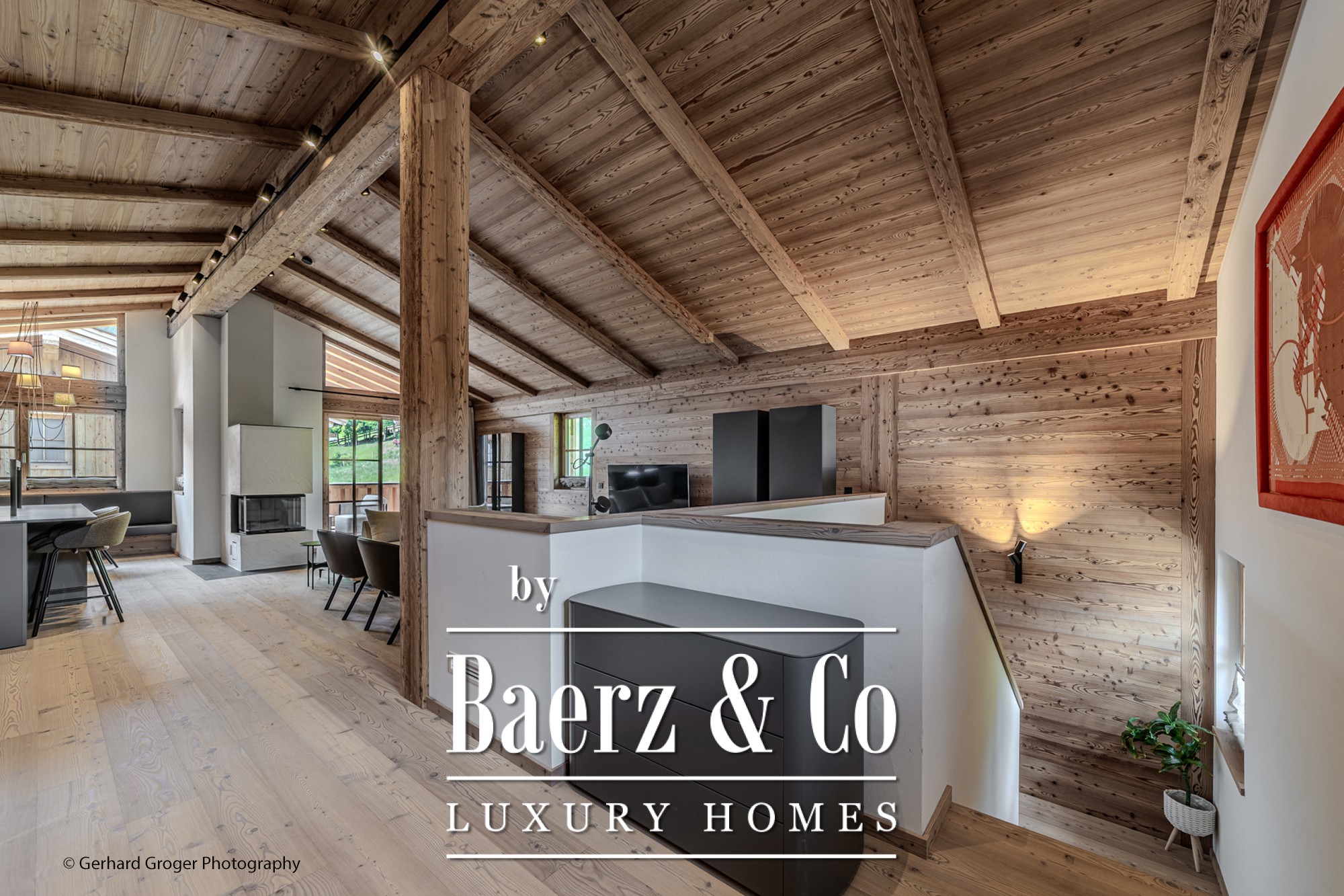 Op de kelderverdieping bevindt zich een privé slaapkamer met en-suite badkamer en een elegante wellnessruimte met sauna. Twee extra slaapkamers met eigen badkamers zijn gesitueerd op de begane grond, waardoor gezinsleden en gasten optimaal comfort genieten. De bovenverdieping biedt een lichte woon- en eetkamer, voorzien van een open haard en zichtbare dakspanten, grenzend aan ruime terrassen met panoramisch uitzicht op de Alpen.