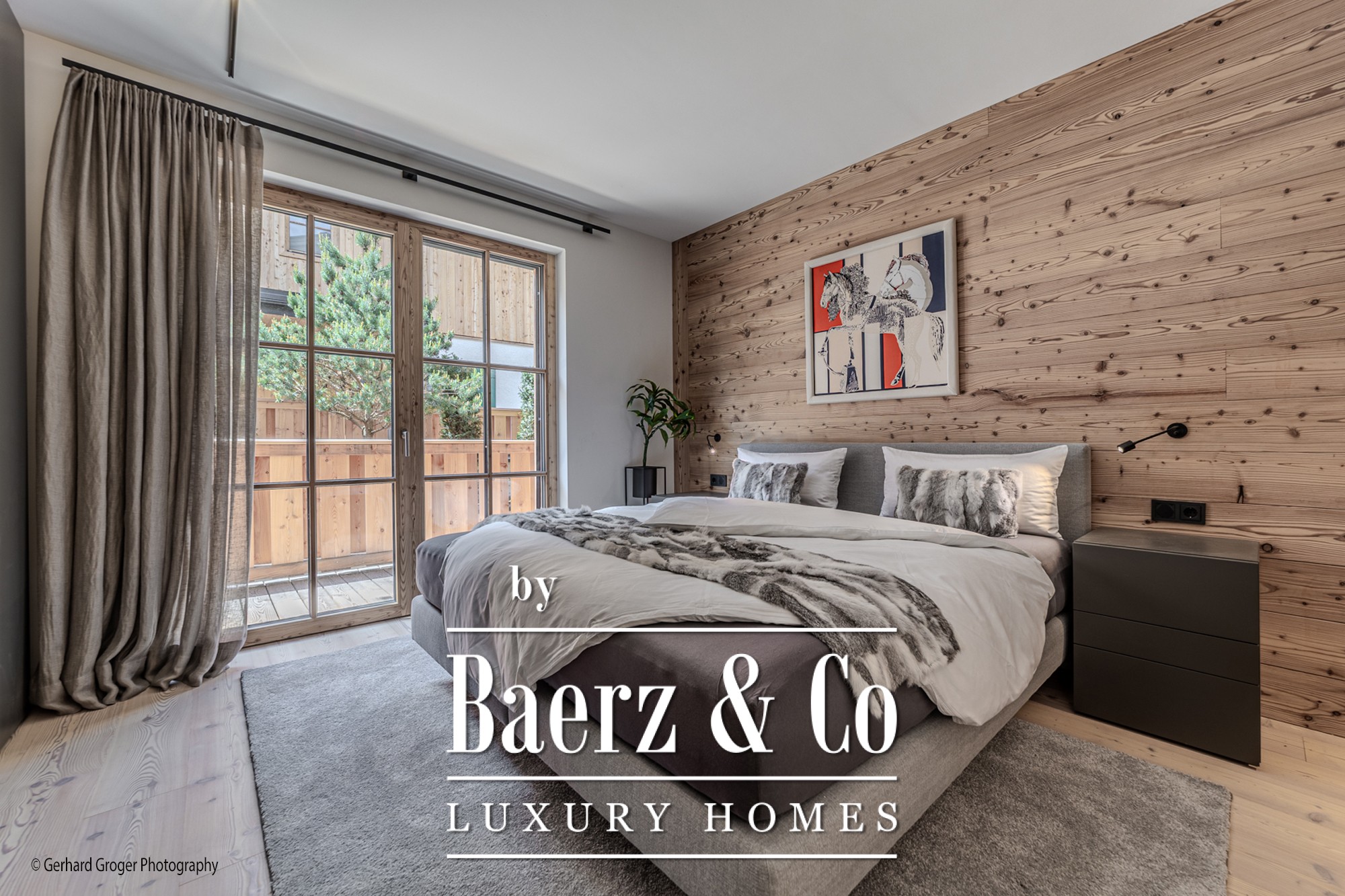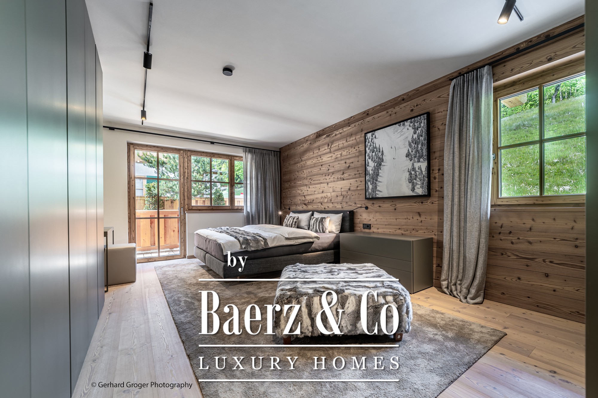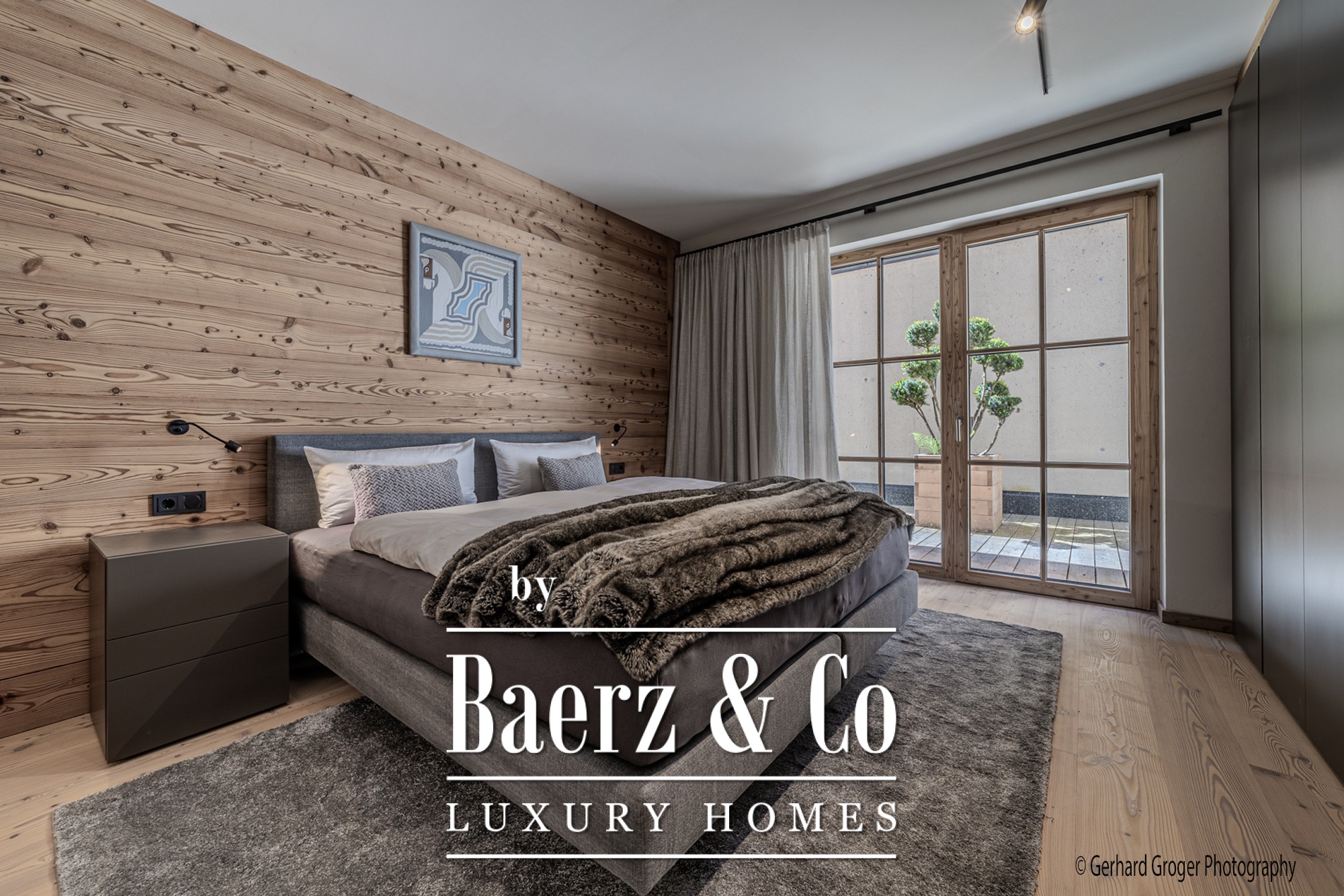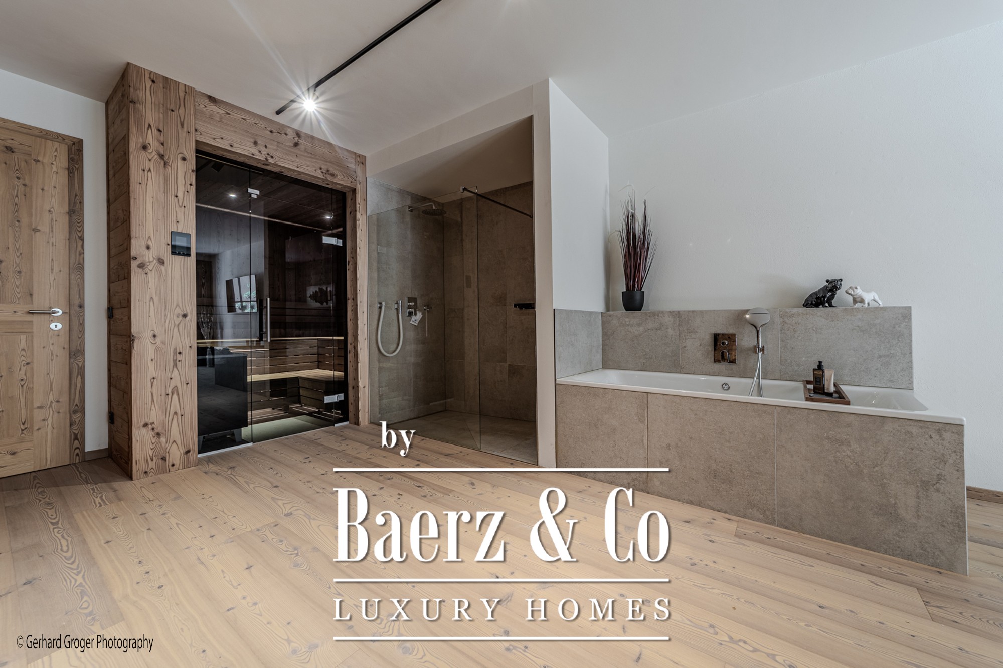 Op de kelderverdieping bevindt zich een privé slaapkamer met en-suite badkamer en een elegante wellnessruimte met sauna. Twee extra slaapkamers met eigen badkamers zijn gesitueerd op de begane grond, waardoor gezinsleden en gasten optimaal comfort genieten. De bovenverdieping biedt een lichte woon- en eetkamer, voorzien van een open haard en zichtbare dakspanten, grenzend aan ruime terrassen met panoramisch uitzicht op de Alpen.