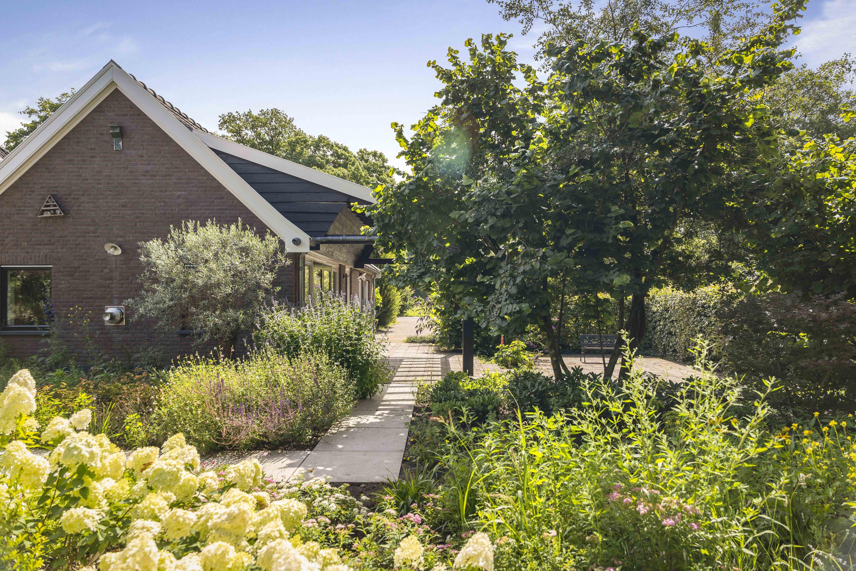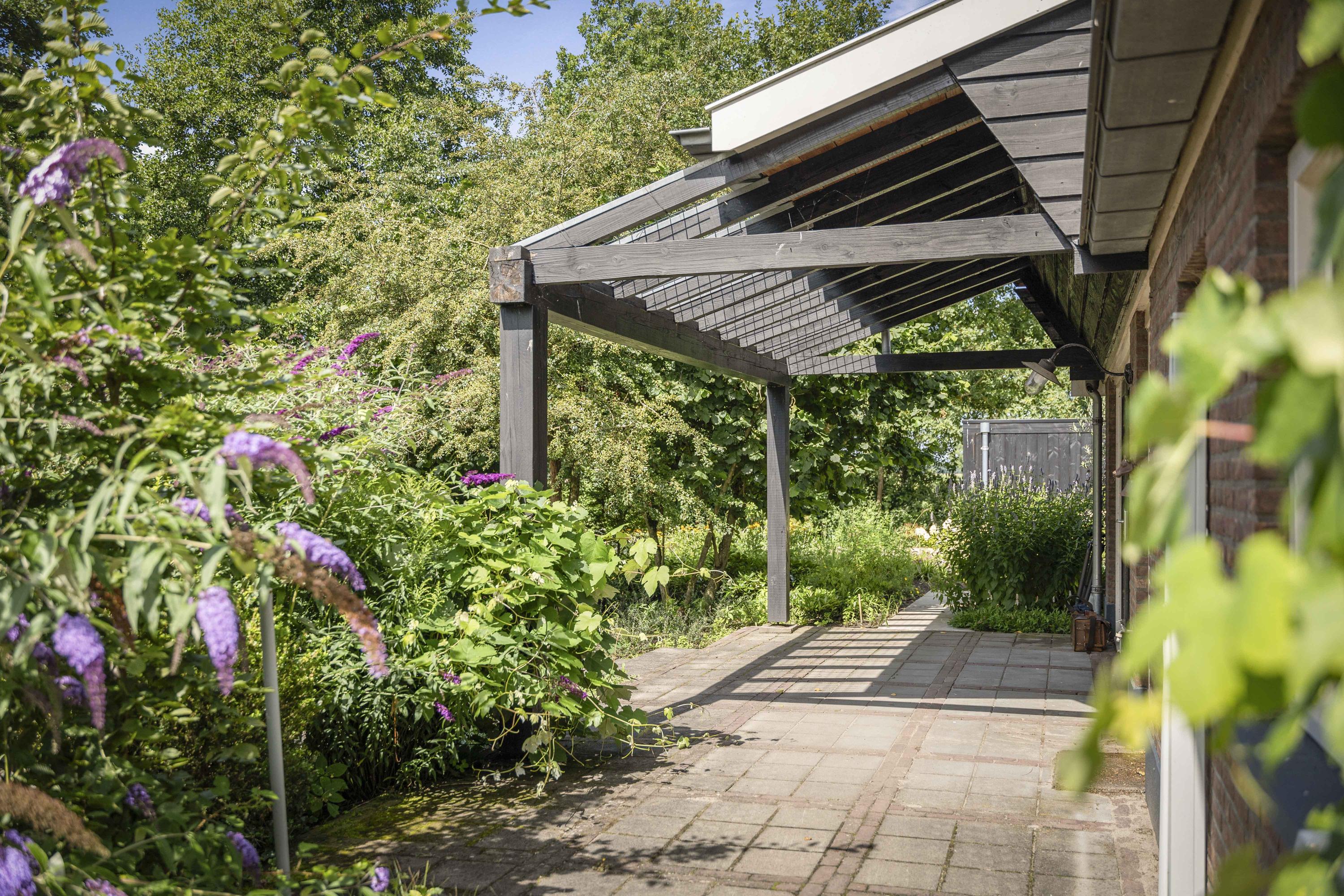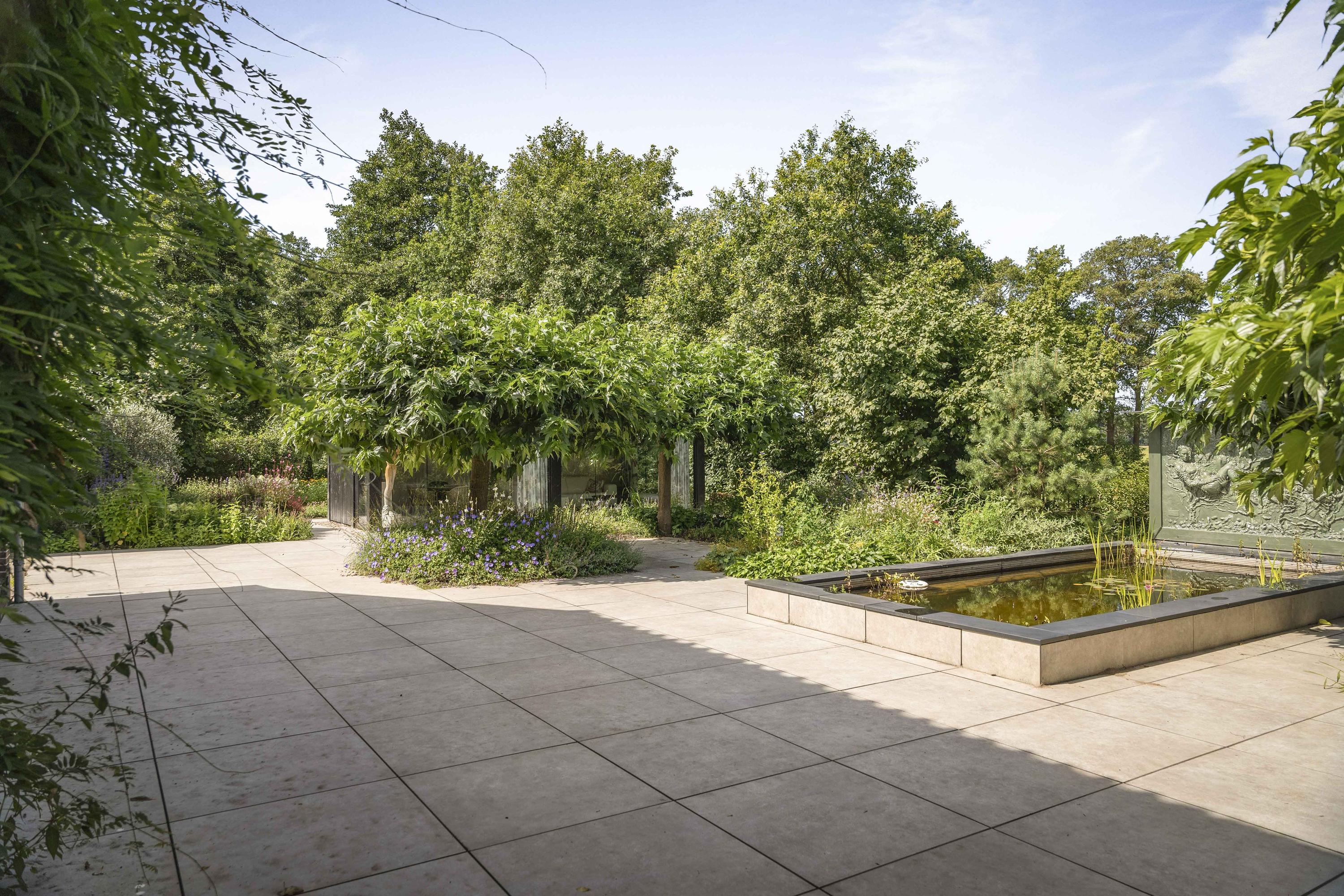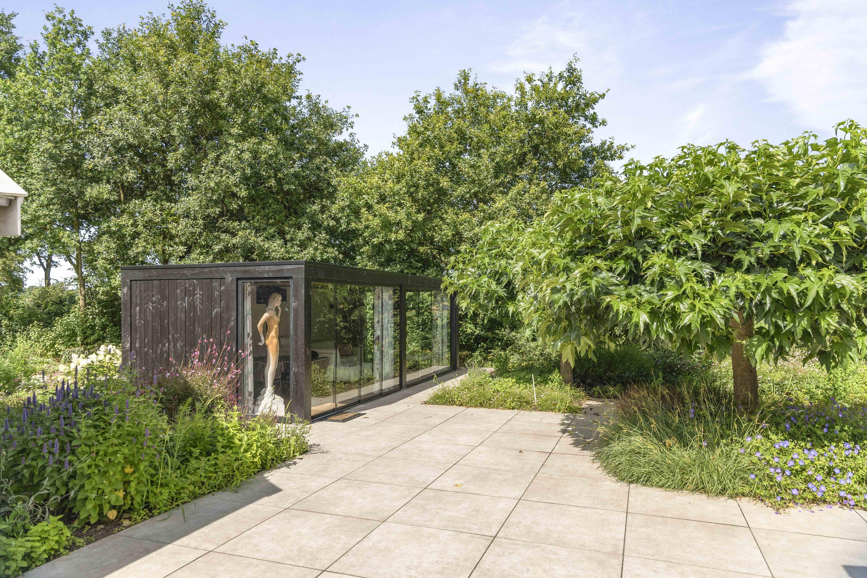 Rondom het huis is een prachtig terras aangelegd, met ruimte voor lange tafels en zonnige zomeravonden vol gezelligheid. In de tuin is overal wel een zitje te vinden. De elegante vijver met gebeeldhouwde friezen is een markant punt in de tuin. Verderop vinden we de sauna met buitendouche (warm/koud water) en kantelemmer en de design-ingerichte tuinkamer inclusief pantry met koel- en wijnkast die – zowel geopend als afgesloten – het hele jaar een heerlijke plek biedt om te chillen.