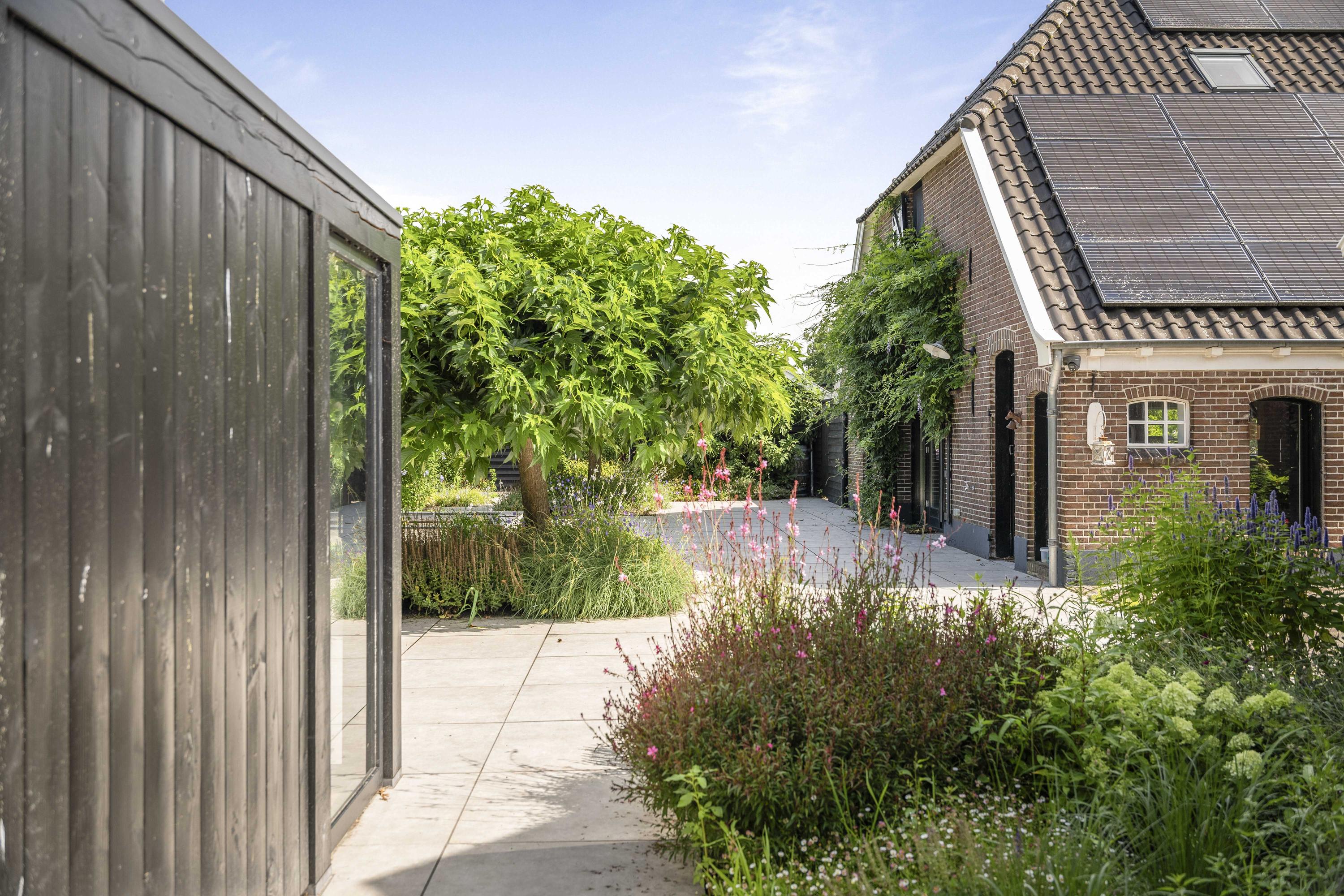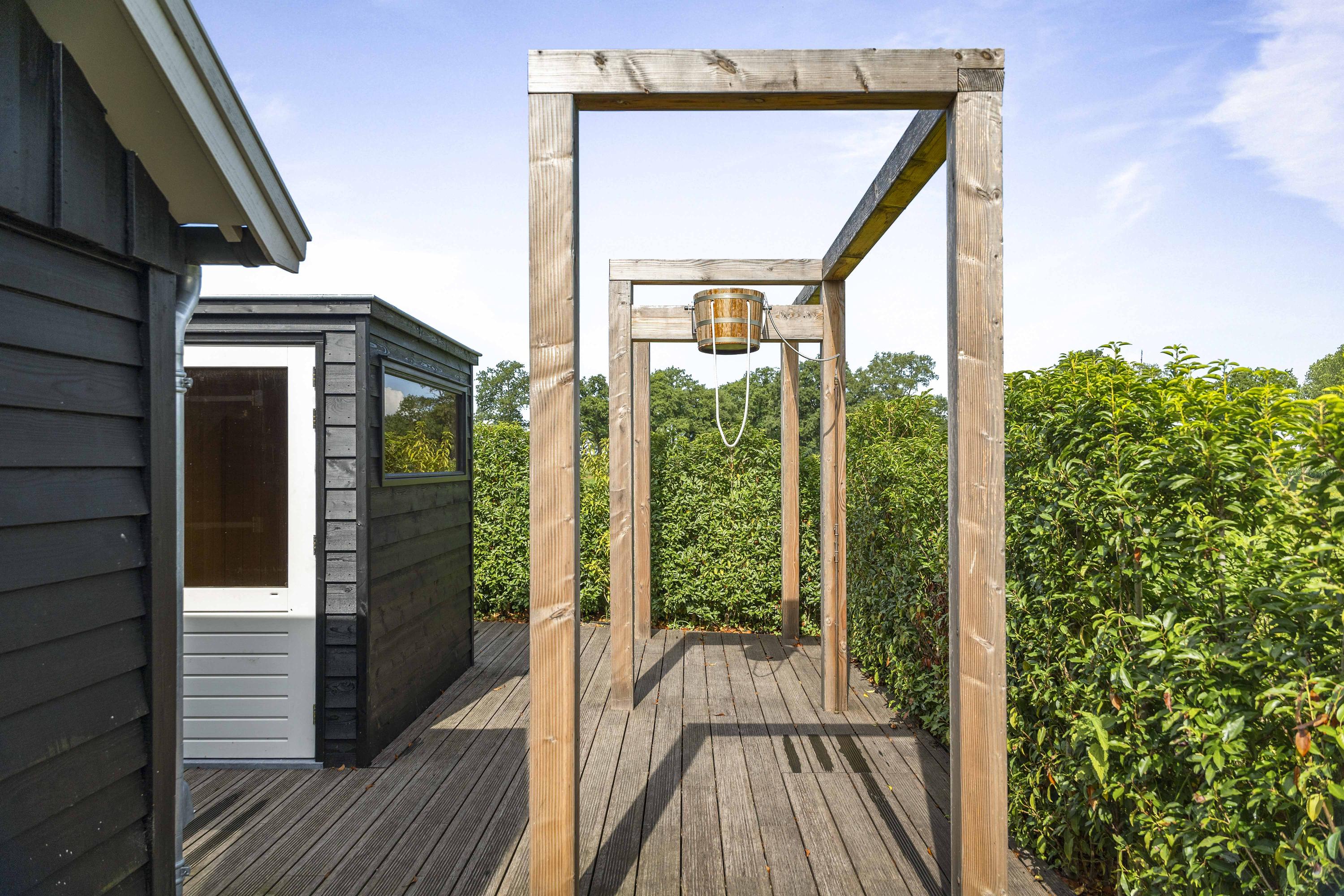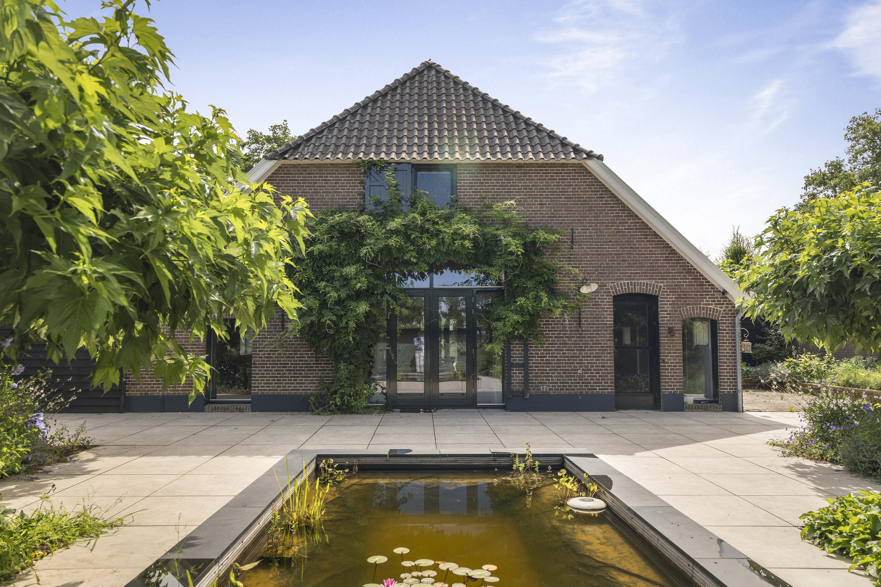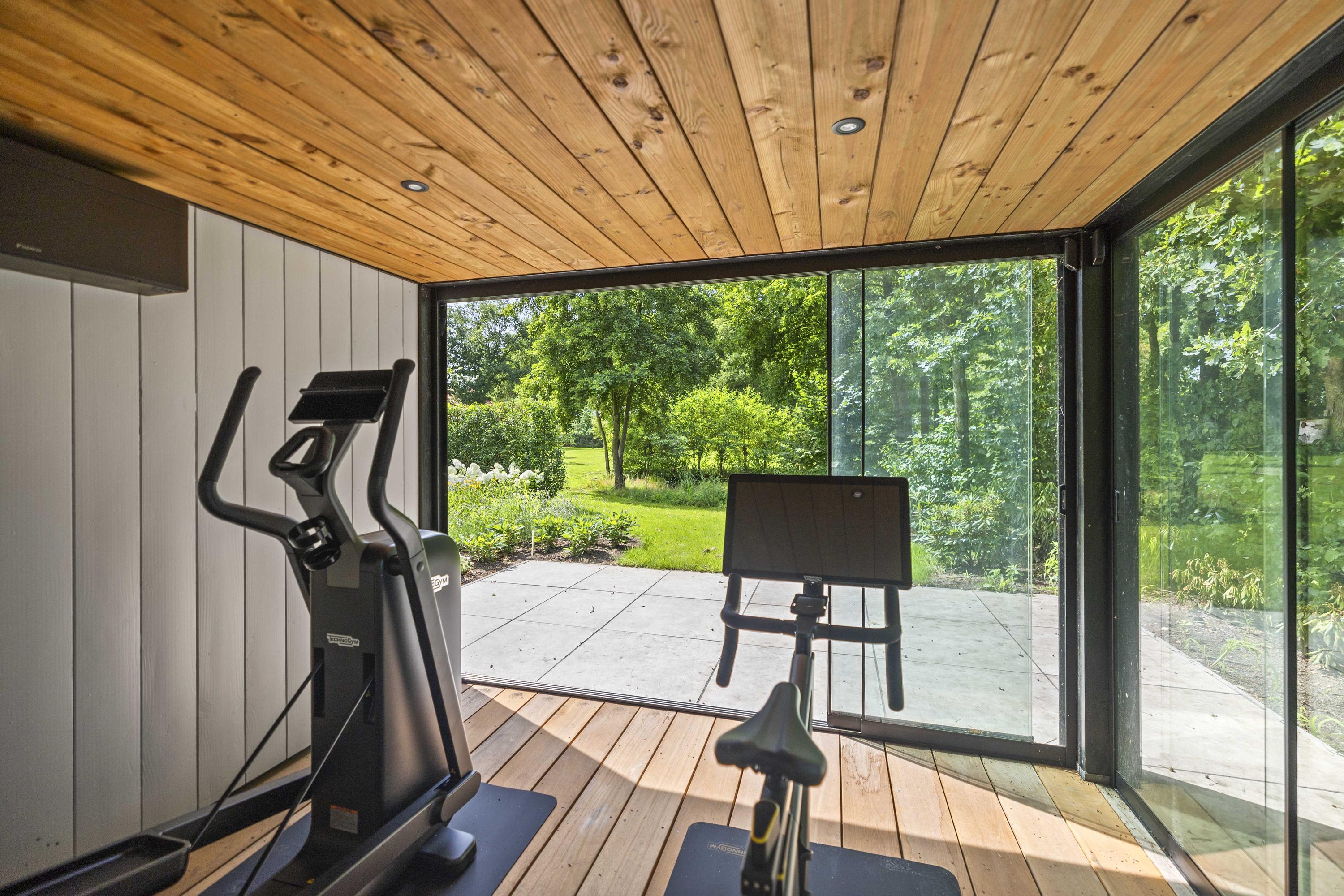 Rondom het huis is een prachtig terras aangelegd, met ruimte voor lange tafels en zonnige zomeravonden vol gezelligheid. In de tuin is overal wel een zitje te vinden. De elegante vijver met gebeeldhouwde friezen is een markant punt in de tuin. Verderop vinden we de sauna met buitendouche (warm/koud water) en kantelemmer en de design-ingerichte tuinkamer inclusief pantry met koel- en wijnkast die – zowel geopend als afgesloten – het hele jaar een heerlijke plek biedt om te chillen.