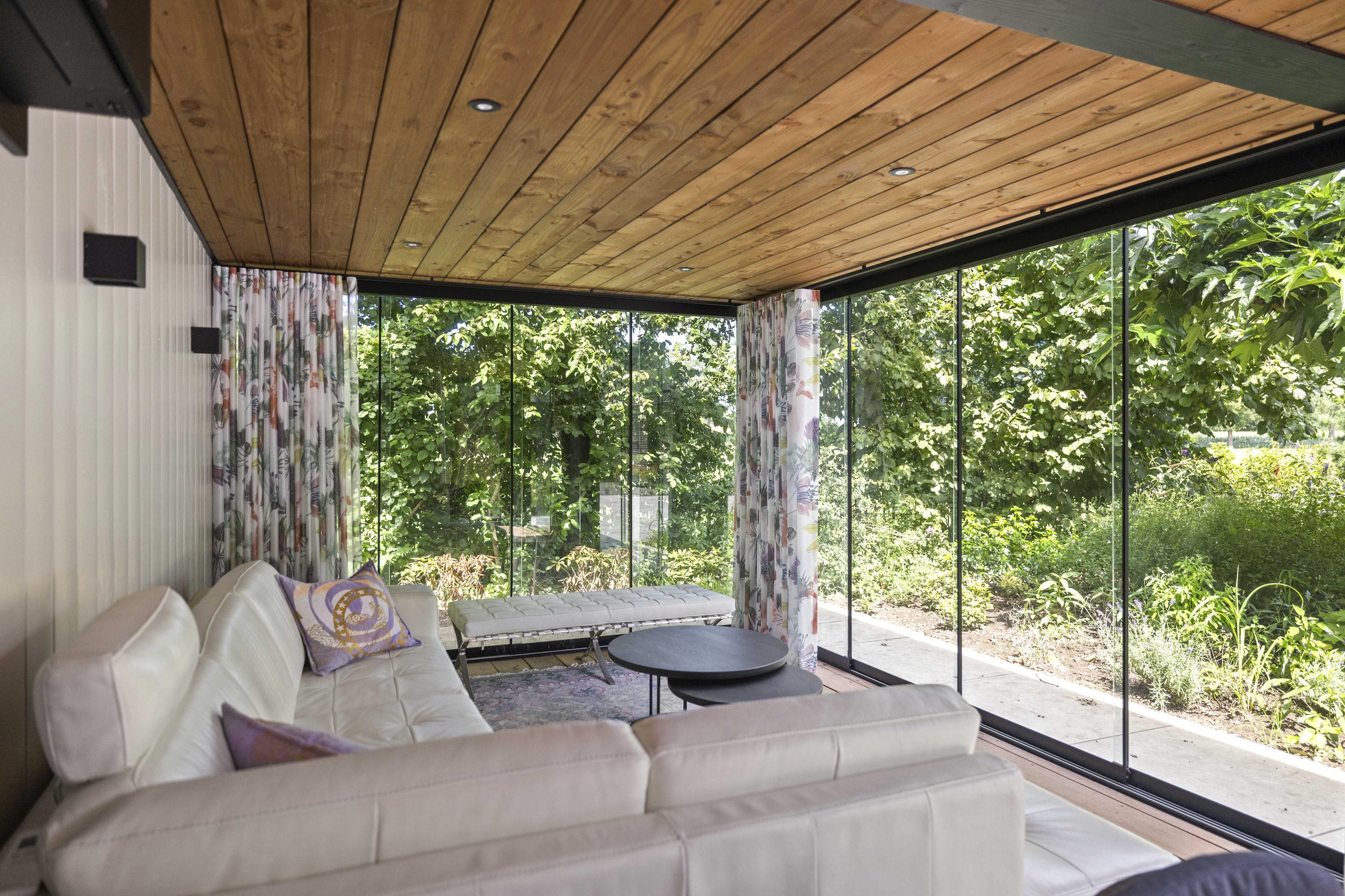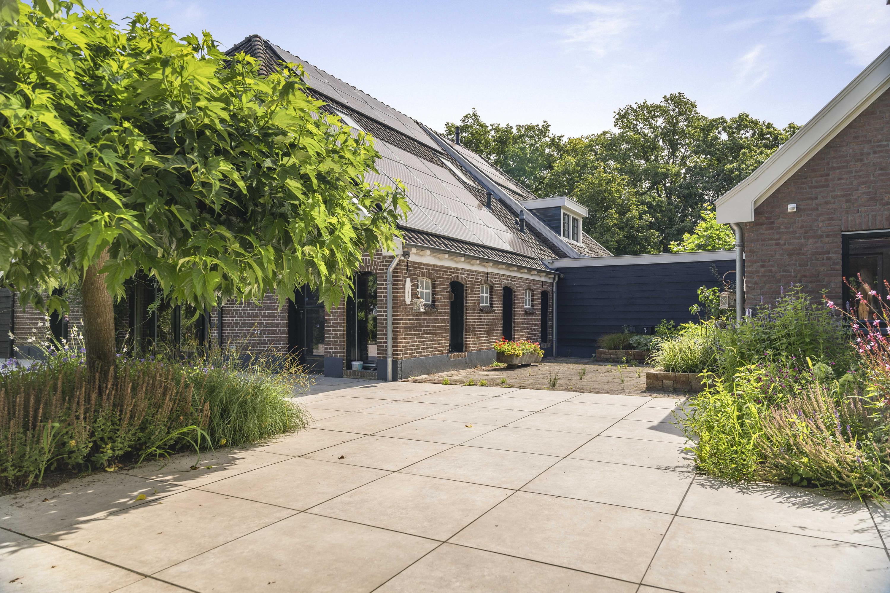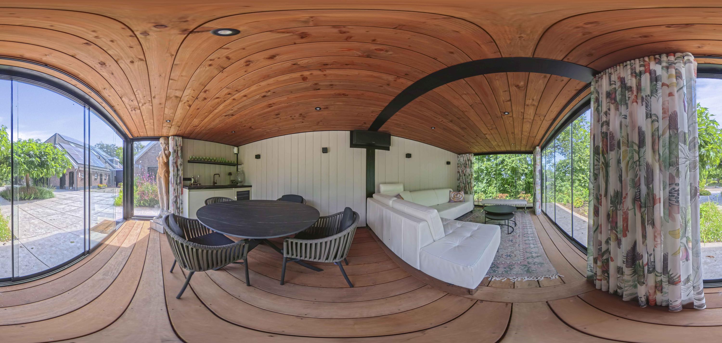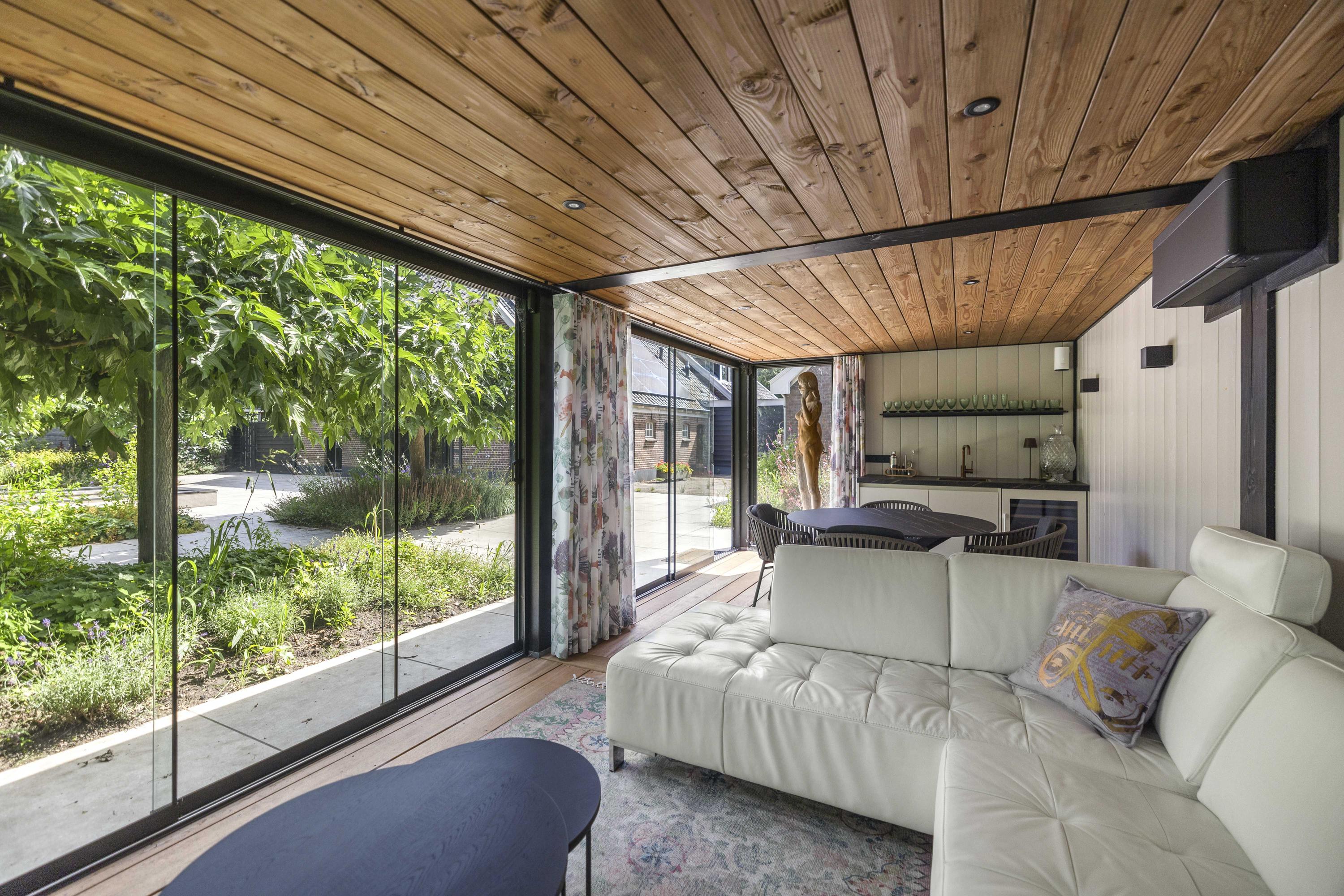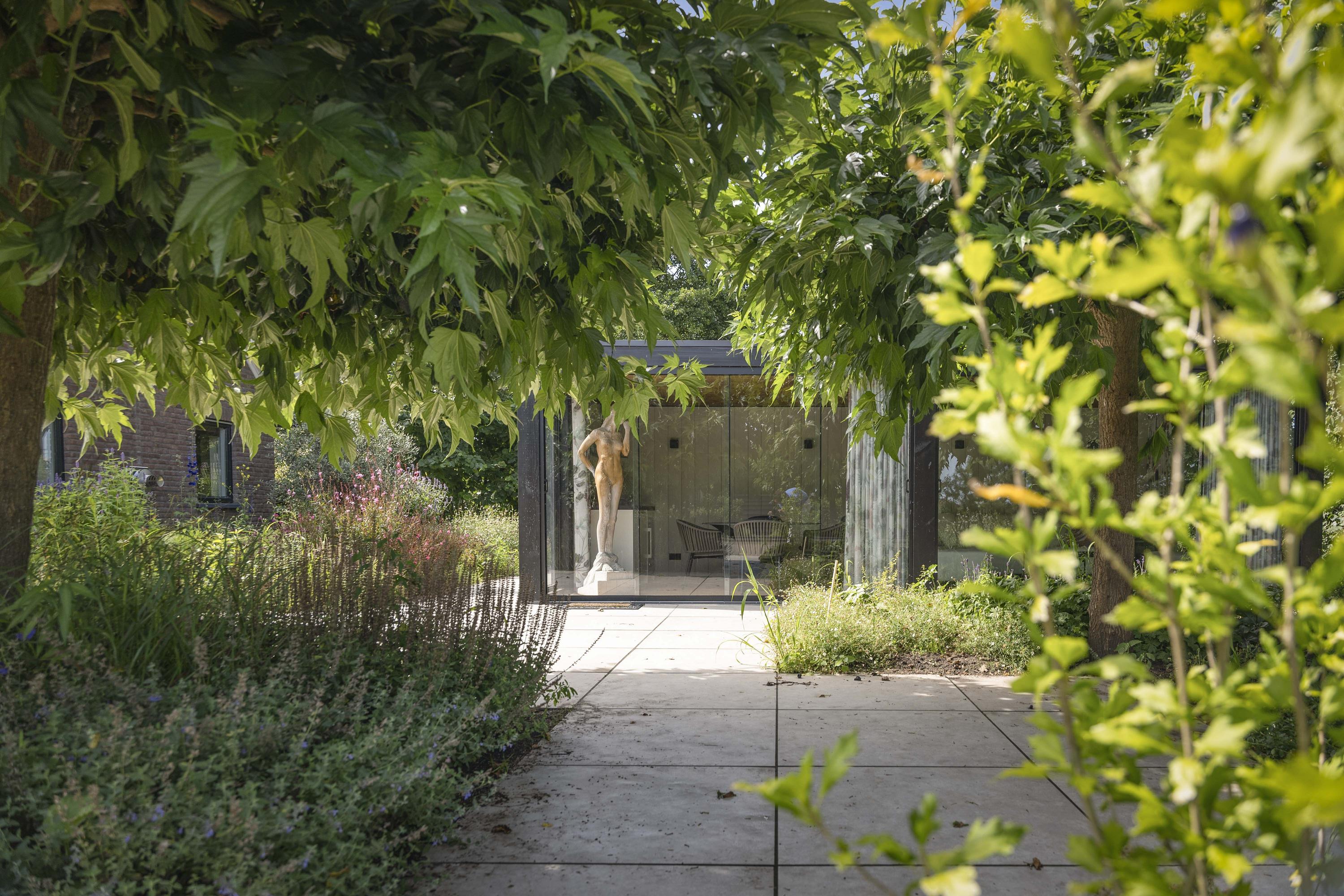 Rondom het huis is een prachtig terras aangelegd, met ruimte voor lange tafels en zonnige zomeravonden vol gezelligheid. In de tuin is overal wel een zitje te vinden. De elegante vijver met gebeeldhouwde friezen is een markant punt in de tuin. Verderop vinden we de sauna met buitendouche (warm/koud water) en kantelemmer en de design-ingerichte tuinkamer inclusief pantry met koel- en wijnkast die – zowel geopend als afgesloten – het hele jaar een heerlijke plek biedt om te chillen.