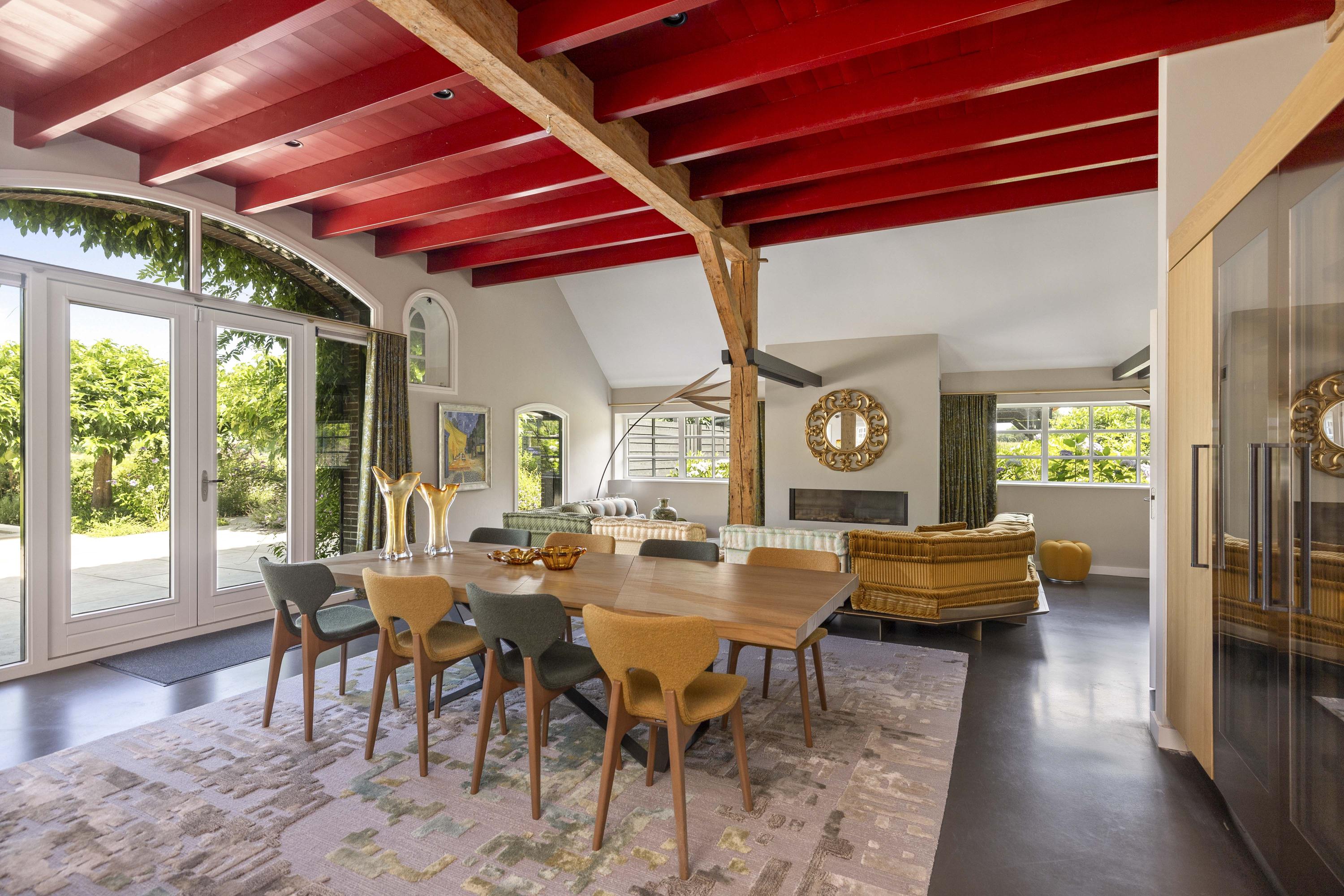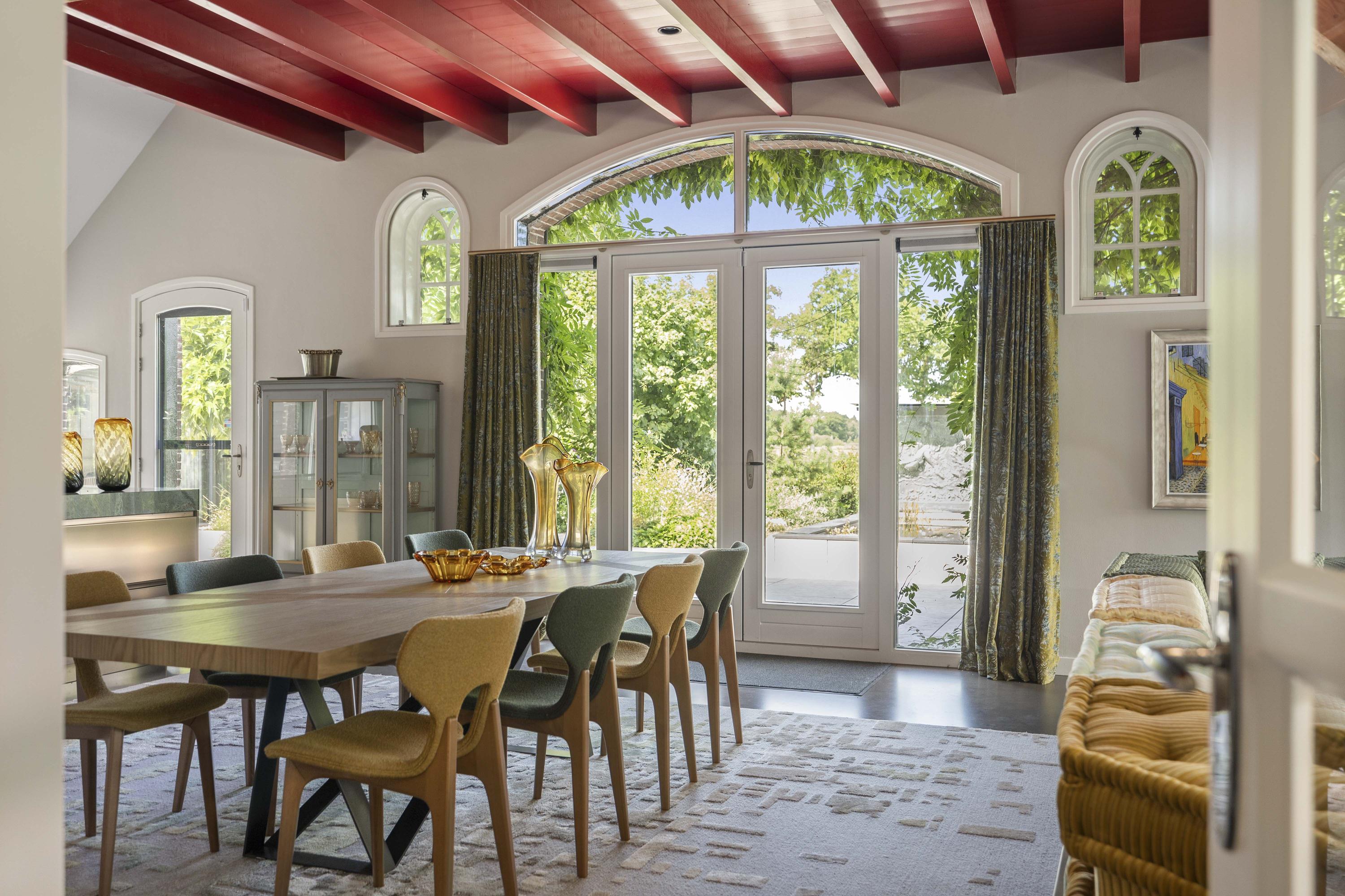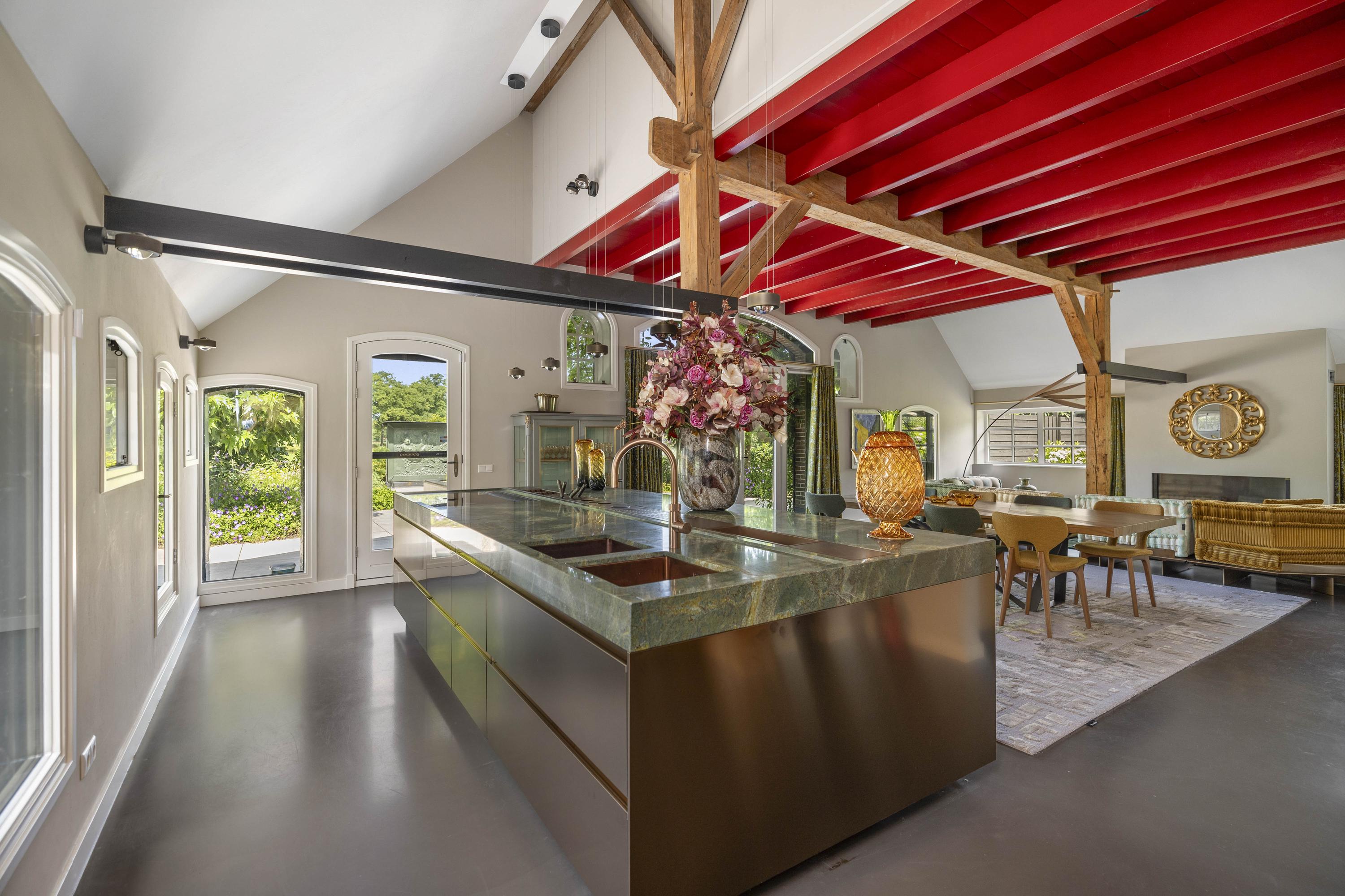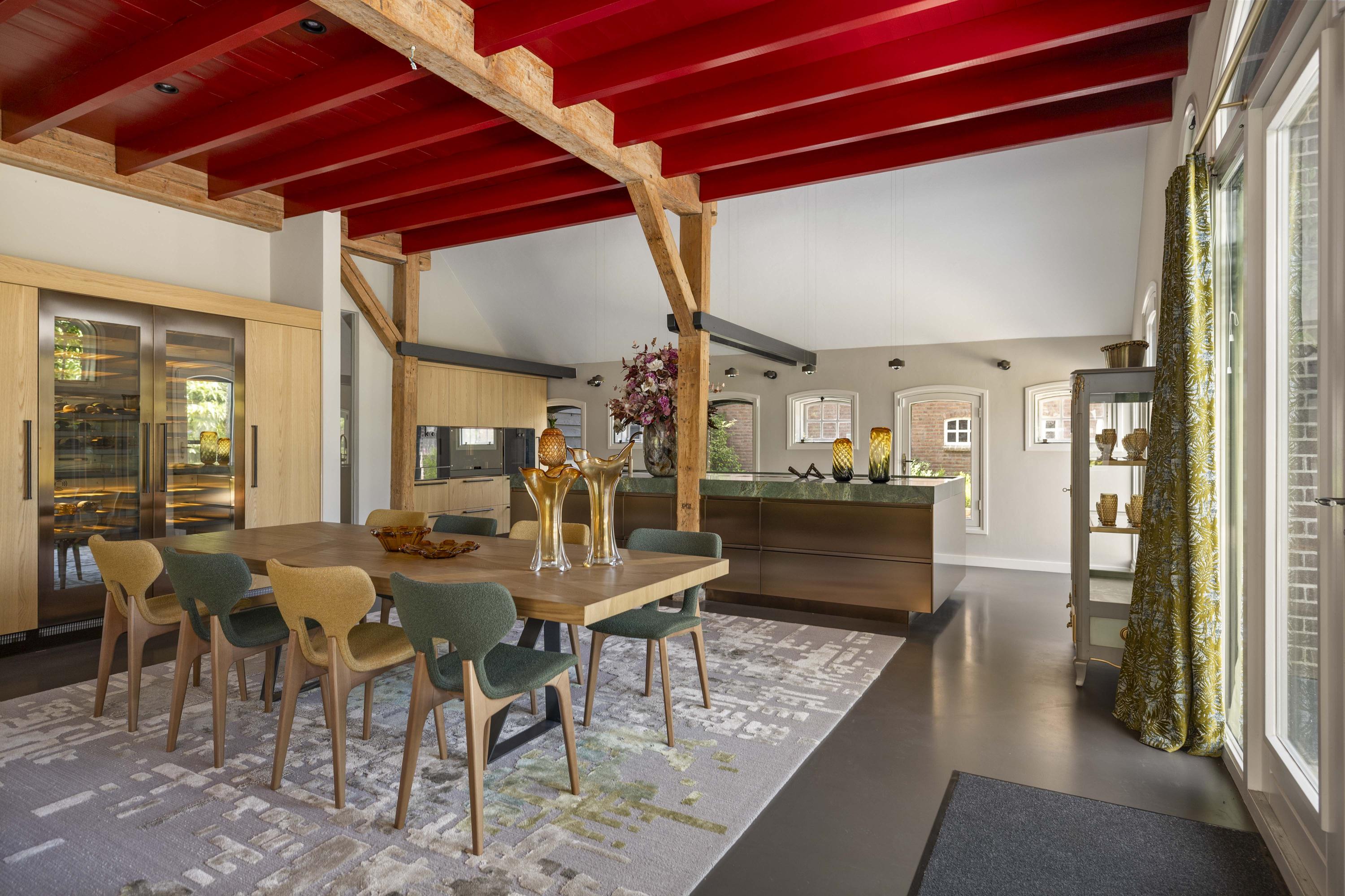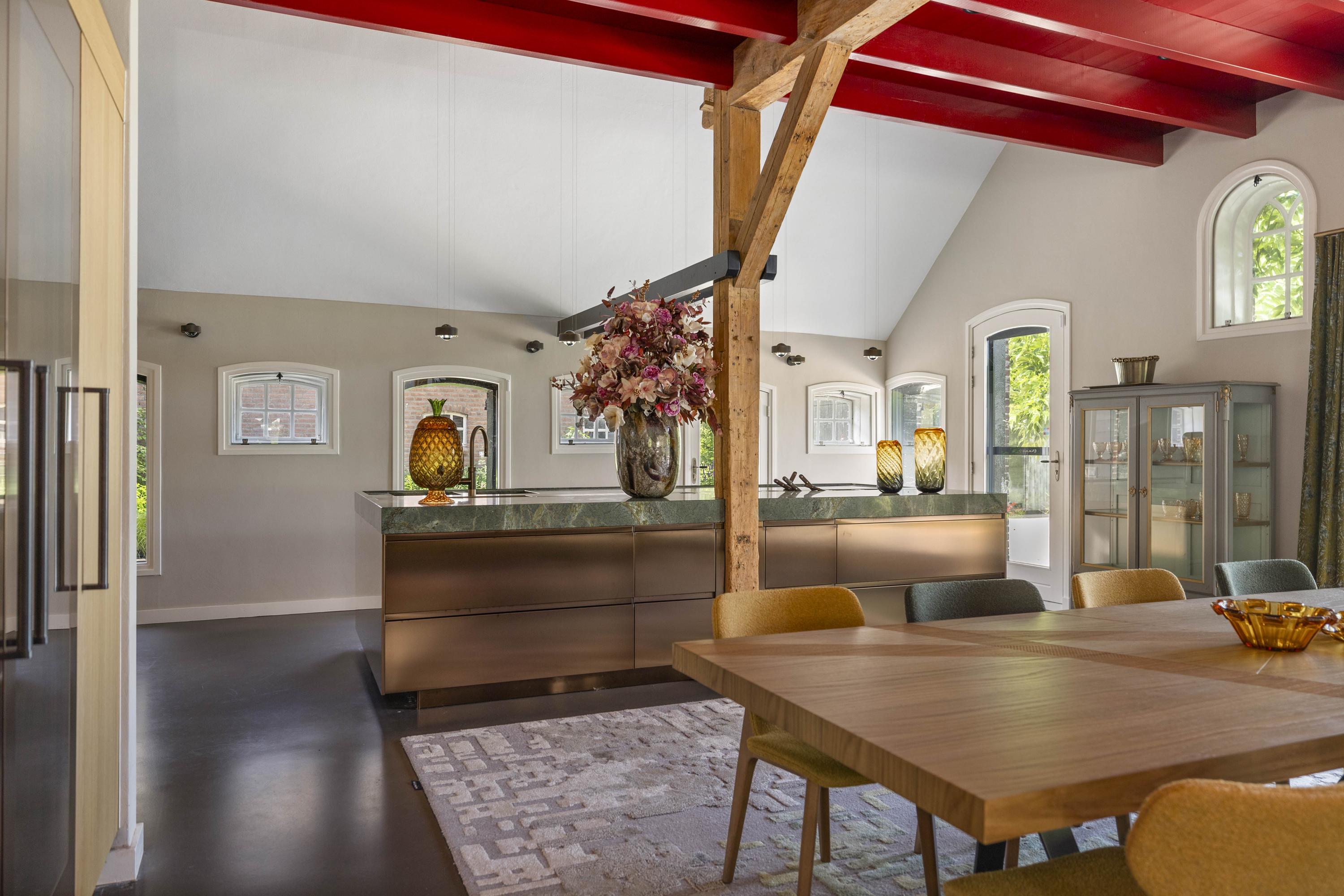 De eetkeuken, die zich in de voormalige deel bevindt, is ruim 70 m² groot en biedt – met de met glas ingevulde deeldeuren – een schitterend uitzicht op de tuin.