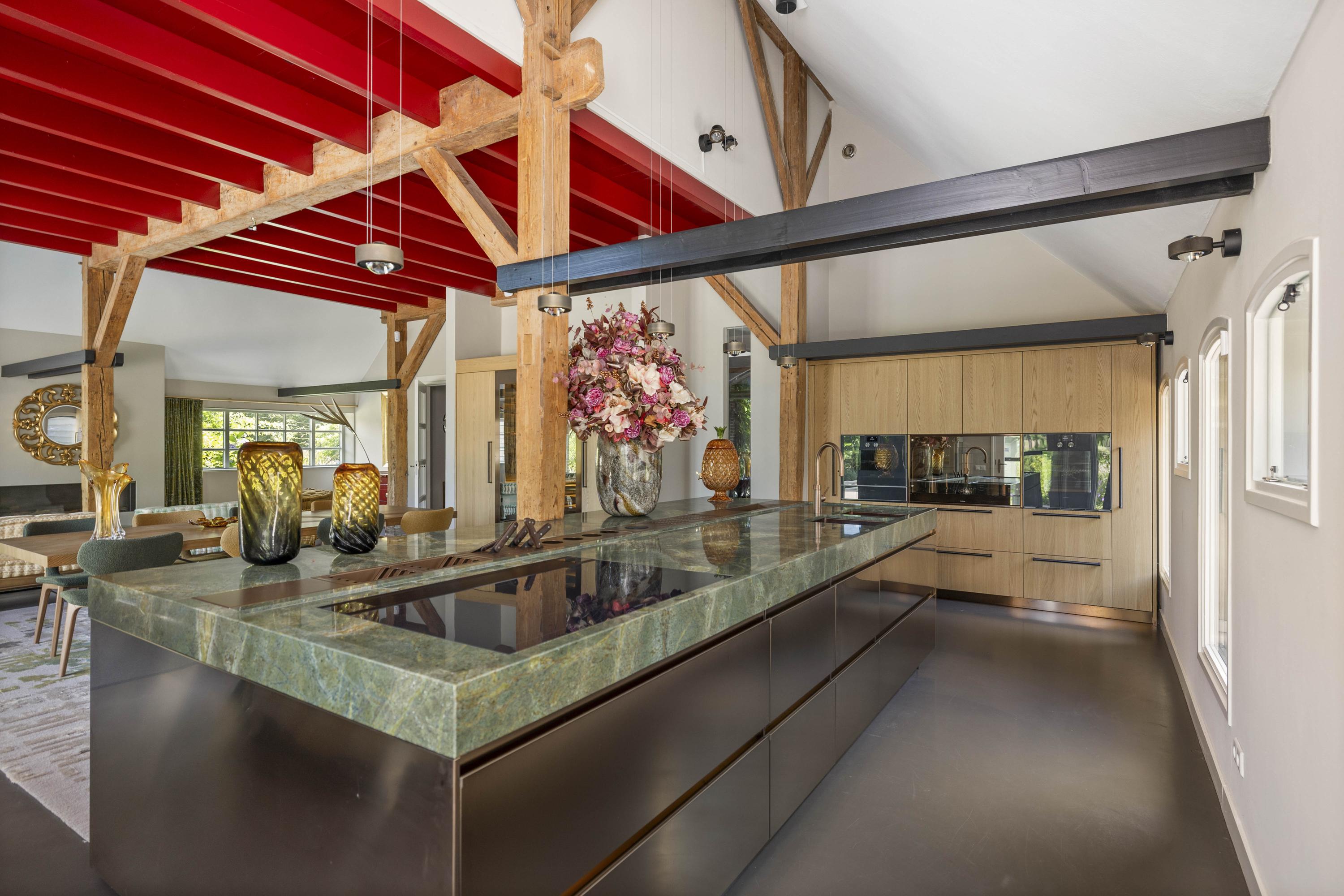 De keuken zelf is een huzarenstukje design en ambacht van de hand van Arclinea, met een spectaculair bronskleurig kookeiland met een werkblad van groen marmer, met een extra brede inductieplaat (Gaggenau) met down-draft afzuiging en een Quooker Cube, verzonken stopcontacten en uiteraard héél veel bergruimte in de laden.
