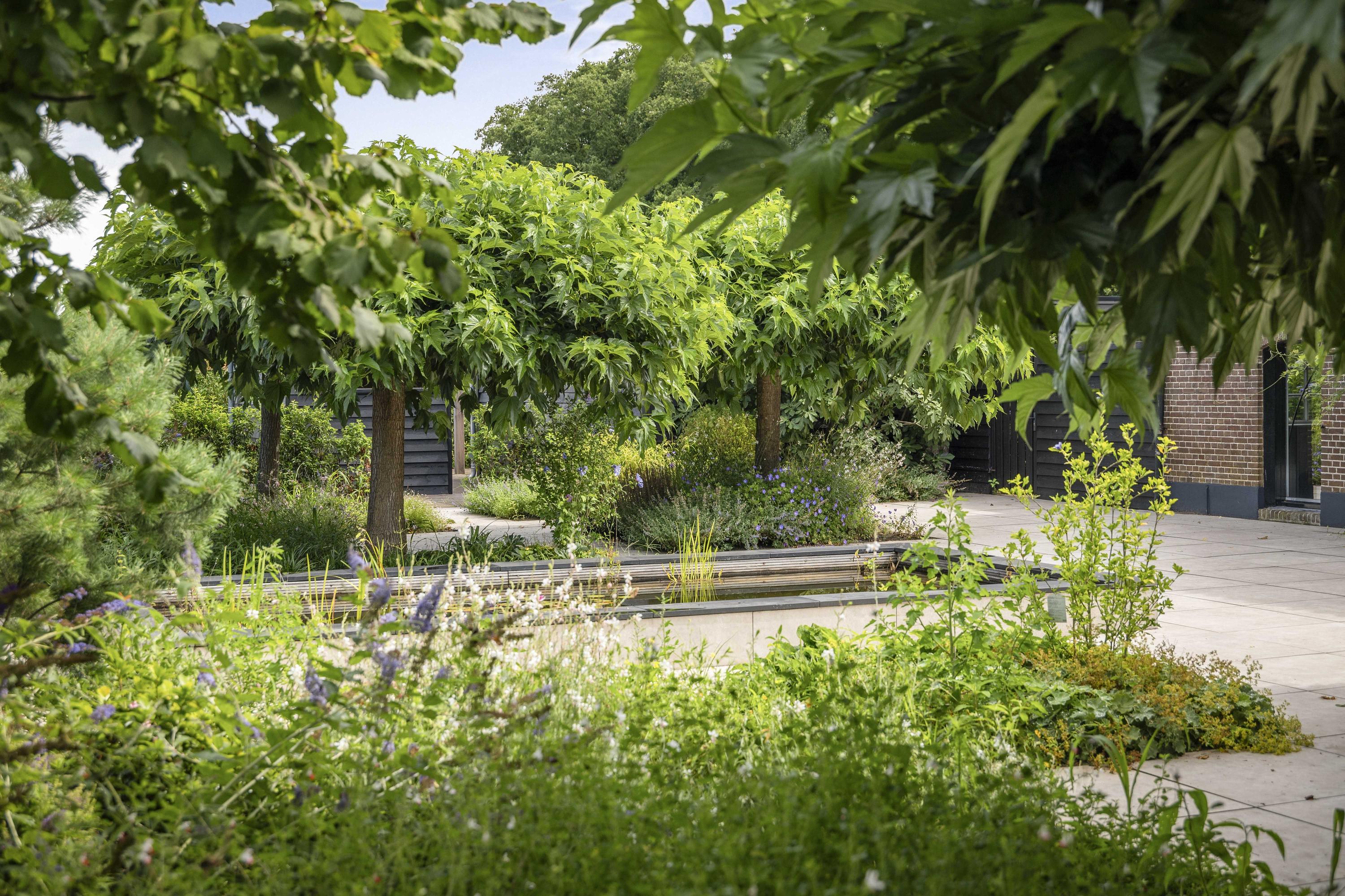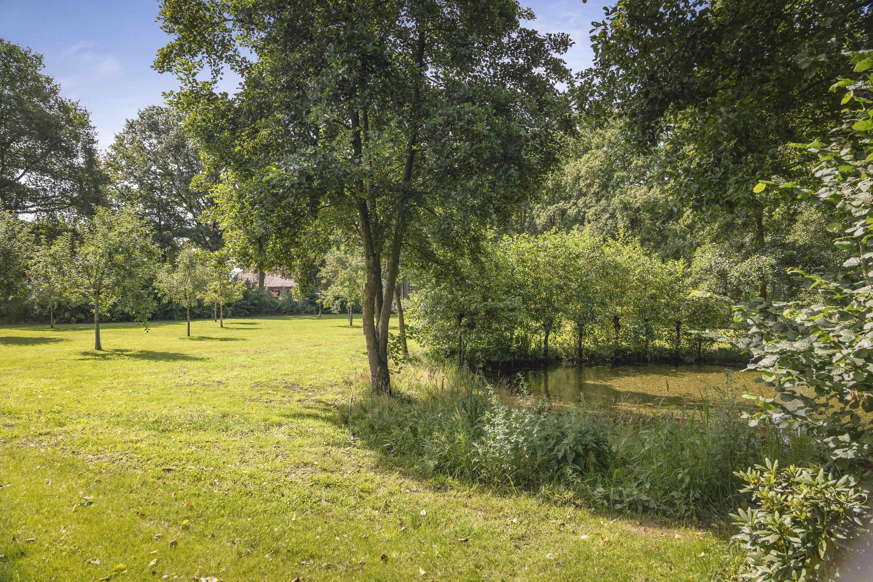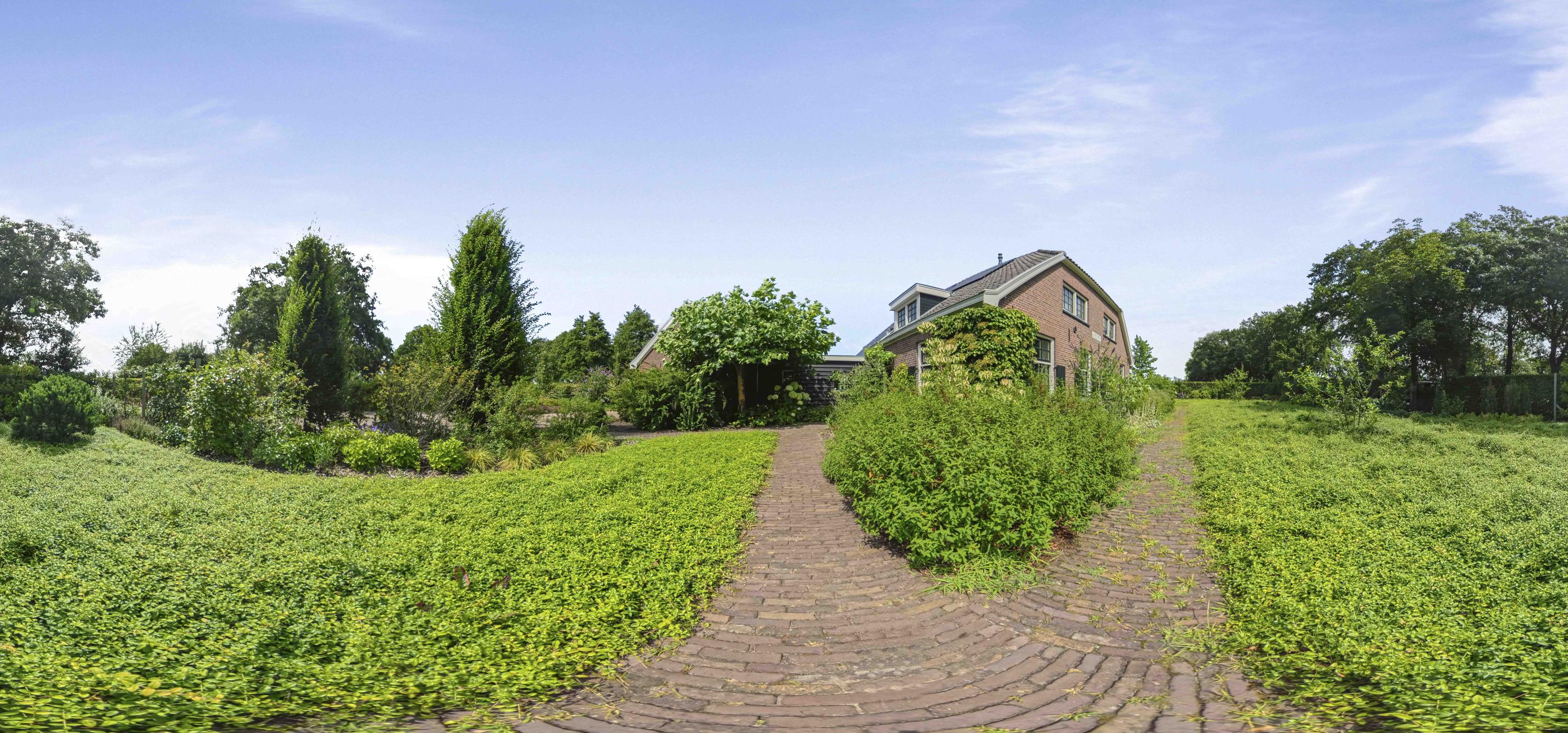 Het perceel met de tuin en de naastgelegen weide met boomgaard en waterpartij, meet 5.056 m2 en dat is groot genoeg om alle ruimte te ervaren, maar handzaam genoeg om niet overweldigd te worden door onderhoud. De aanleg is een visueel spektakel, met ruime borders, fraaie heesters en schitterende zichtlijnen; alles is doordacht en met een flinke dosis groene vingers aangelegd. Gemak van programmeerbaar beregeningssysteem met gebruikmakend van het grondwater.
