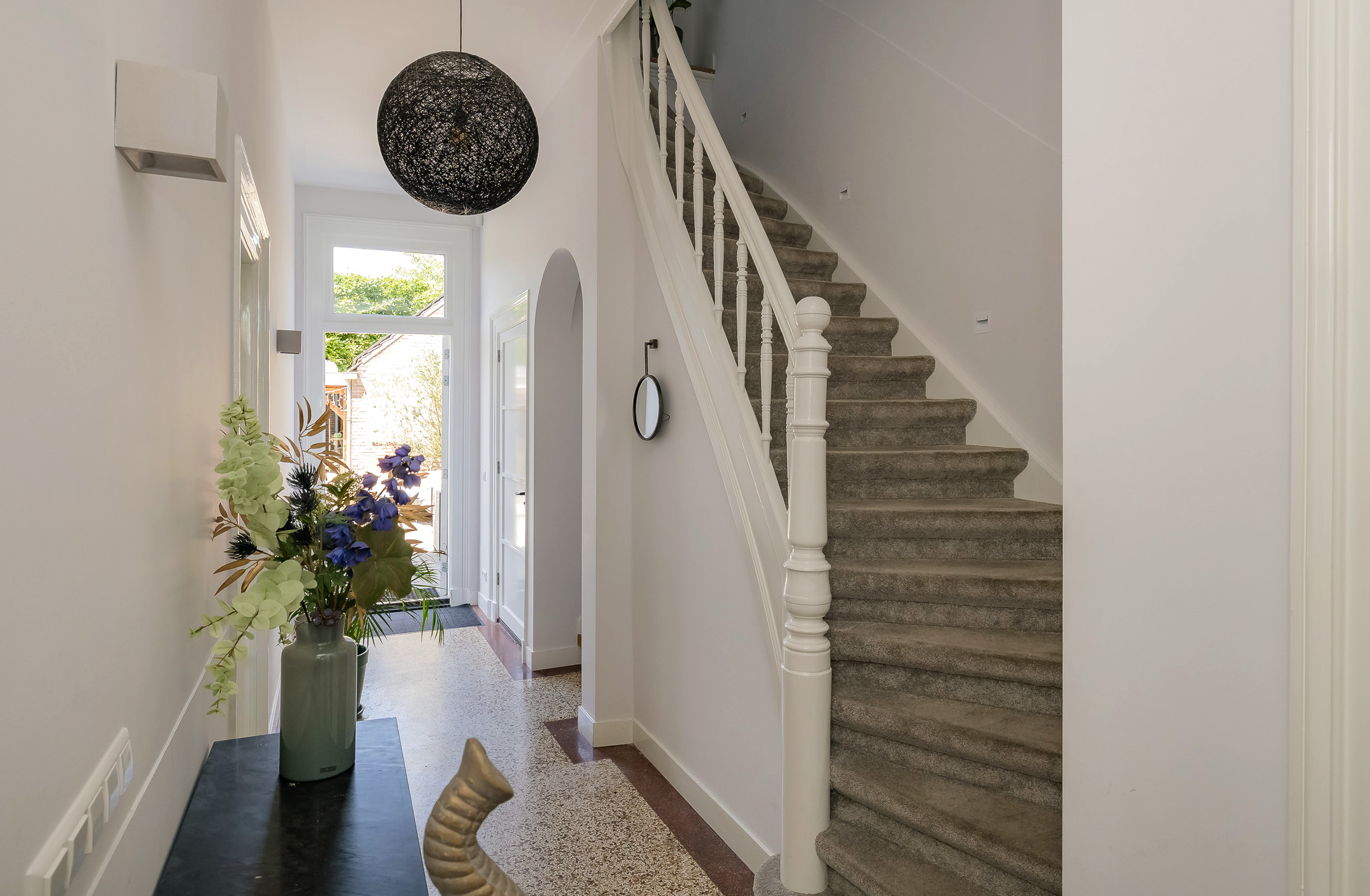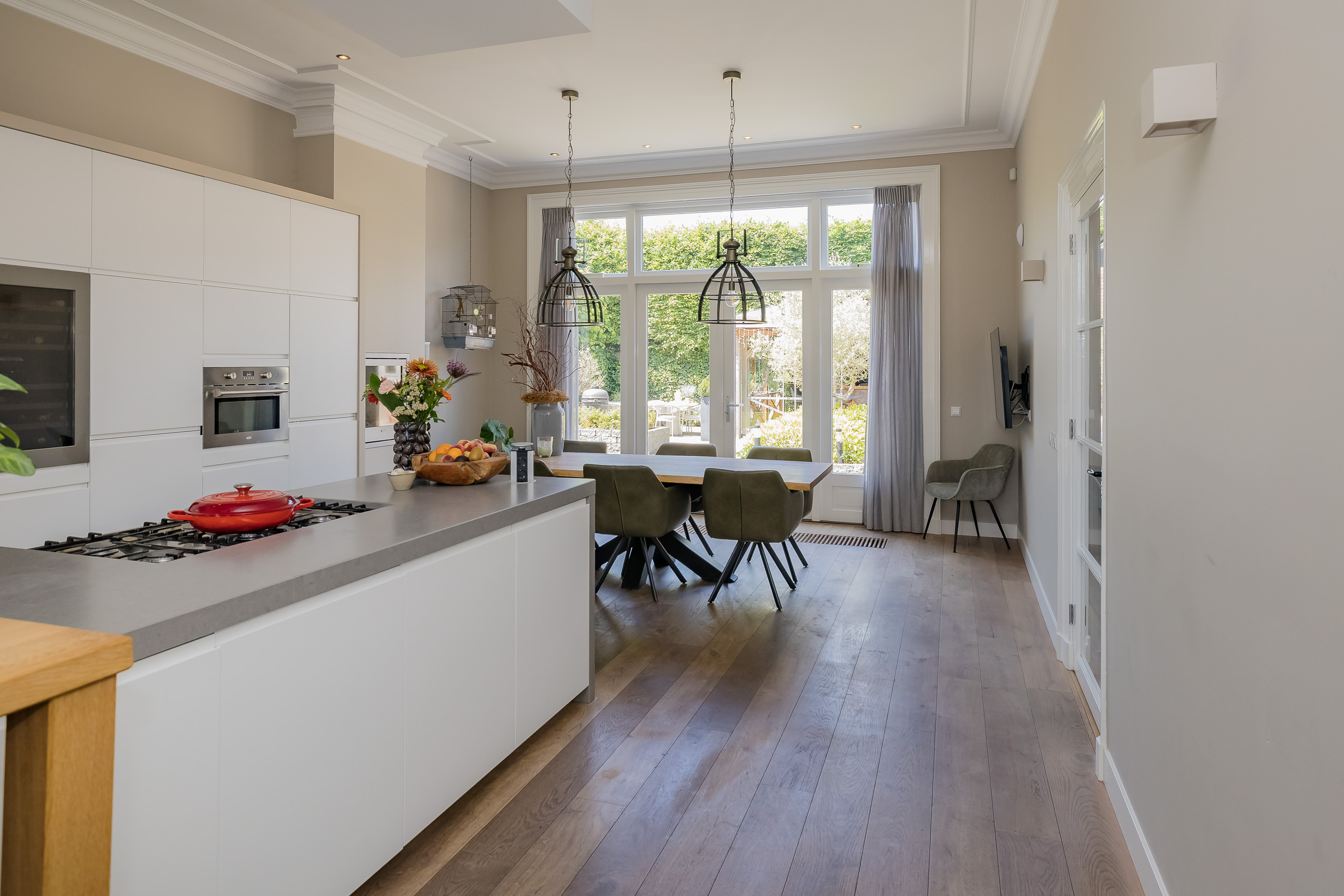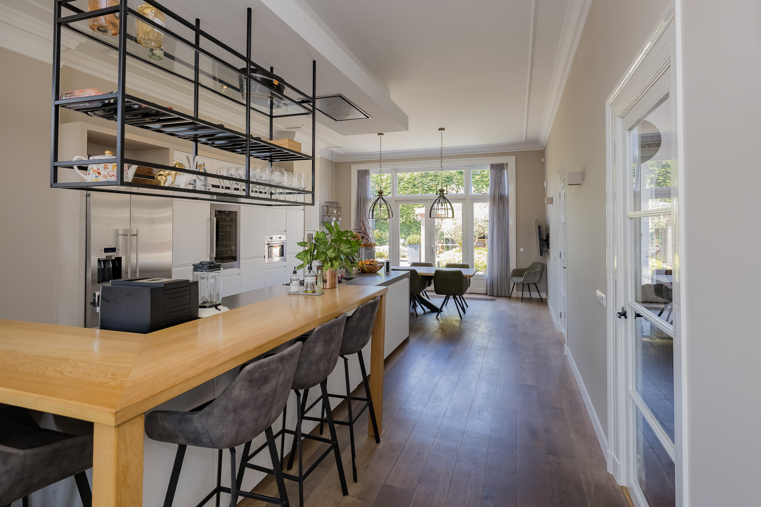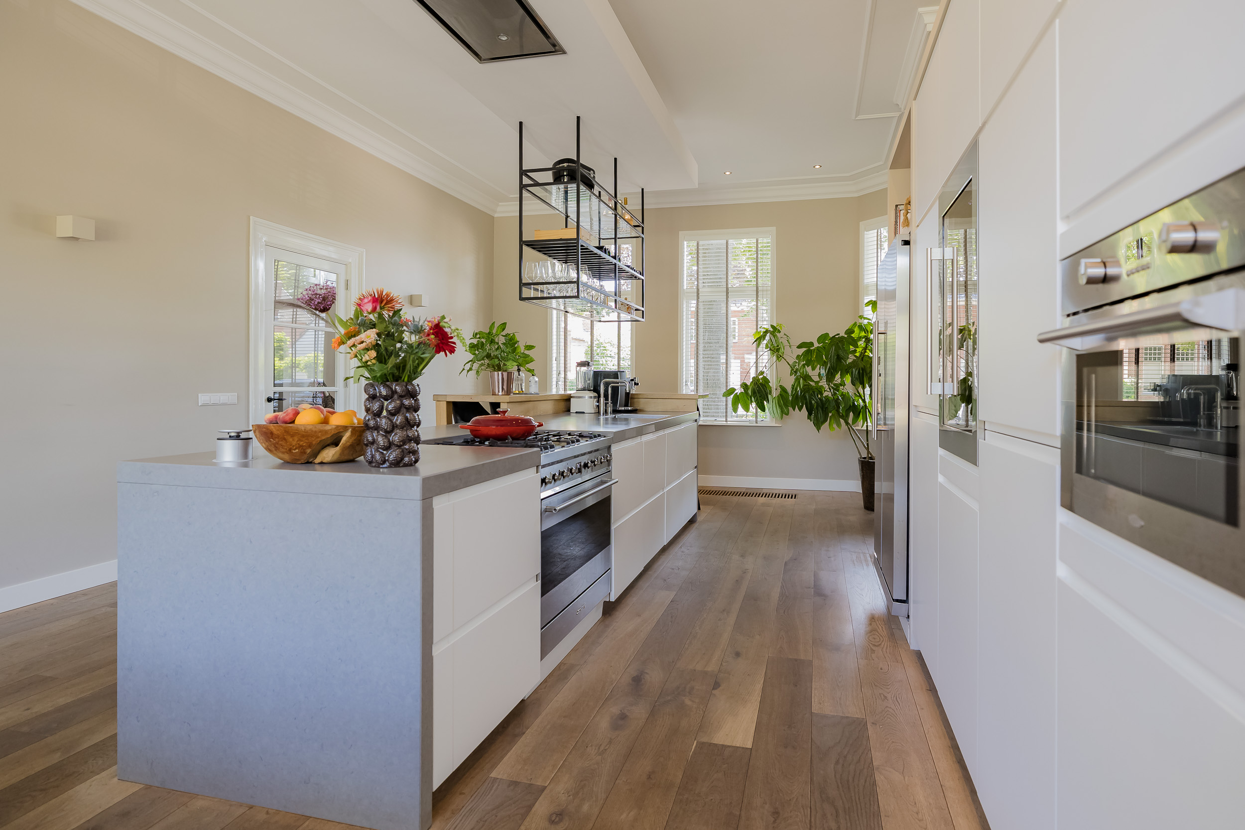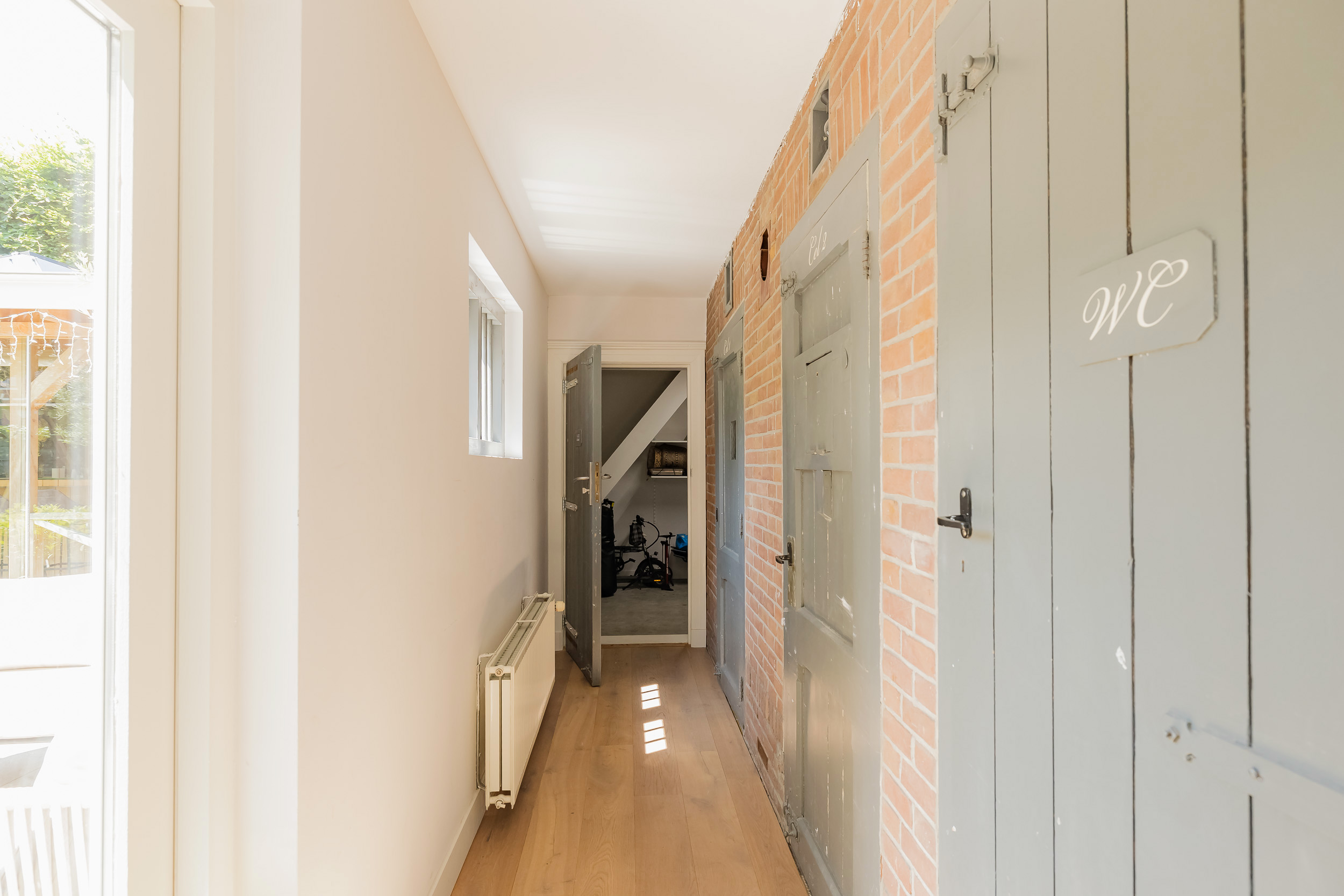 Fraai portaal waarin de markant hoge voordeur, imposant lange hal met de gerestaureerde authentieke granitovloer, garderobe en toiletruimte en een deur naar de tuin. Links van de hal een zeer royale woon-/leefkeuken met luxe keukeninrichting in mat wit uitgevoerd, prachtig kook-/ en spoeleiland met houten eetbar en alle inbouwapparatuur o.a. een fraaie wijnkoeling. Ook een gezellige gashaard en de grote achterpui met veel glas en openslaande deuren naar de tuin ontbreken niet. Rechts van de hal is er een tv-/zitkamer met een gashaard en dubbele deuren die toegang geven tot de opkamer. Deze opkamer met een grote op maat gemaakte kastenwand is zeer geschikt als speel-/of werkkamer en heeft een trap naar de grote droge kelder met stahoogte. In het voormalige cellencomplex is een prachtige werkkamer gecreëerd, een bergkamer, een technische ruimte en is er één cel in originele staat behouden gebleven. De inpandig bereikbare garage is groot en o.a. voorzien van een elektrische segment deur met loopdeur en een vaste trap naar ruime bergzolder.