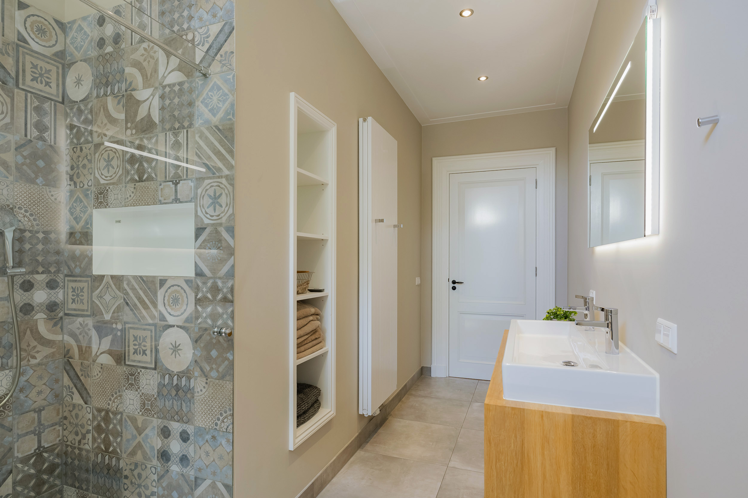 Ook hier een imposant lange hal met deur naar balkon, 3 fantastisch grote slaapkamers met mooie raampartijen, luxe badkamer met inloopdouche, ligbad en brede wastafel met 2 kranen op houten meubel, apart 2e luxe toiletruimte en 4e zeer royale was-/werkkamer.
