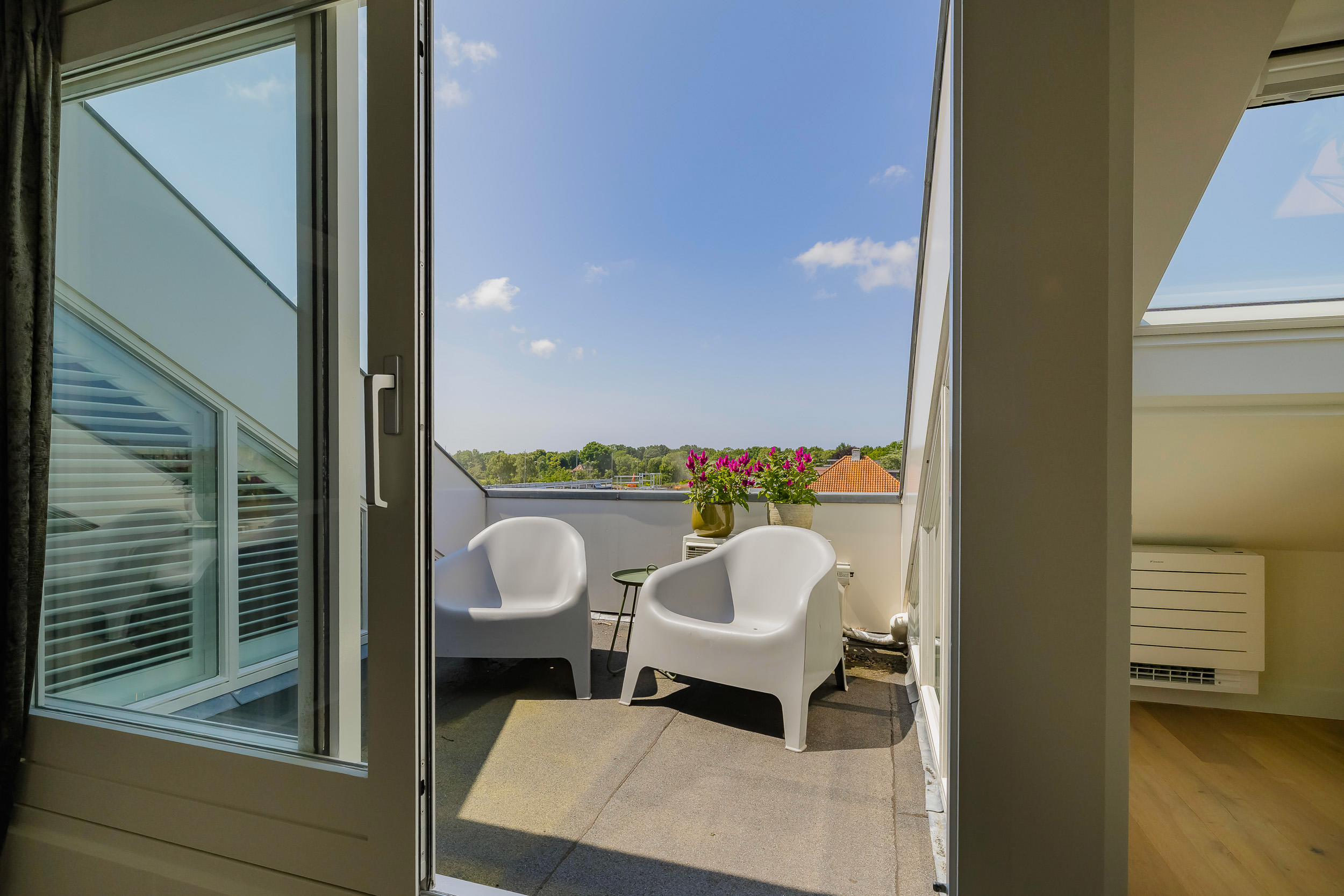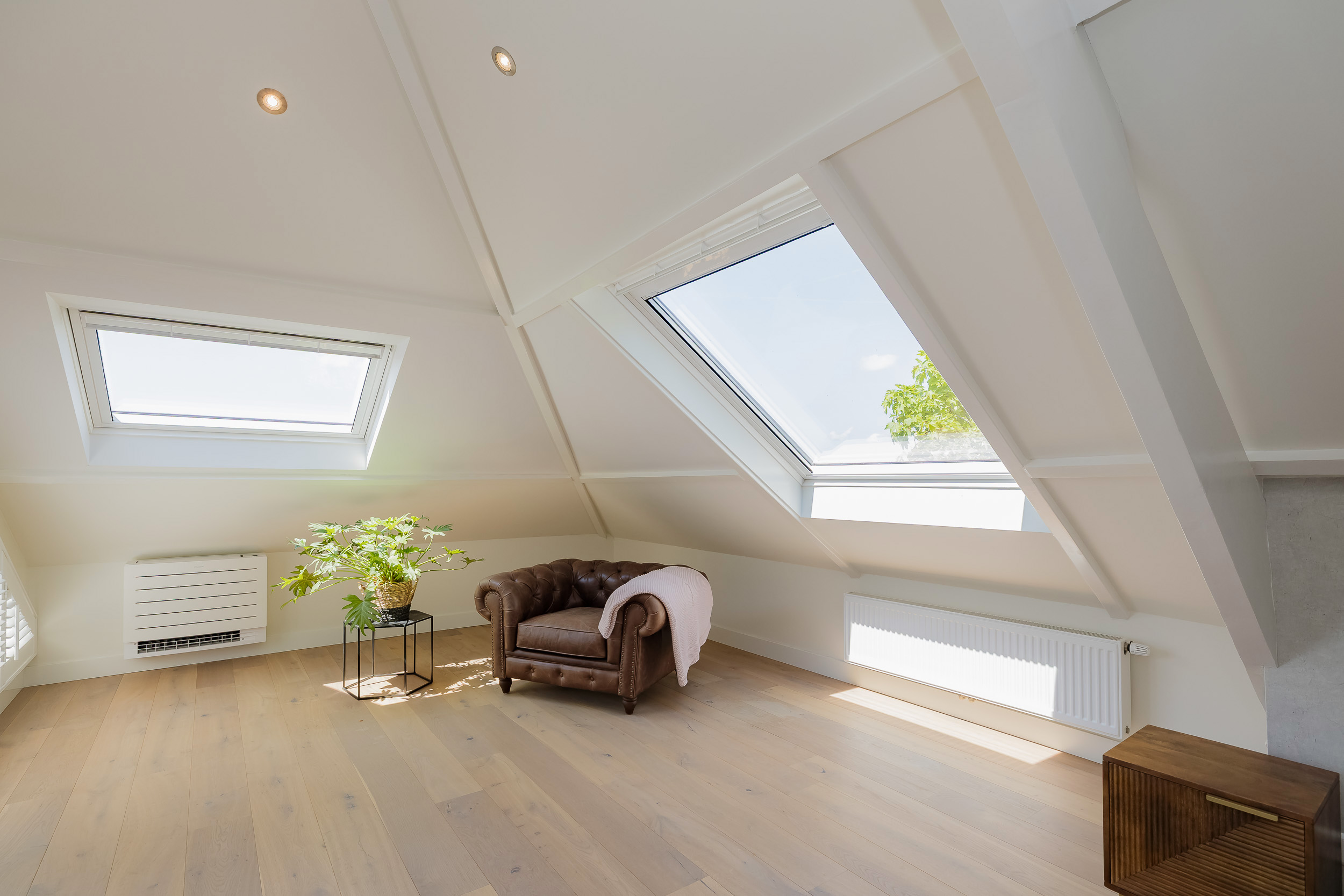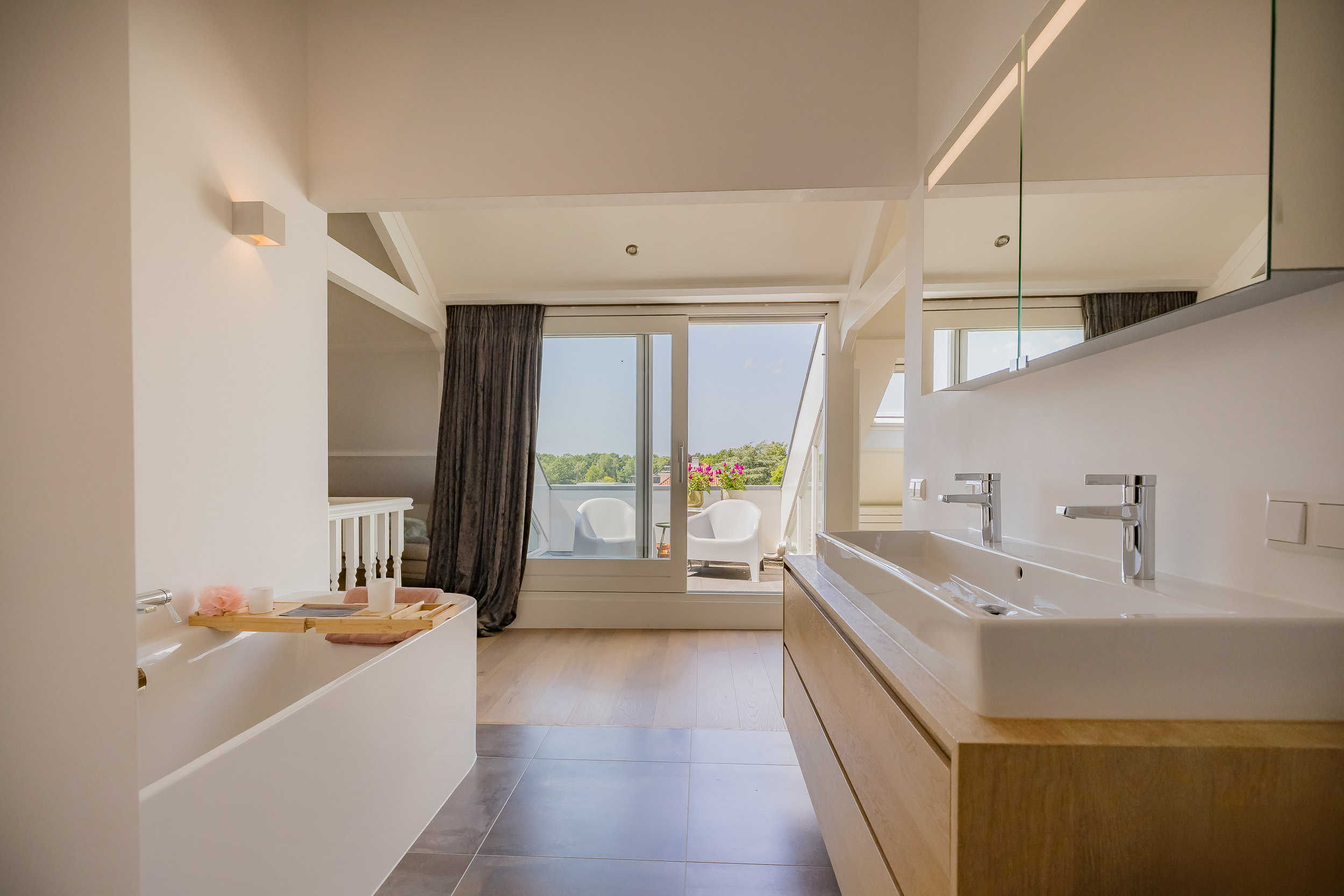 De hoofdslaapkamer bestrijkt de gehele etage en is voorzien van een inpandig balkon/loggia op het westen, inloopgarderobe en een luxe badkamer met ligbad, inloopdouche, 3e toilet en brede wastafel met twee kranen op houten meubel.
