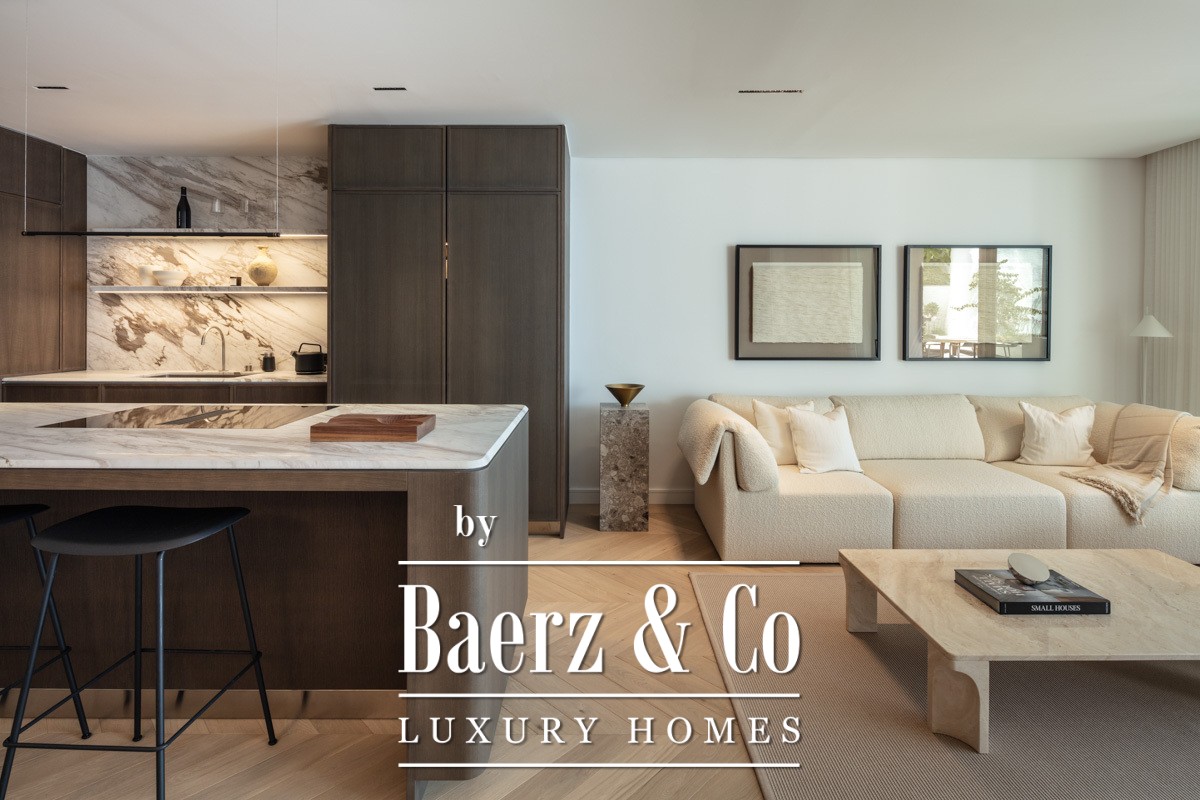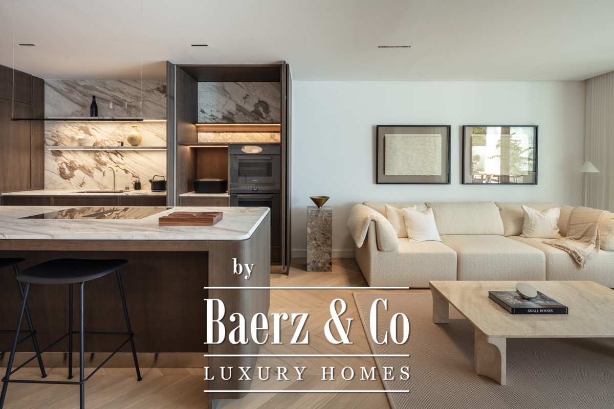 De keuken is afgewerkt met marmer en voorzien van verborgen inbouwapparatuur, ideaal voor zowel stijlvol entertainment als moeiteloos dagelijks wonen. Het overdekte, royale terras verlengt de leefruimte naar buiten voor diners en ontspanning in de frisse lucht, met directe toegang vanaf de master suite en de woonkamer. Elk van de drie slaapkamers beschikt over een eigen en-suite badkamer, afgewerkt met de mooiste materialen. De master suite, voorzien van een privacy glaswand en dubbele wastafel van grijs steen, biedt een discrete plek om te ontspannen.
