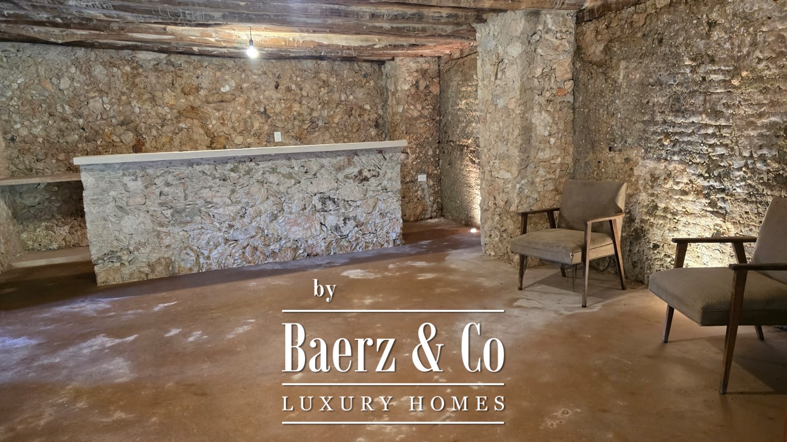 The main house, measuring 846 m², has been restored with complete fidelity and respect for the original techniques. The roofs were rebuilt with roisos of heartwood chackté and Bakpec; the walls were built exclusively with stone from the property, with no concrete blocks or bricks. The chukum finishes and the total absence of steel or modern rebar reinforce the authentic character of the hacienda. The façade has been preserved as-is, as a visual tribute to the passage of time.
