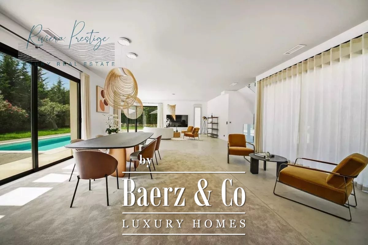 Villa Mougins is een eigentijdse schuilplaats, gekenmerkt door verfijnde architectonische lijnen en royale raampartijen die het 380 m² leefruimte overladen met natuurlijk daglicht. Deze woning verwelkomt u in een wereld waar het elegante interieur naadloos overloopt in de rust van het buitenleven, met terrassen die uitkijken over een weelderige tuin en een zwembad, en zo het decor vormen voor serene ontspanning of sfeervolle bijeenkomsten.