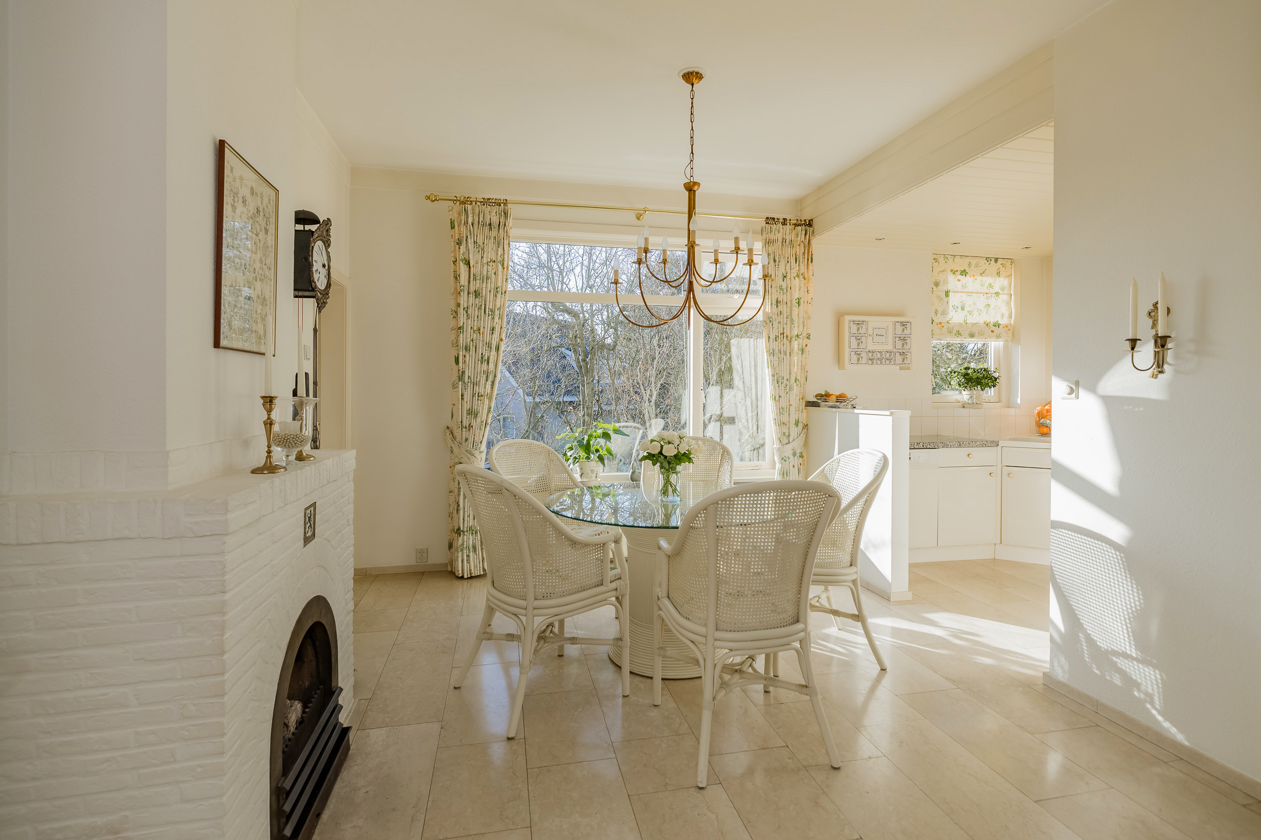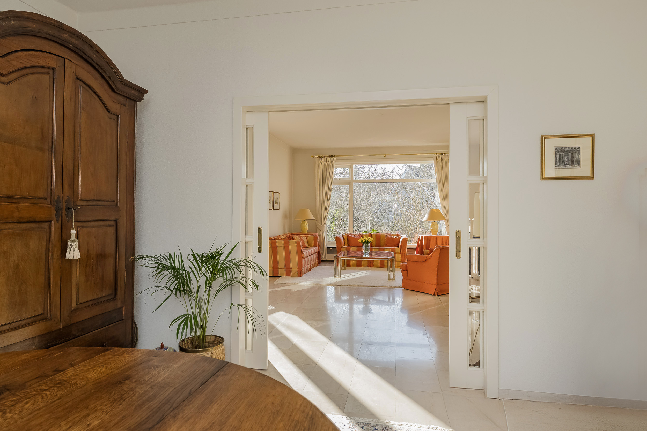 De royale woonkamer is een heerlijke leefruimte met een warme, uitnodigende sfeer. De open haard en de elegante marmeren vloer geven de ruimte karakter, terwijl de deuren vanuit de woonkamer zorgen voor een directe verbinding met de tuin. De zon draait van ’s-ochtends tot ’s-avonds om het huis wat voor een prachtige lichtinval zorgt.