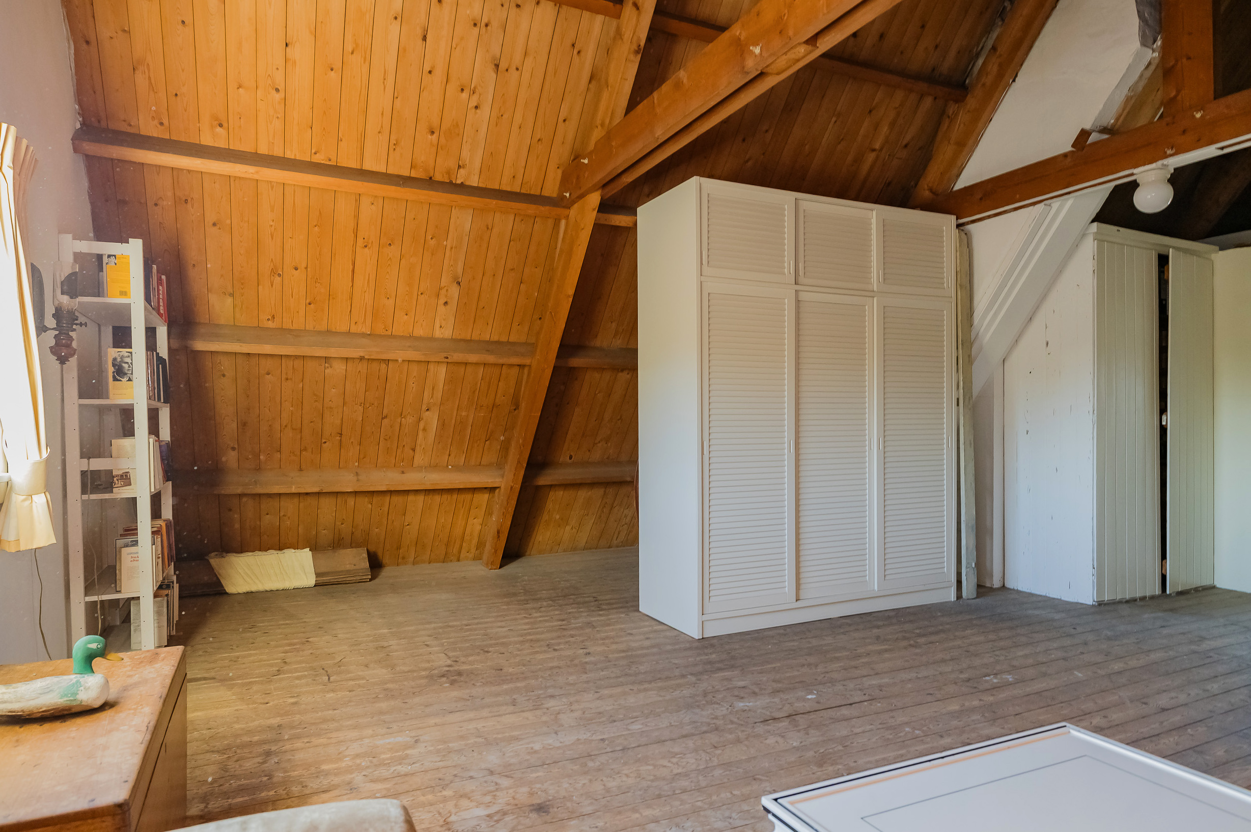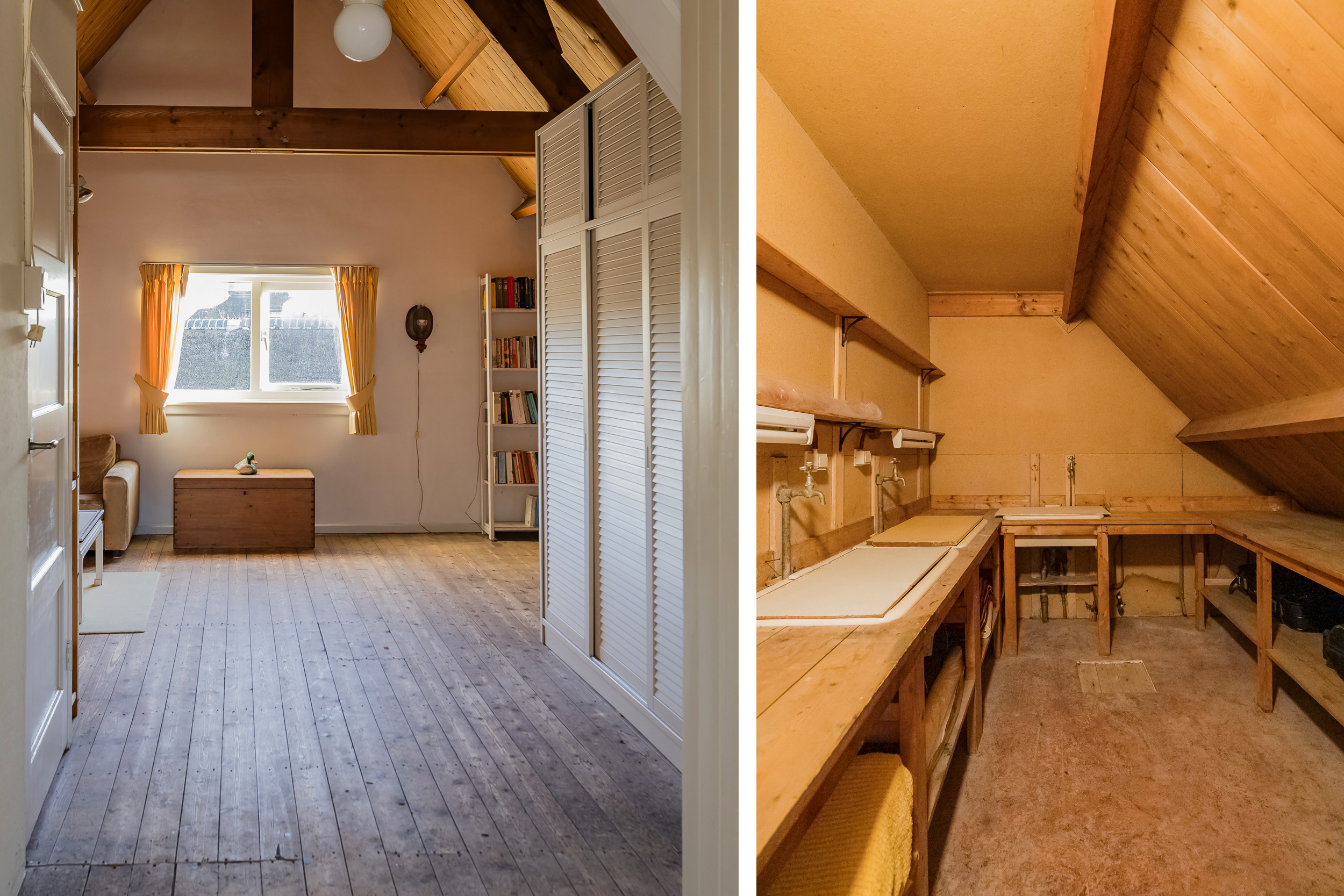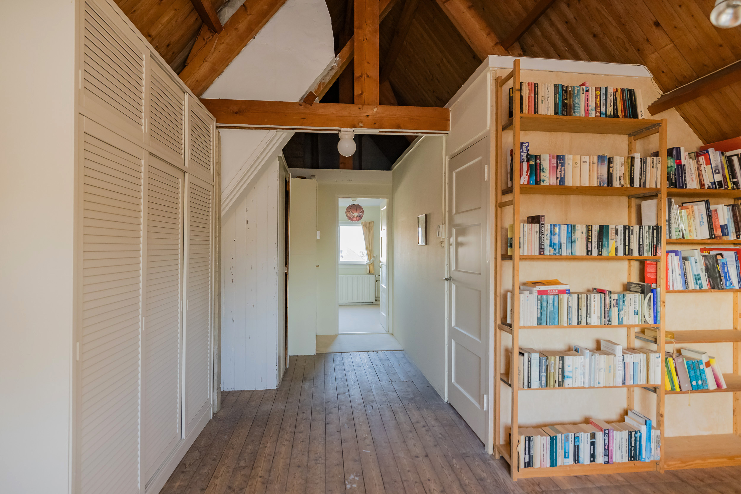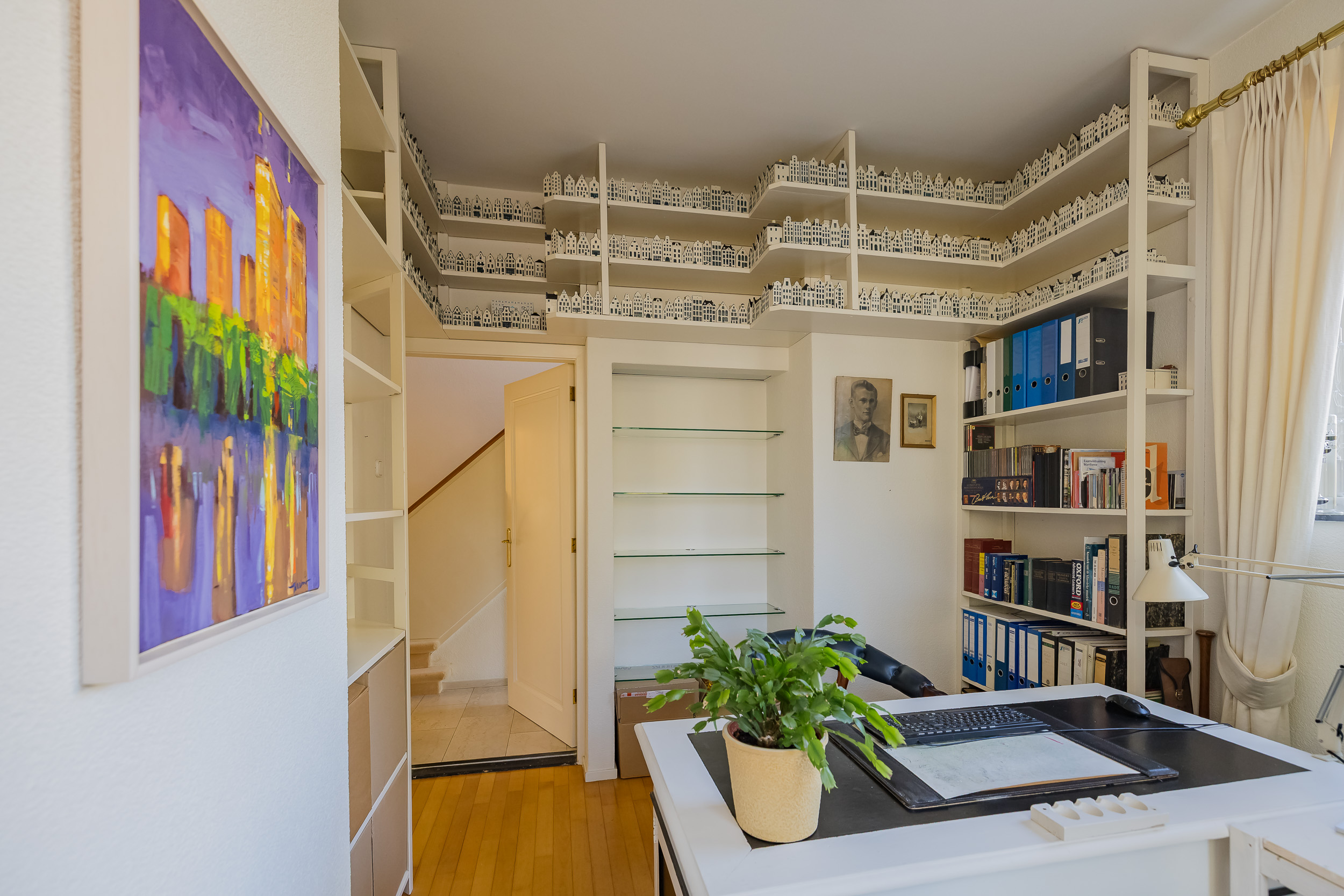 Verder vind je op deze verdieping een goed uitgeruste werkkamer voorzien van maatwerk kasten en een bijkeuken/bergruimte met vlizotrap naar de ruime vliering met stahoogte die extra bergruimte biedt boven de hele bijkeuken.