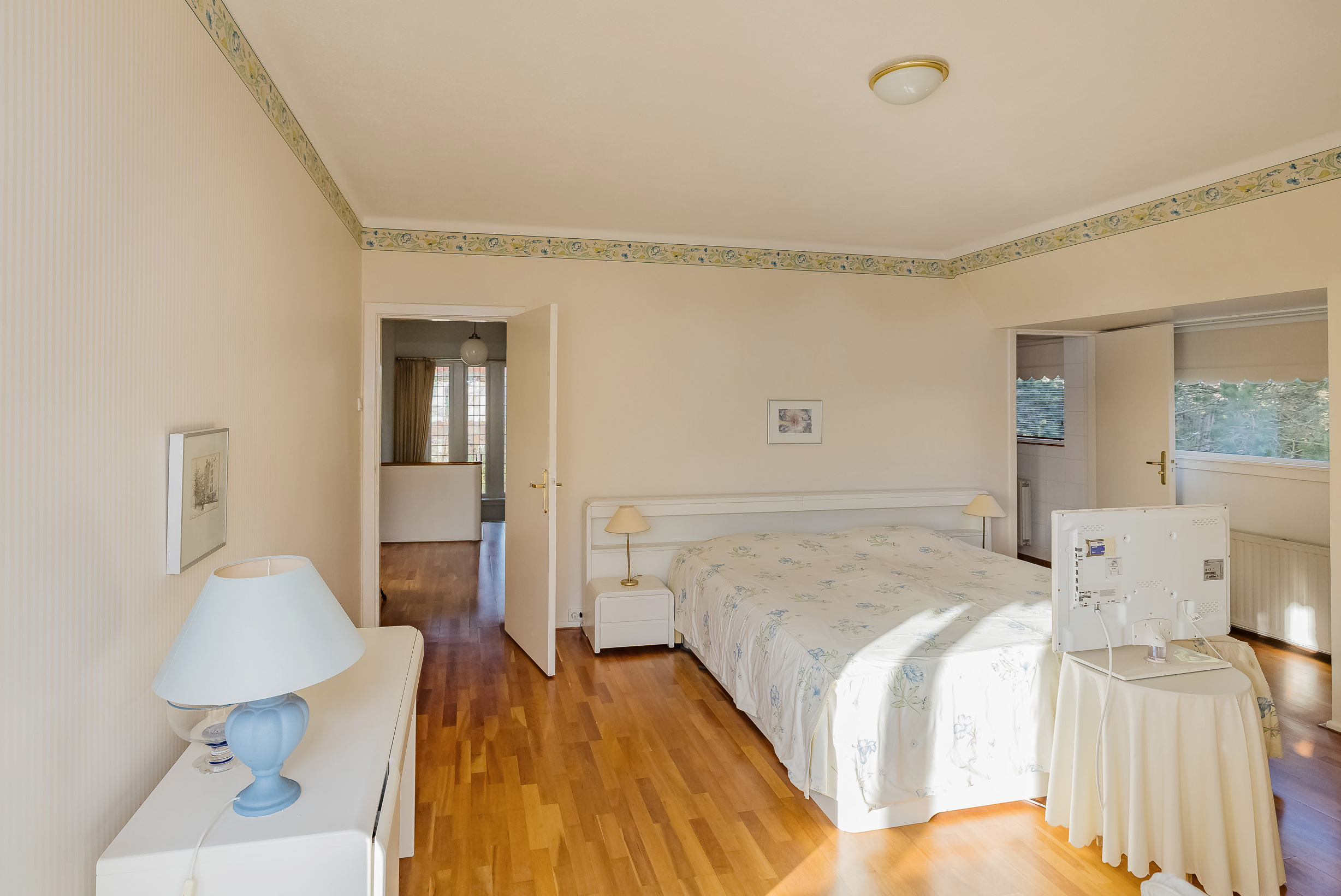 De vaste trap leidt naar een verrassend ruime verdieping met een grote overloop/multifunctionele ruimte en een vijfde slaapkamer met eigen wastafel en diepe kast. Ook vindt u hier een donkere kamer (DoKa).