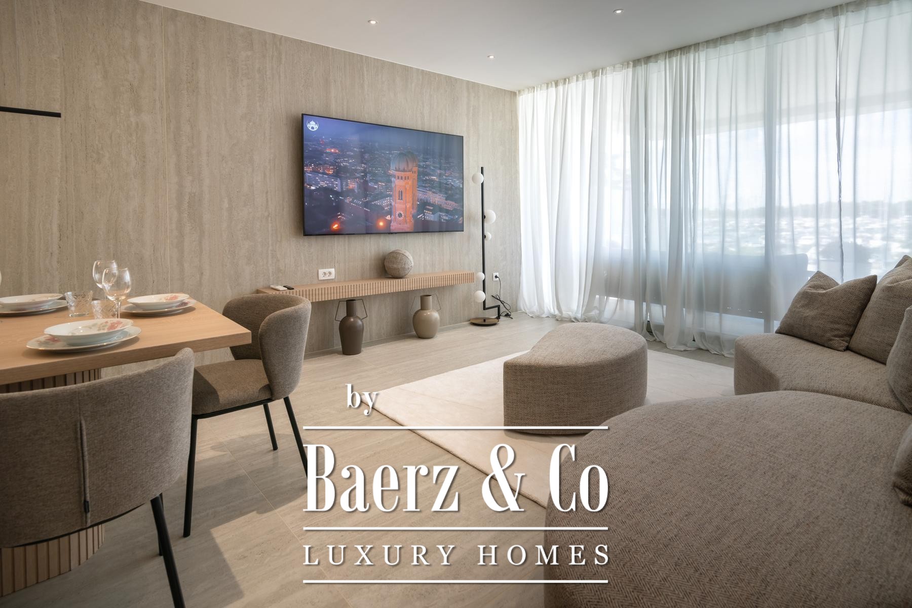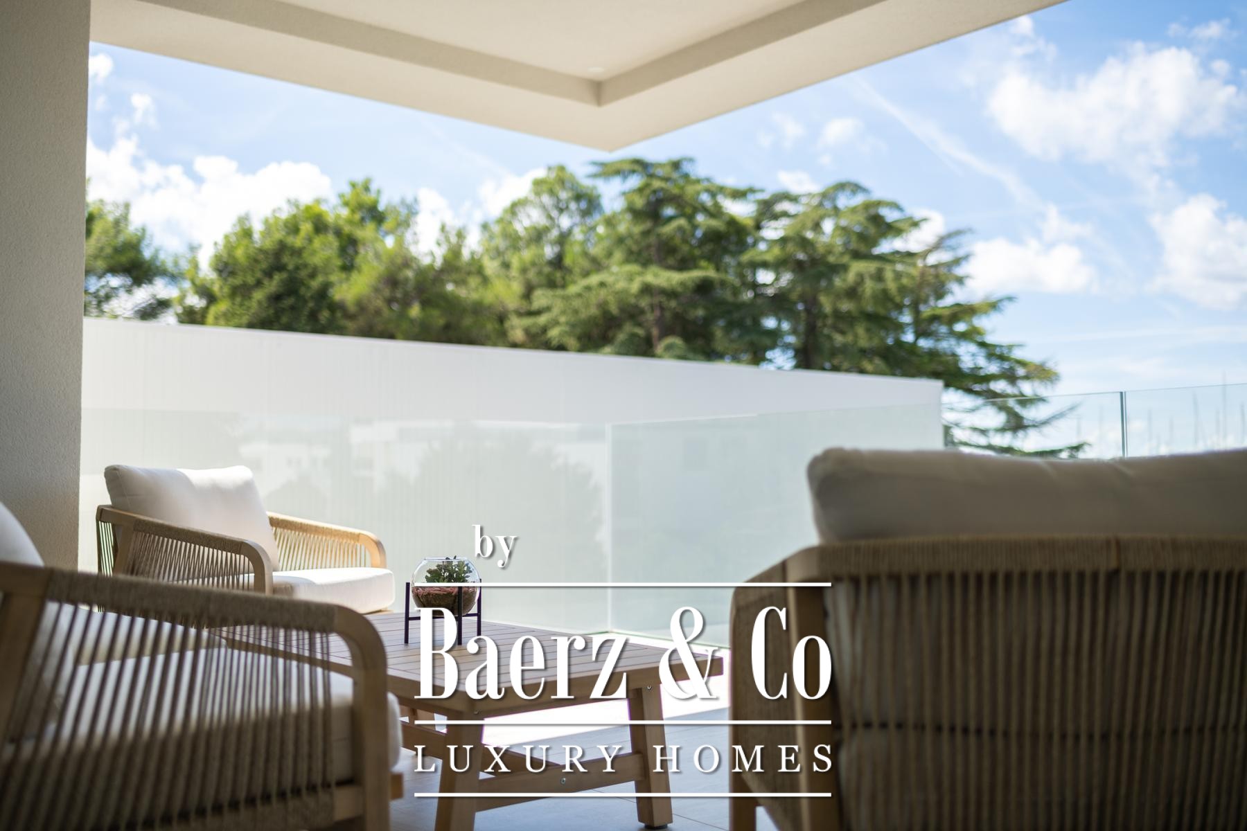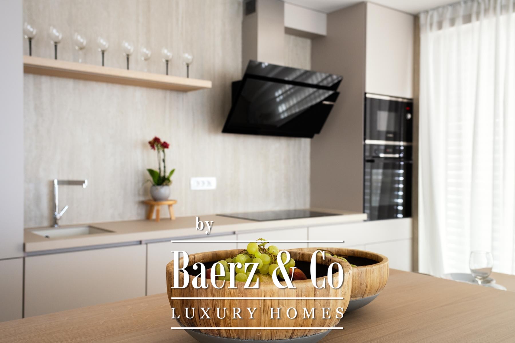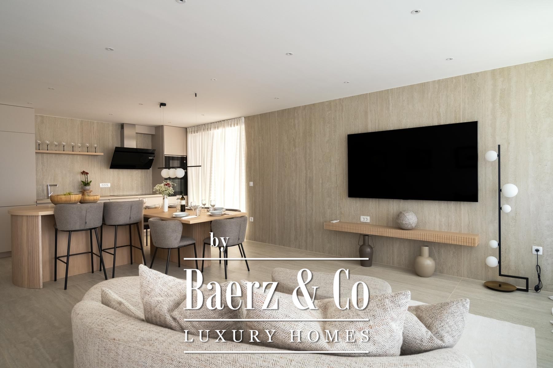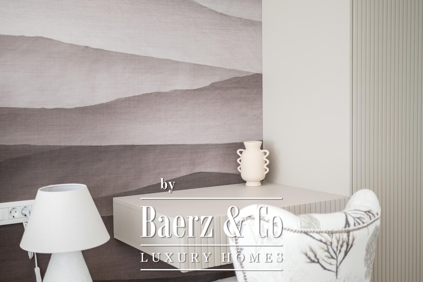 Het open leefgedeelte wordt rijkelijk verlicht en vormt één geheel met de keuken, eetkamer en zitkamer. Via deze ruimte is de overdekte terras met panoramisch zeezicht toegankelijk. De master bedroom beschikt over een eigen badkamer en balkon, terwijl de twee andere slaapkamers een stijlvol ingerichte badkamer delen. Elk detail – van Bosch-apparatuur tot vloerverwarming en airconditioning – is gericht op comfort en kwaliteit. Het appartement biedt daarnaast twee parkeerplaatsen, een privéberging en toegang tot een verwarmd zoutwaterzwembad, een sauna en een fitnessruimte.