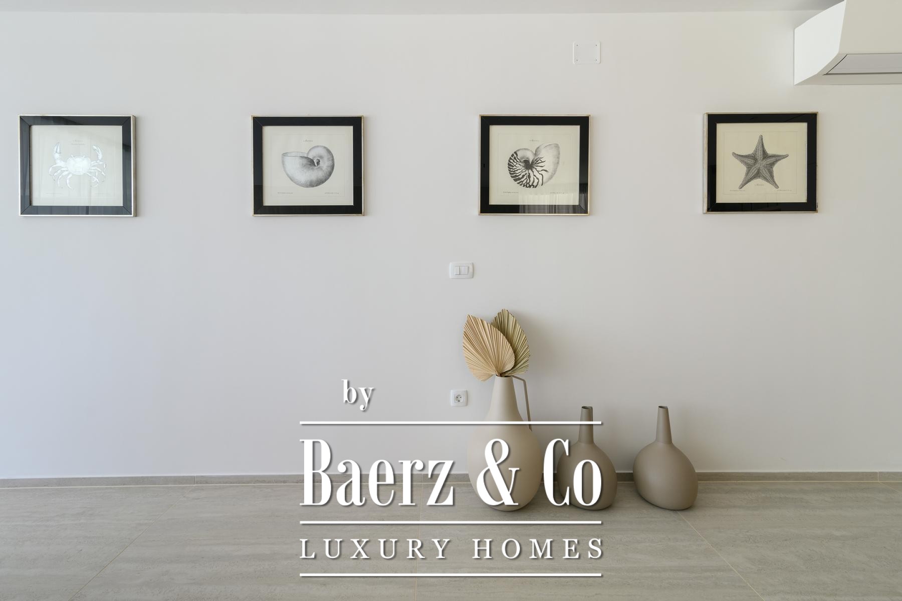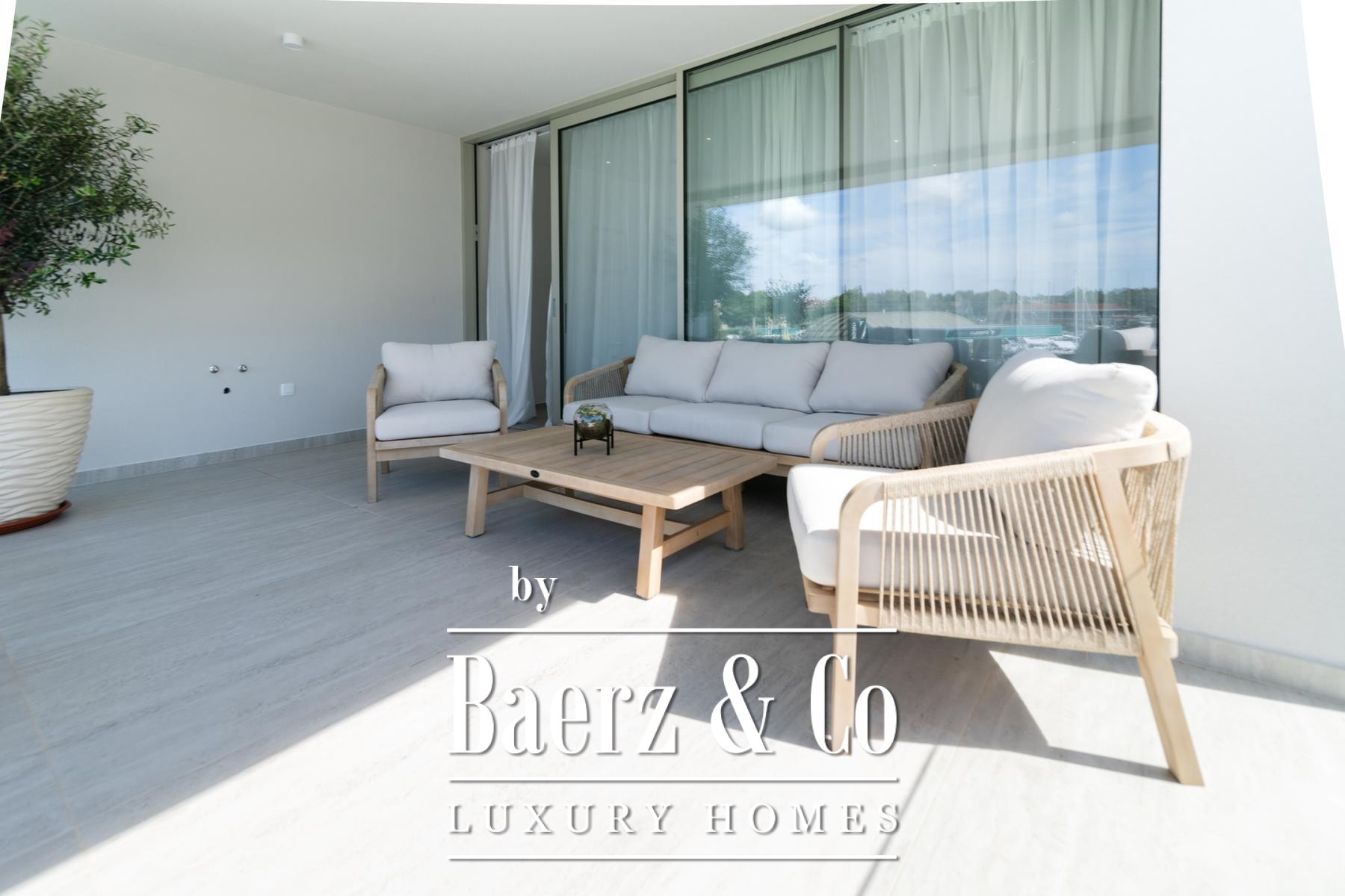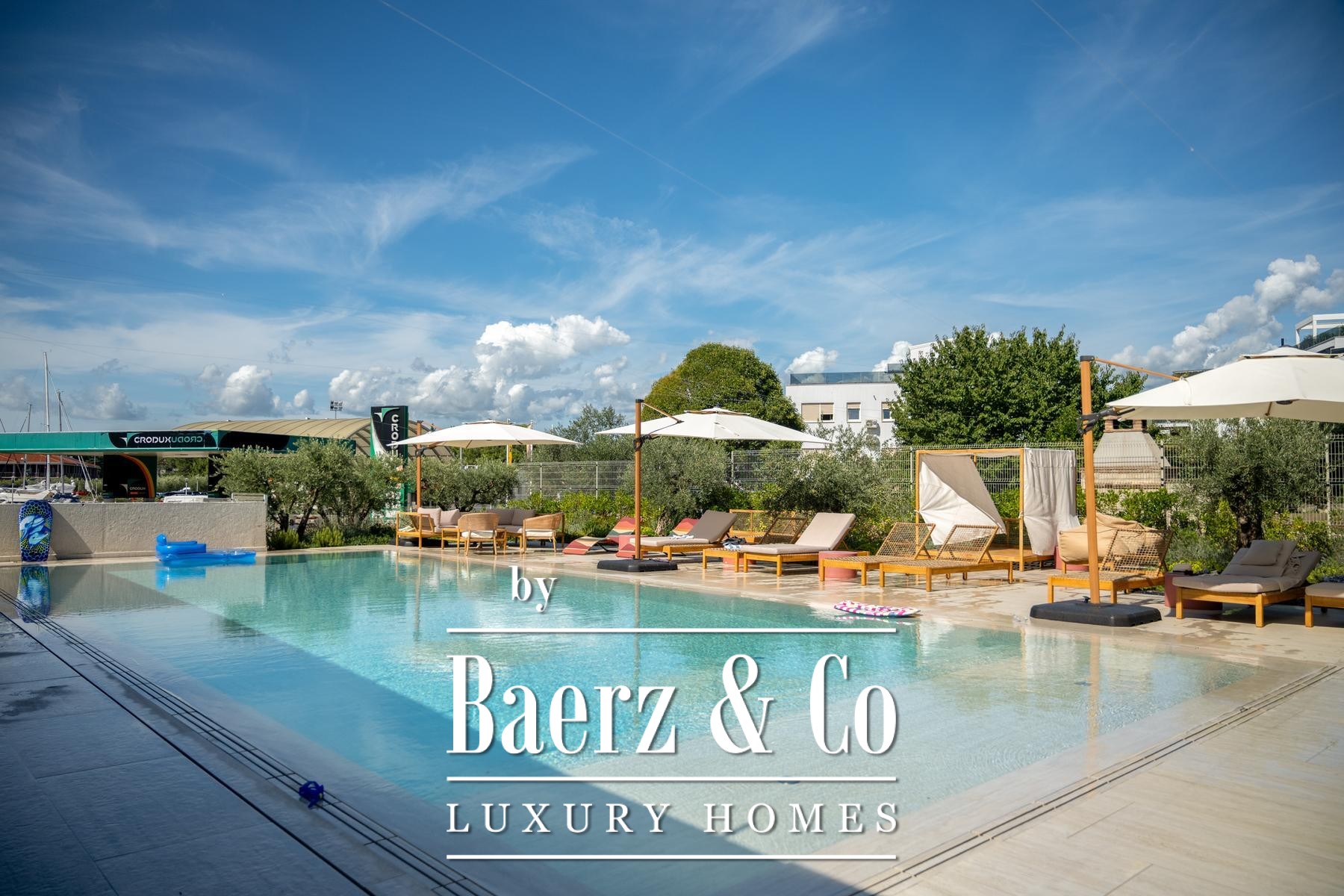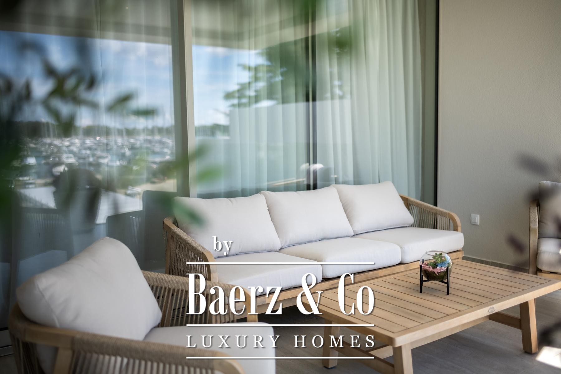 Het open leefgedeelte wordt rijkelijk verlicht en vormt één geheel met de keuken, eetkamer en zitkamer. Via deze ruimte is de overdekte terras met panoramisch zeezicht toegankelijk. De master bedroom beschikt over een eigen badkamer en balkon, terwijl de twee andere slaapkamers een stijlvol ingerichte badkamer delen. Elk detail – van Bosch-apparatuur tot vloerverwarming en airconditioning – is gericht op comfort en kwaliteit. Het appartement biedt daarnaast twee parkeerplaatsen, een privéberging en toegang tot een verwarmd zoutwaterzwembad, een sauna en een fitnessruimte.