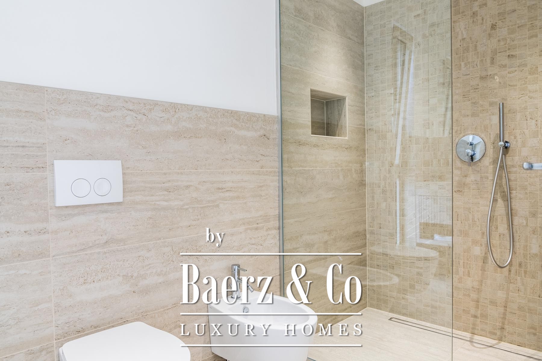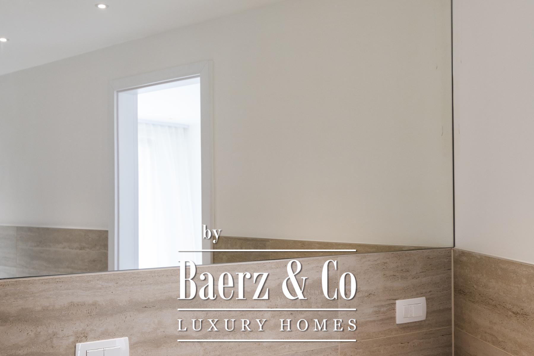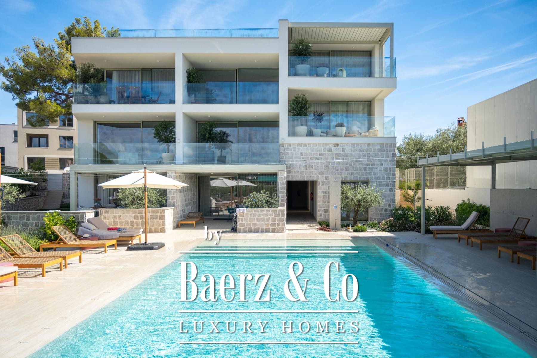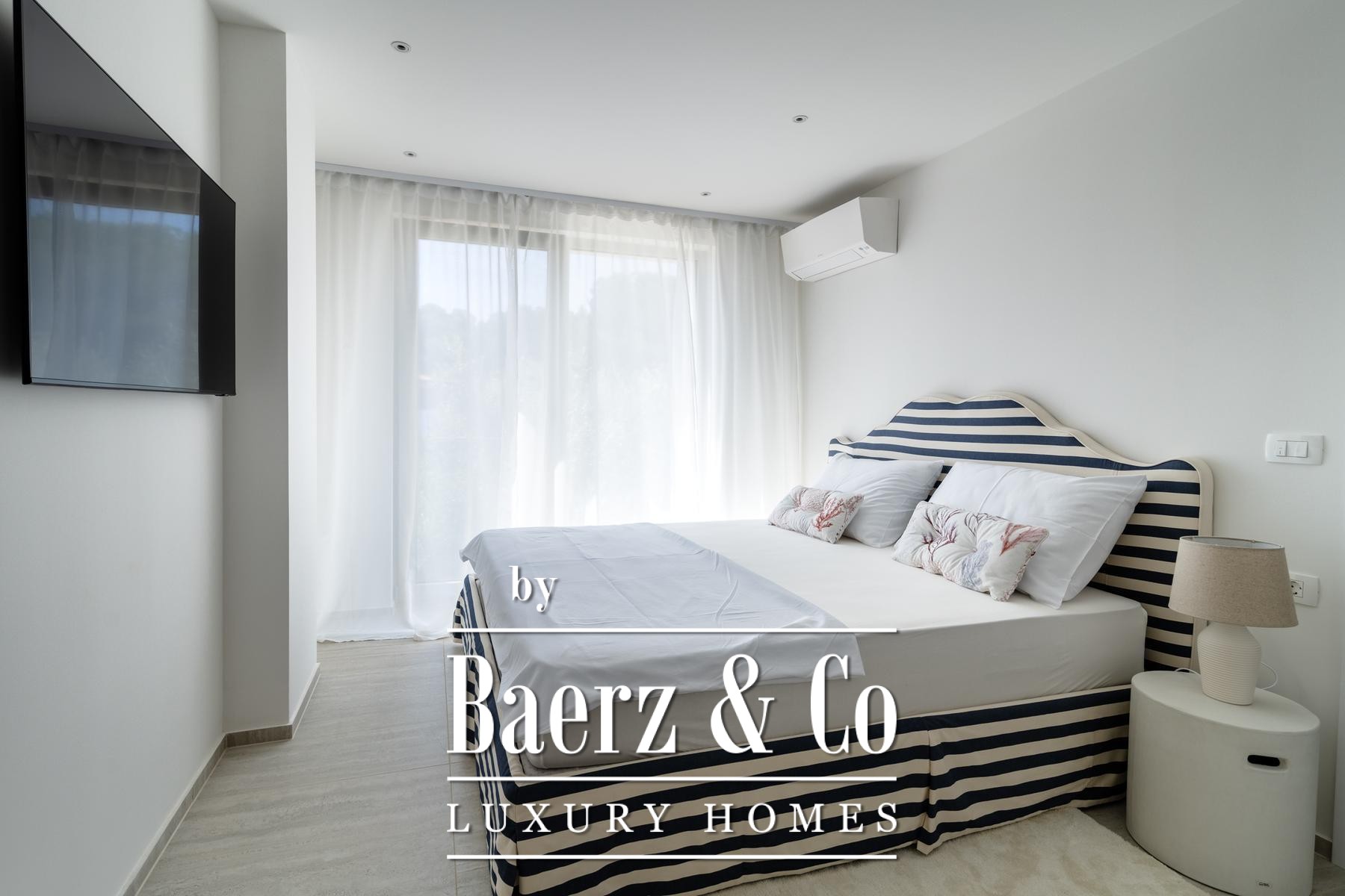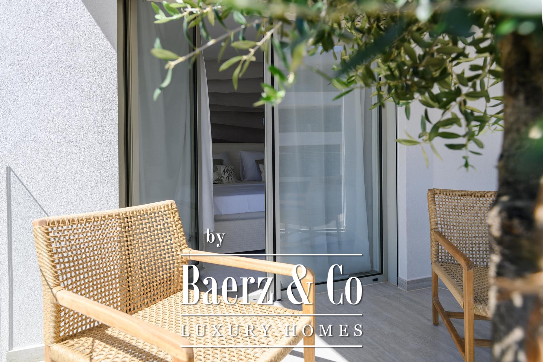 Het open leefgedeelte wordt rijkelijk verlicht en vormt één geheel met de keuken, eetkamer en zitkamer. Via deze ruimte is de overdekte terras met panoramisch zeezicht toegankelijk. De master bedroom beschikt over een eigen badkamer en balkon, terwijl de twee andere slaapkamers een stijlvol ingerichte badkamer delen. Elk detail – van Bosch-apparatuur tot vloerverwarming en airconditioning – is gericht op comfort en kwaliteit. Het appartement biedt daarnaast twee parkeerplaatsen, een privéberging en toegang tot een verwarmd zoutwaterzwembad, een sauna en een fitnessruimte.