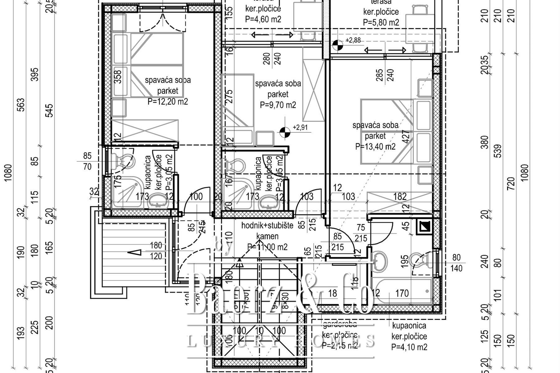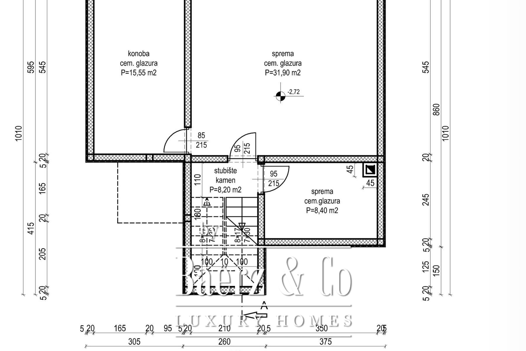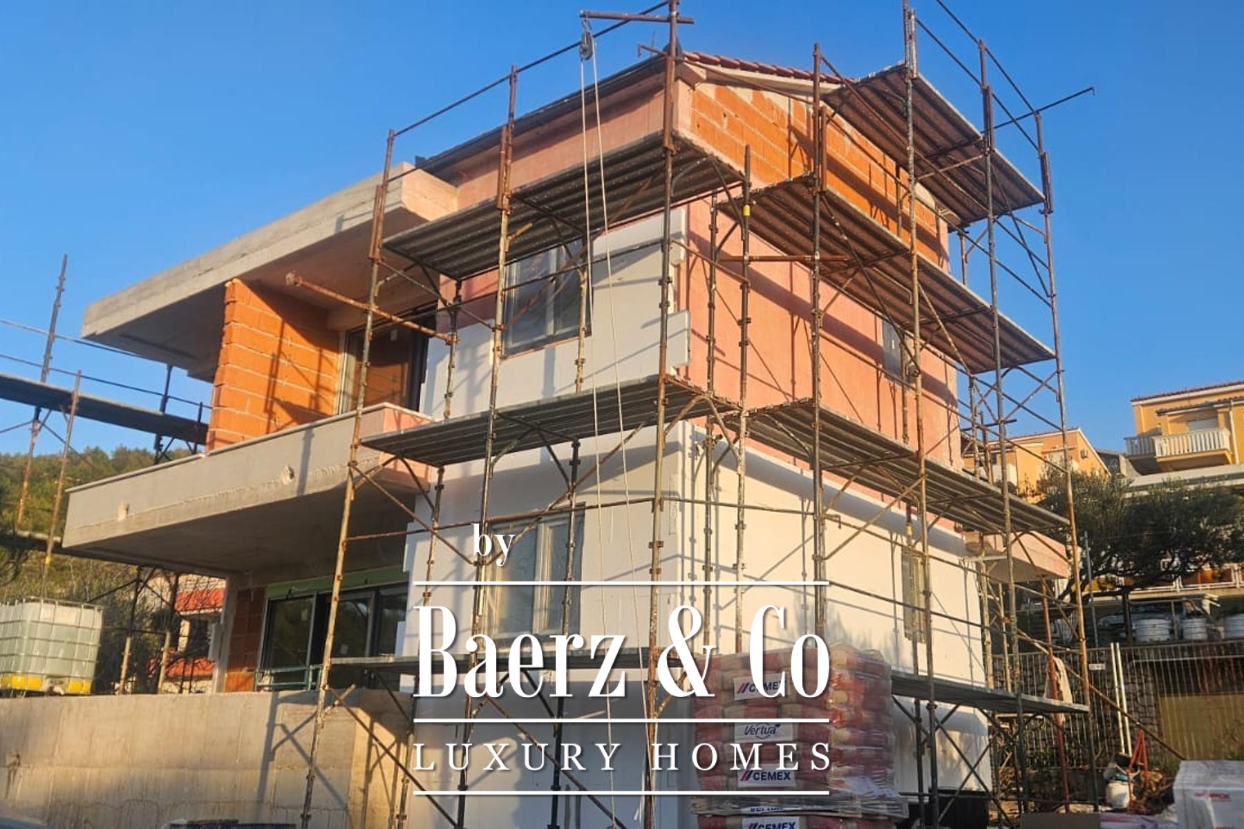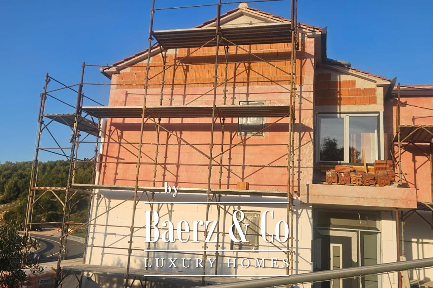 De woning is verdeeld over een souterrain, verhoogde begane grond en eerste verdieping, waardoor privé- en gemeenschappelijke ruimtes harmonieus in elkaar overgaan. De begane grond verwelkomt met een open keuken, eetkamer en woonkamer, die uitkomen op een ruim terras van 15,6 m² met zeezicht. Boven bevinden zich drie comfortabele slaapkamers, elk met een eigen badkamer. Twee kamers hebben toegang tot een balkon met panoramisch uitzicht over de Adriatische Zee; de derde slaapkamer geeft uit op een aangrenzend balkon.