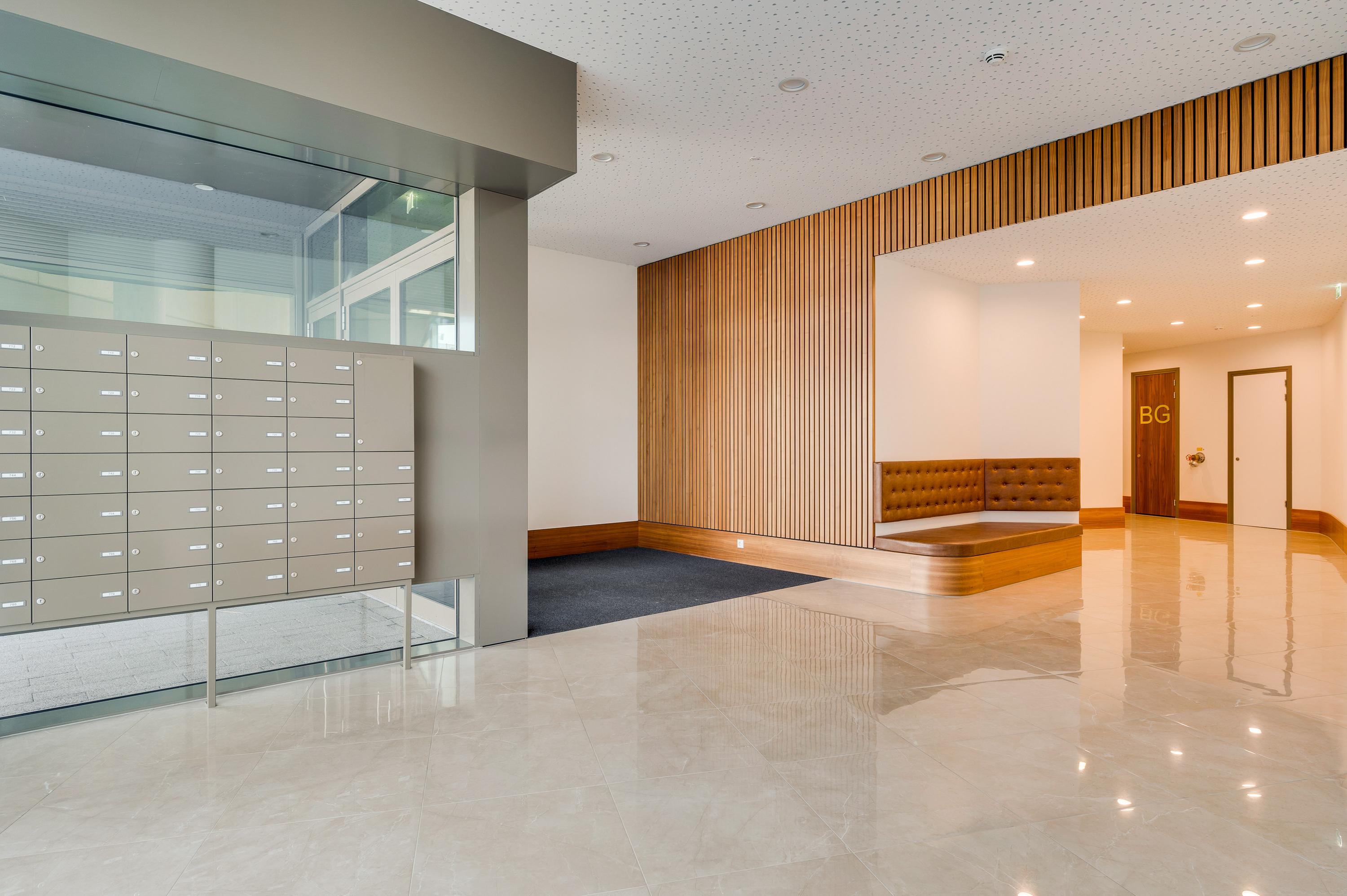 Begane grond: Entree met bellentableau, trappenhuis en liftinstallatie. Alle toegangsdeuren, ook van het appartement, zijn voorzien van een elektronisch cilinderslot zodat de toegangsdeuren keyless geopend kunnen worden.