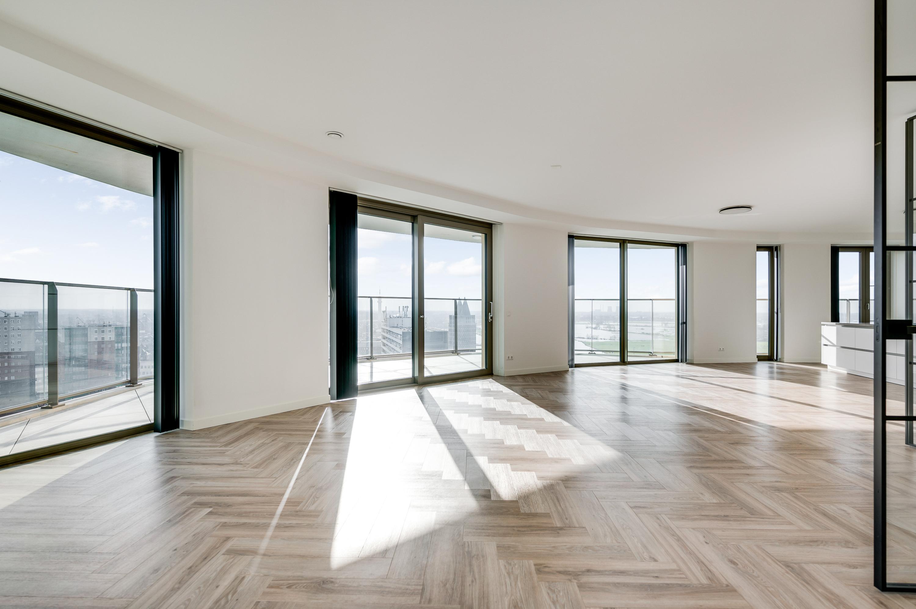 14e verdieping: Entree / hal met toegang tot de diverse ruimtes waaronder een separaat toilet, de techniekruimte, drie slaapkamers, twee badkamers en de woon-en eetkamer. De royale woonkamer met luxe keuken geeft ruimte voor een groot gezelschap, met zowel een ruime zithoek als eethoek. De keuken is voorzien van diverse Siemens inbouwapparatuur zoals: combi oven/magnetron, stoomoven, inductie kookplaat met afzuiging, vaatwasser, diepvries, quooker en koelkast. Door de verdiepingshoge ramen geniet u altijd van een prachtig uitzicht.