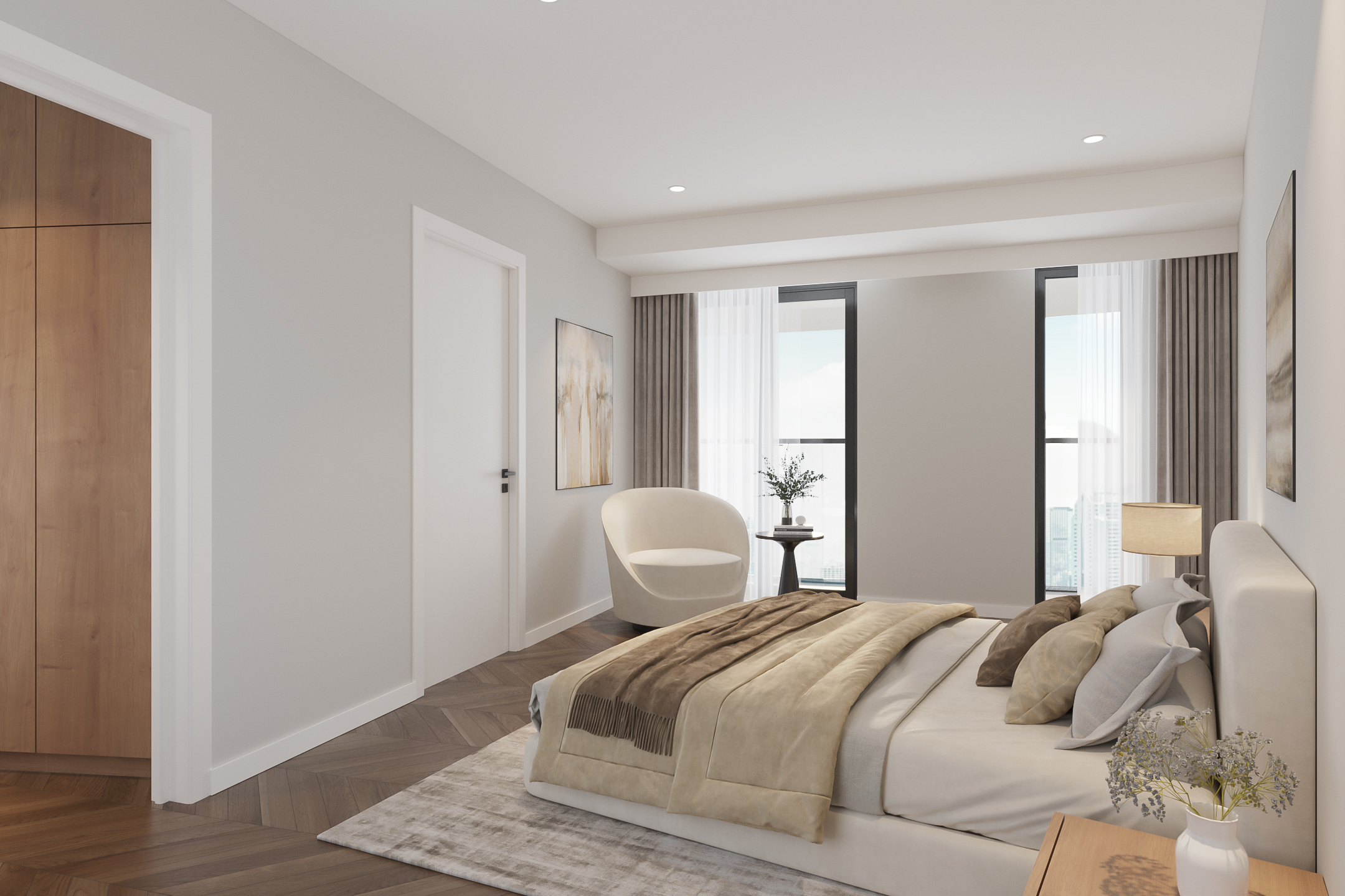 De riante masterbedroom heeft een ruime walk-in-closet met een eigen, luxueuze privé-badkamer met tweede toilet. Een tweede comfortabele badkamer met inloopdouche vindt u grenzend aan de eveneens riante slaapkamers twee en drie. Vanuit elke slaapkamer is het overdekte balkon bereikbaar.