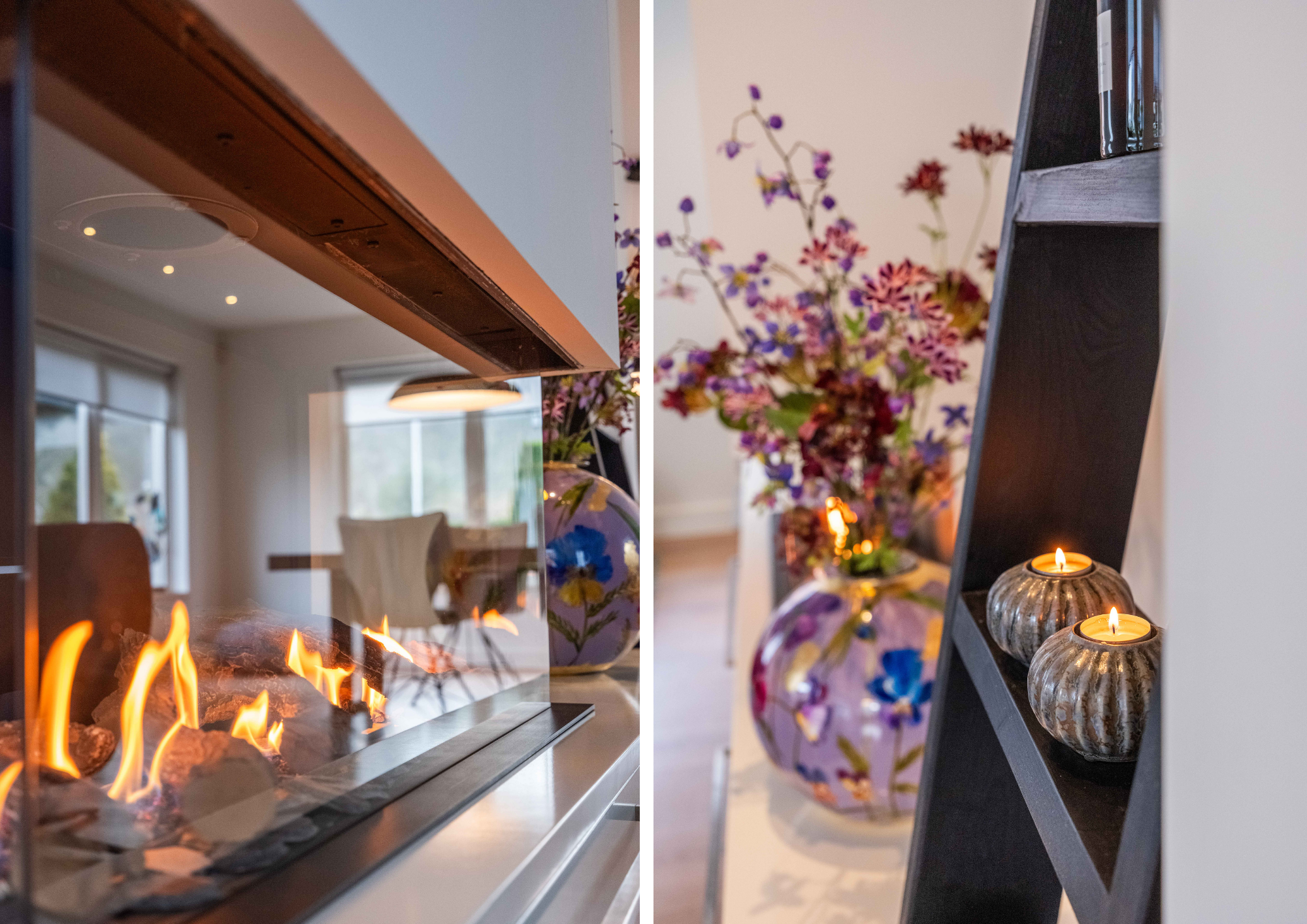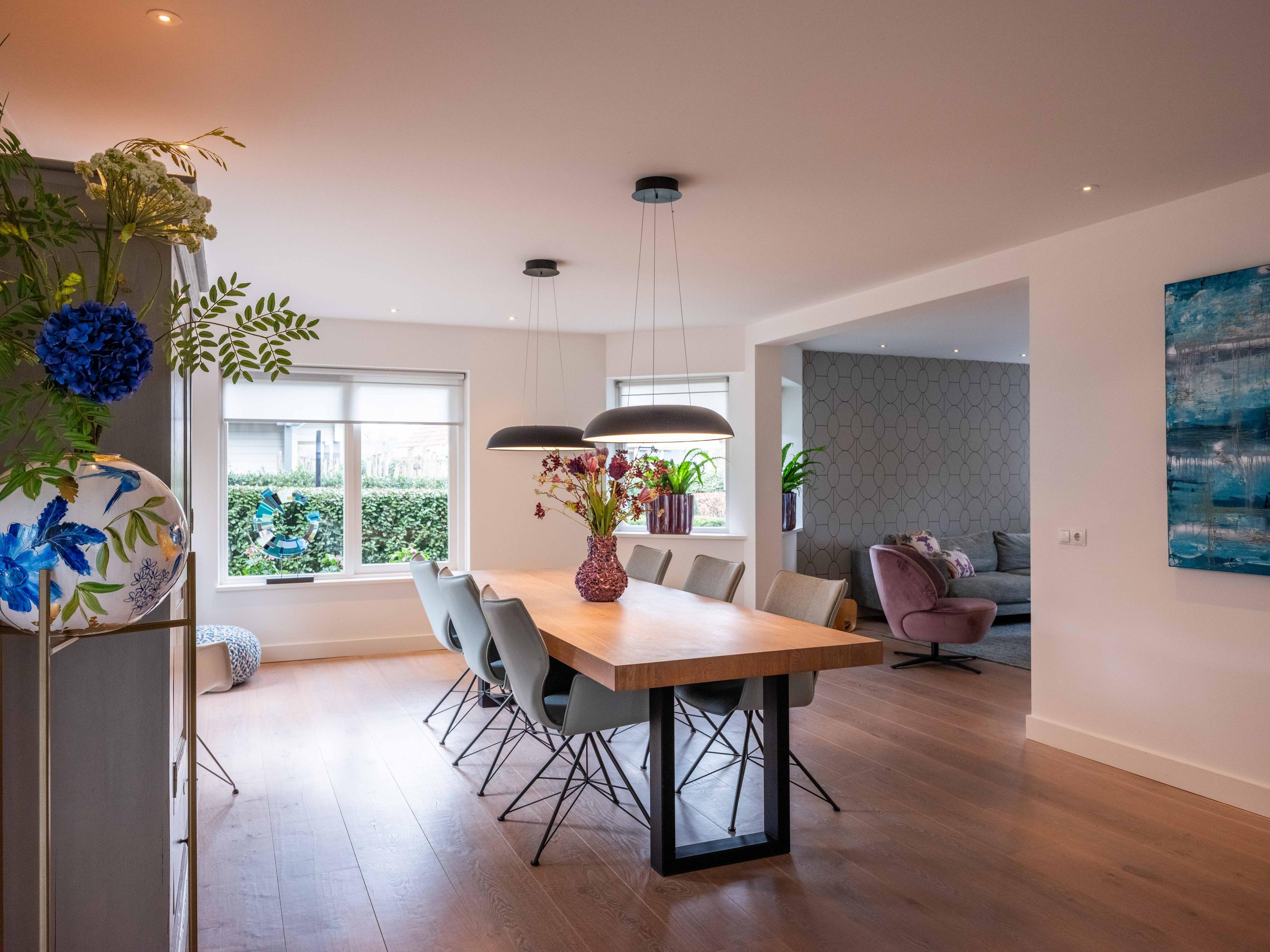Via dubbele deuren is er toegang tot de royale L-vormige living, hier wordt je meteen wordt verwelkomd door veel licht dankzij de grote raampartijen. In de hoek is een gezellige zithoek met een sfeervolle gashaard. De eiken verlijmde vloer in combinatie met vloerverwarming over de volledige begane grond zorgt voor een warme en comfortabele sfeer.