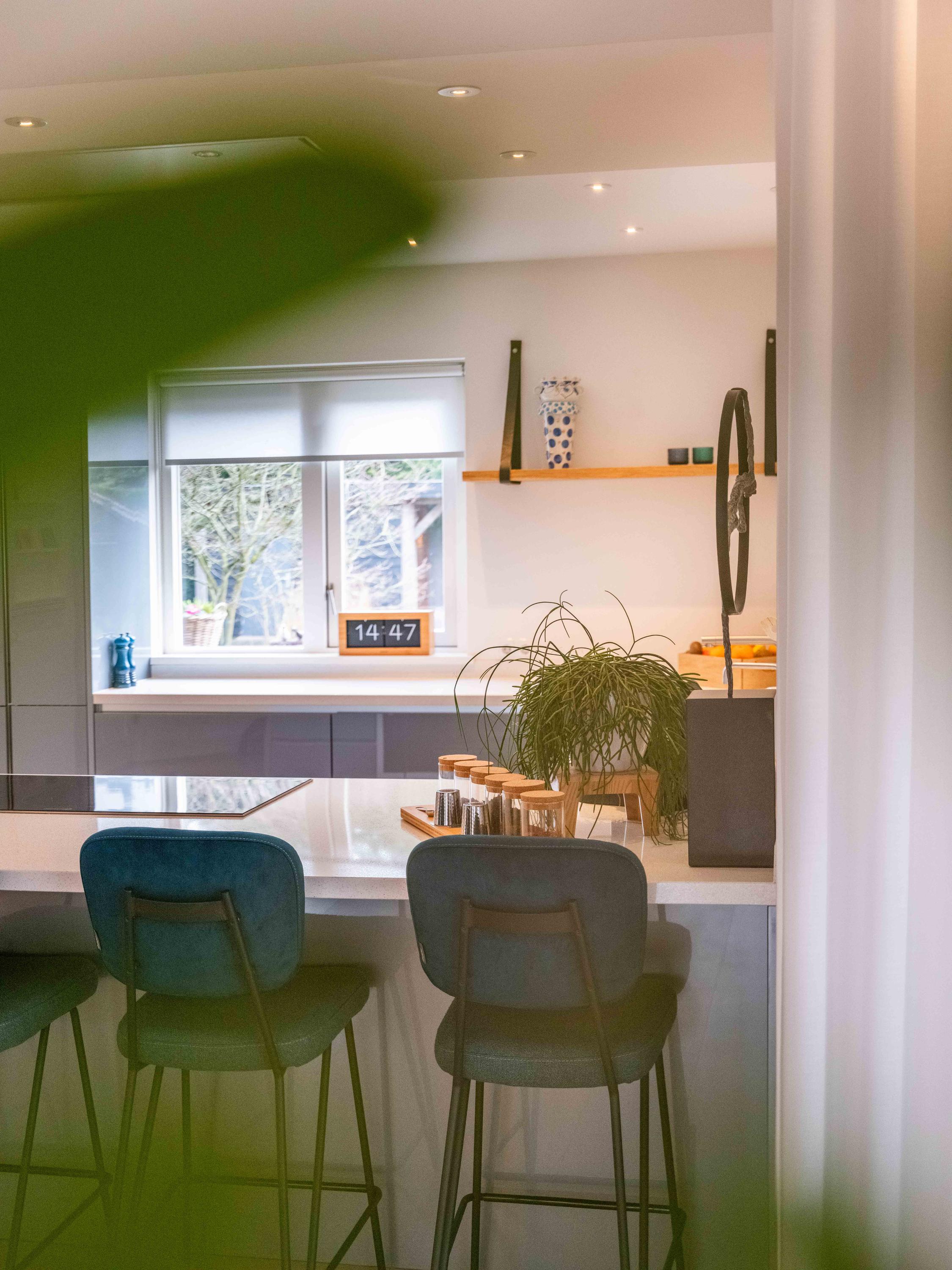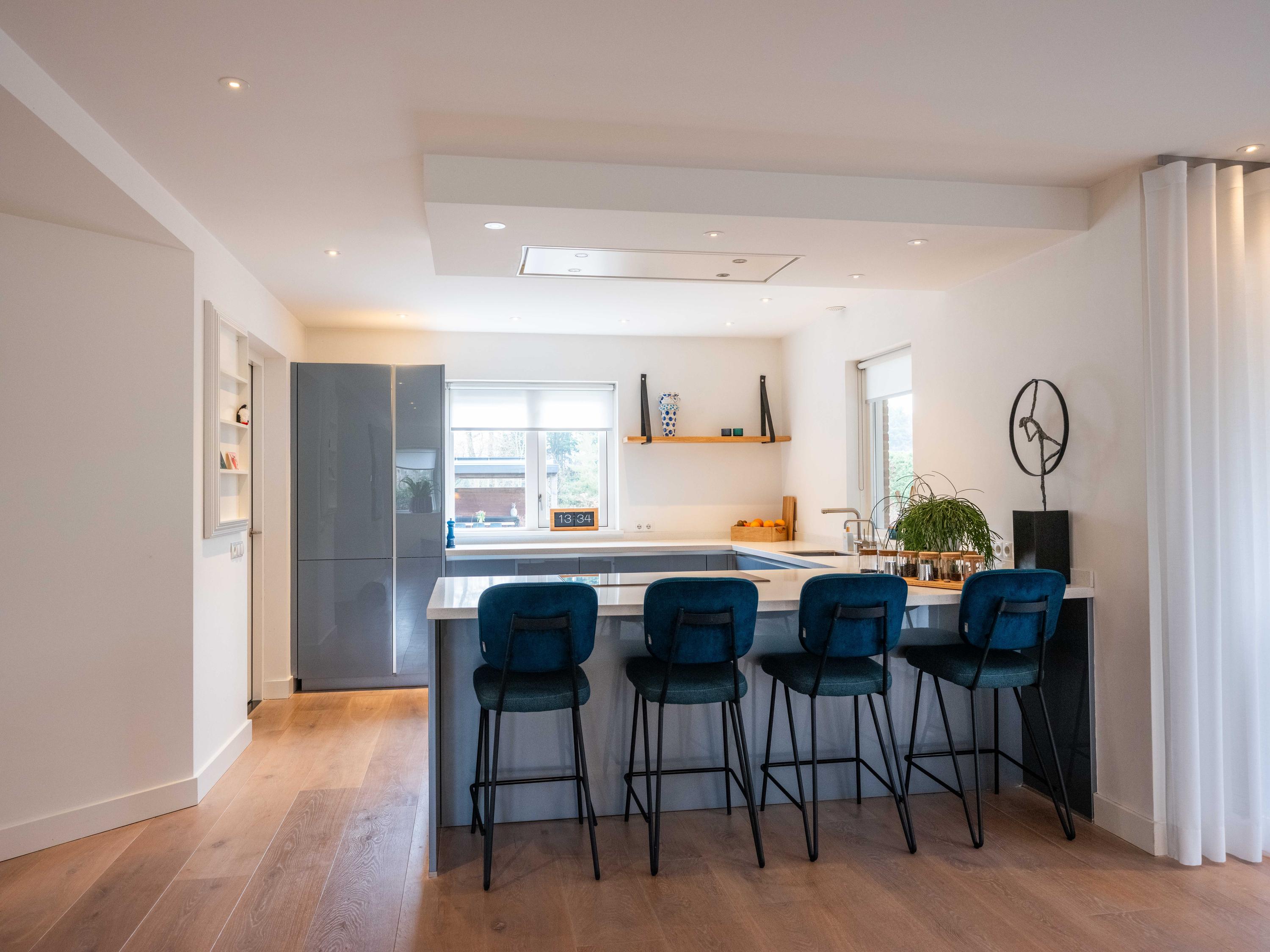 De open keuken is sfeervol ingericht en voorzien van een gezellige bar met zitplaatsen. Vanuit de keuken geniet je van een prachtig uitzicht over de tuin en is er directe verbinding met de woonkamer. Dankzij de open indeling en het overvloedige licht voelt alles ruim, fris en uitnodigend aan.