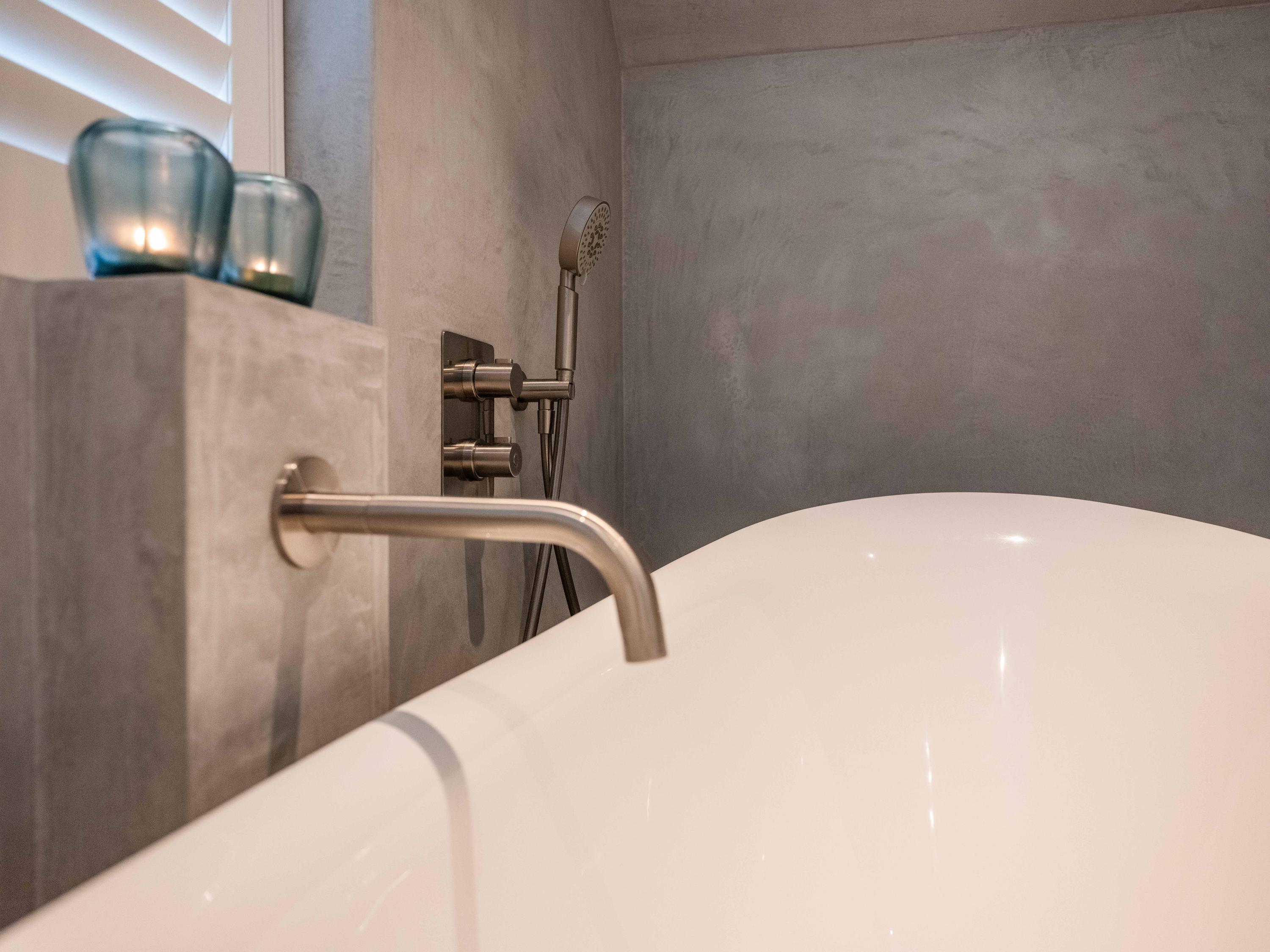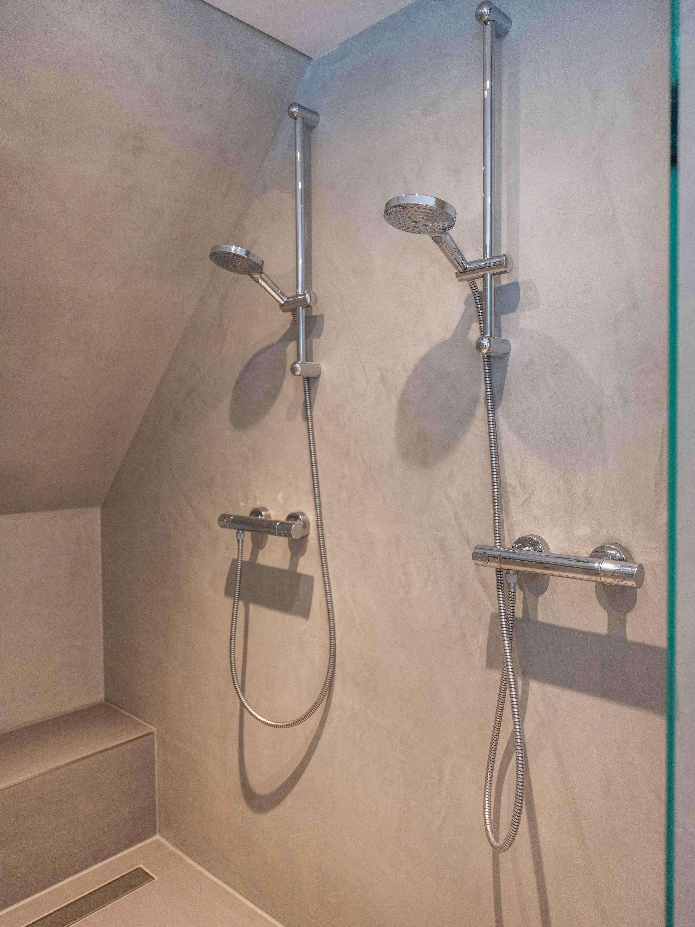 Op de eerste verdieping bevinden zich 3 slaapkamers en nog een ruime badkamer met dubbele wastafel, toilet, ligbad en een royale dubbele inloopdouche. Ook hier is vloerverwarming aanwezig, evenals een radiator. De grootste slaapkamer is ruim opgezet en beschikt over veel vaste kastruimte. Daarnaast zijn er nog twee lichte slaapkamers, beiden met vaste kasten en toegang tot een eigen balkon. Onder de trap naar zolder is nog een handige bergkast gesitueerd.