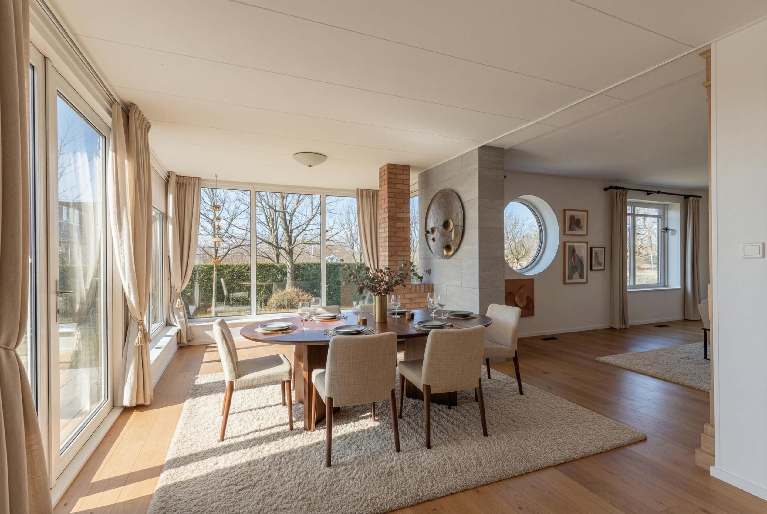 Via de entree komt u in een ruime hal met toegang tot de verschillende vertrekken. De royale woonkamer is georiënteerd op het water en de Friese vergezichten en biedt dankzij de grote raampartijen een adembenemend uitzicht. Aansluitend bevindt zich de serre met dubbele tuindeuren, een heerlijke lichte plek die binnen en buiten naadloos met elkaar verbindt.