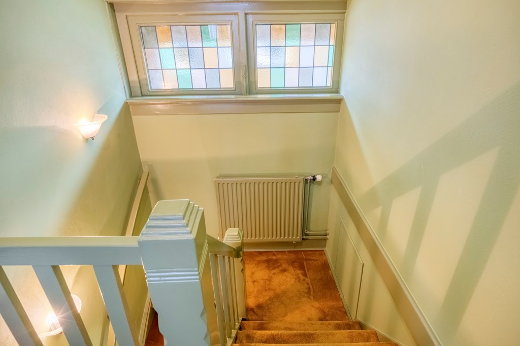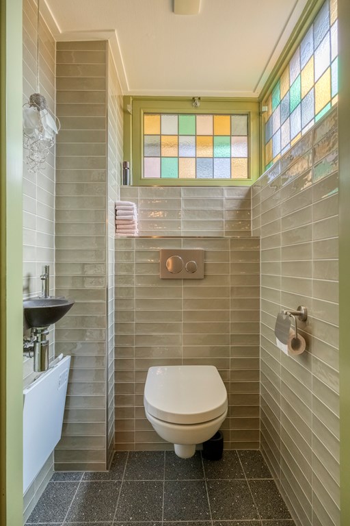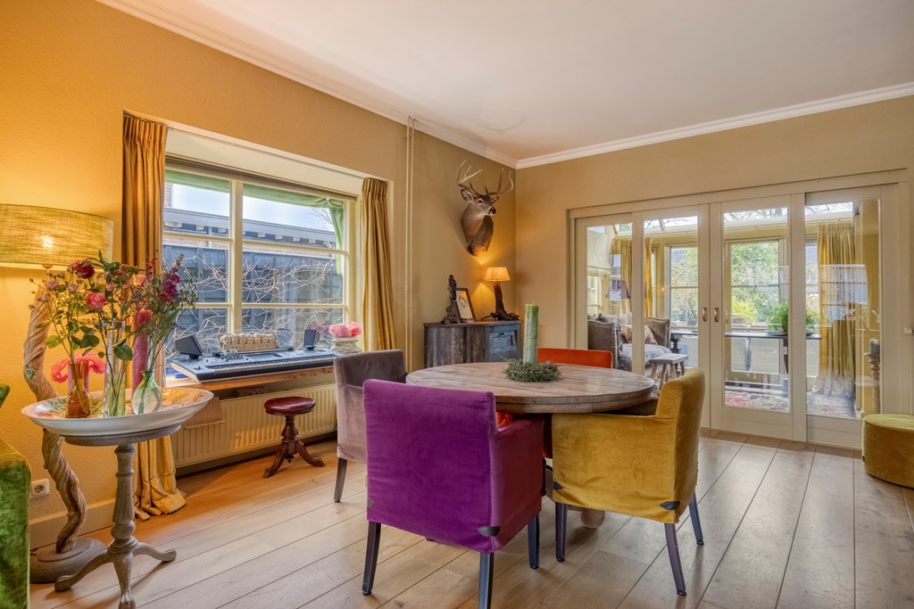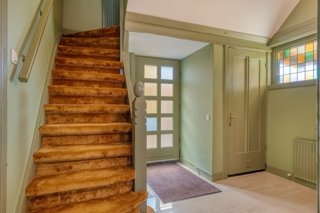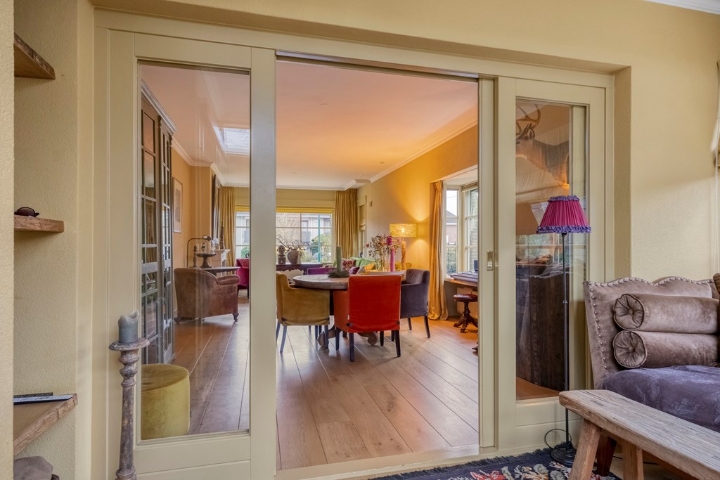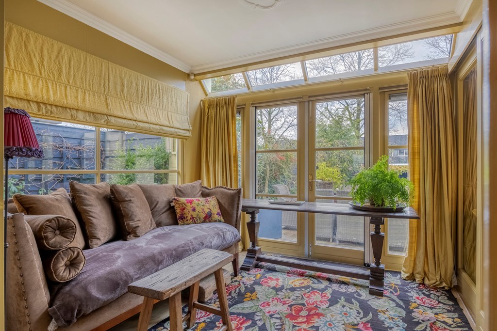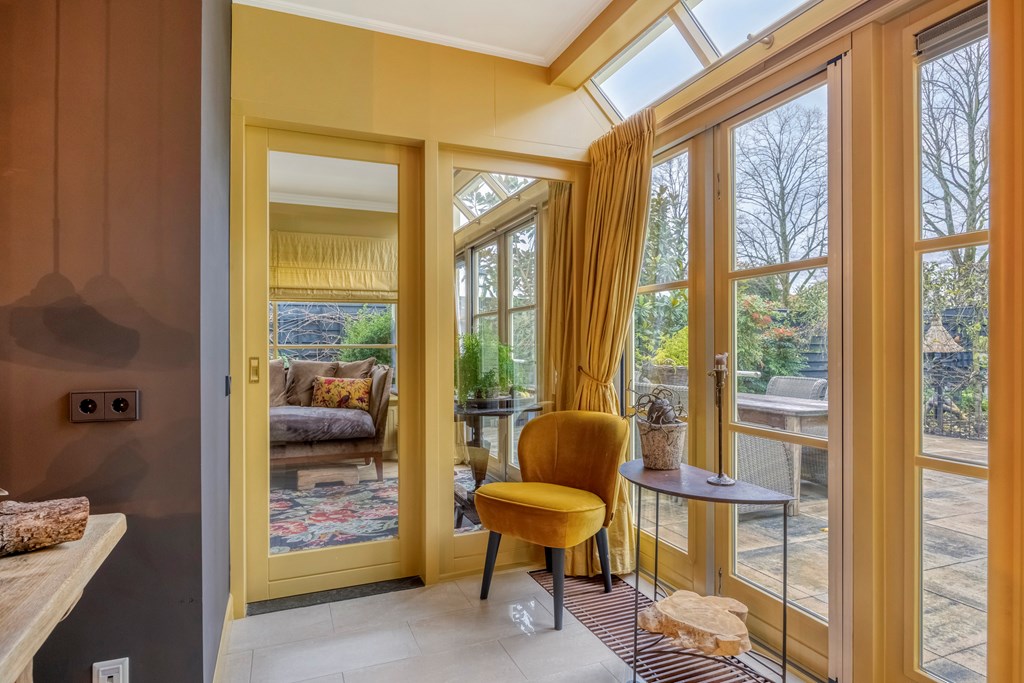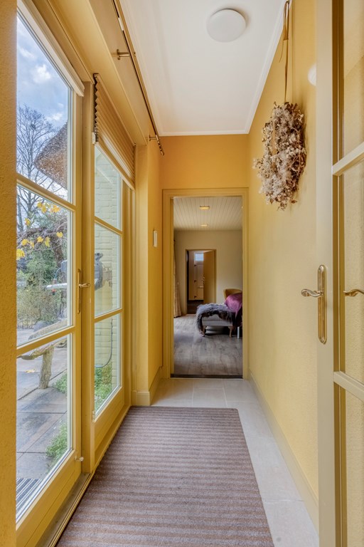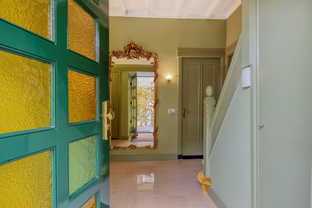 Via de zijkant van de woning komt u binnen in de hal, waar de eerste jaren ’20 details zich meteen laten zien: warme materialen, fijne lichtval, glas-in-loodraampjes en een prettige doorloop naar de kelder en leefruimte. Het toilet is modern en de trapopgang authentiek. De woonkamer strekt zich diep uit en vormt een heerlijk lichte ruimte dankzij de grote raampartijen, erker en de serre aan de achterzijde. Het gevoel van warmte komt van de houten vloeren, de sierlijke schouw en de verschillende zithoeken die het geheel intiem en sfeervol maken. De serre is een heerlijke toevoeging aan de woning; hier creëert u eenvoudig een gezellig zitje, met zicht op de tuin door de openslaande tuindeuren.
