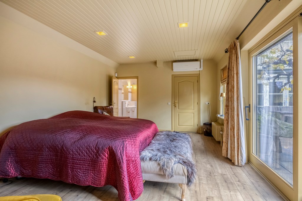 De woonkeuken is modern uitgevoerd met luxe apparatuur zoals een groot gasfornuis, een schouwafzuigkap, vaatwasser, koel- en vrieskast, airconditioning en een Quookerkraan. Hier kookt u met zicht op de tuin, terwijl het natuurlijke licht mooi over de gouden fronten van de keuken strijkt. Ook via de keuken zijn de serre en achtertuin toegankelijk gemaakt. Aangrenzend bereikt u enerzijds de praktische bijkeuken met witgoedaansluitingen en anderzijds een riante slaapkamer, met een evenzo riante walk-in closet en een badkamer en suite. Een schuifpui verbindt de slaapkamer met de tuin, en ook via de walk-in closet kunt u de tuin eenvoudig bereiken. De ruime badkamer is voorzien van licht tegelwerk en een lichtkoepel, een whirlpool, dubbele wastafel, een inloopdouche, wandcloset en volop opbergruimte.