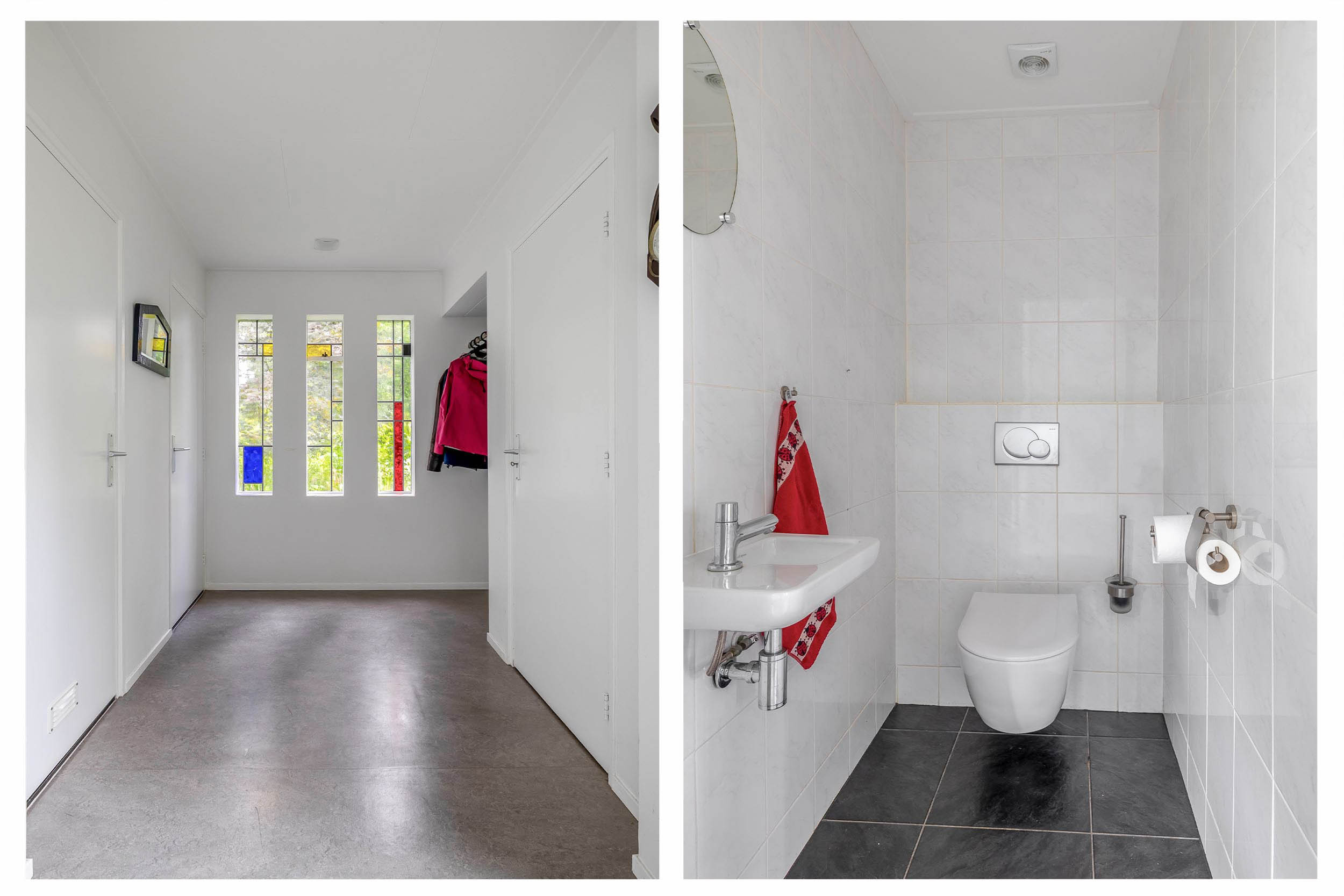 Je betreedt de woning via een royale, open entreehal met dubbele deuren. Deze beschikt over veel natuurlijke lichtinval dankzij de grote raampartijen.