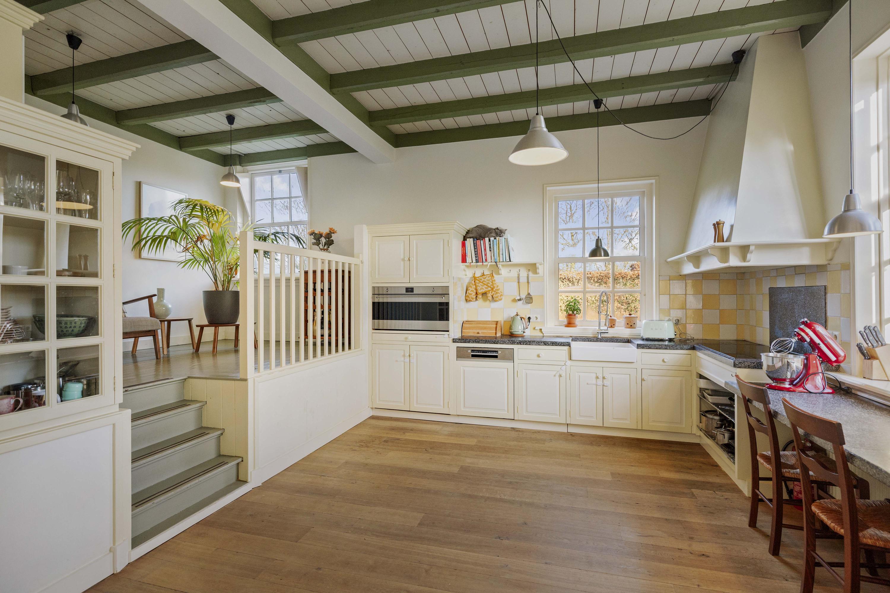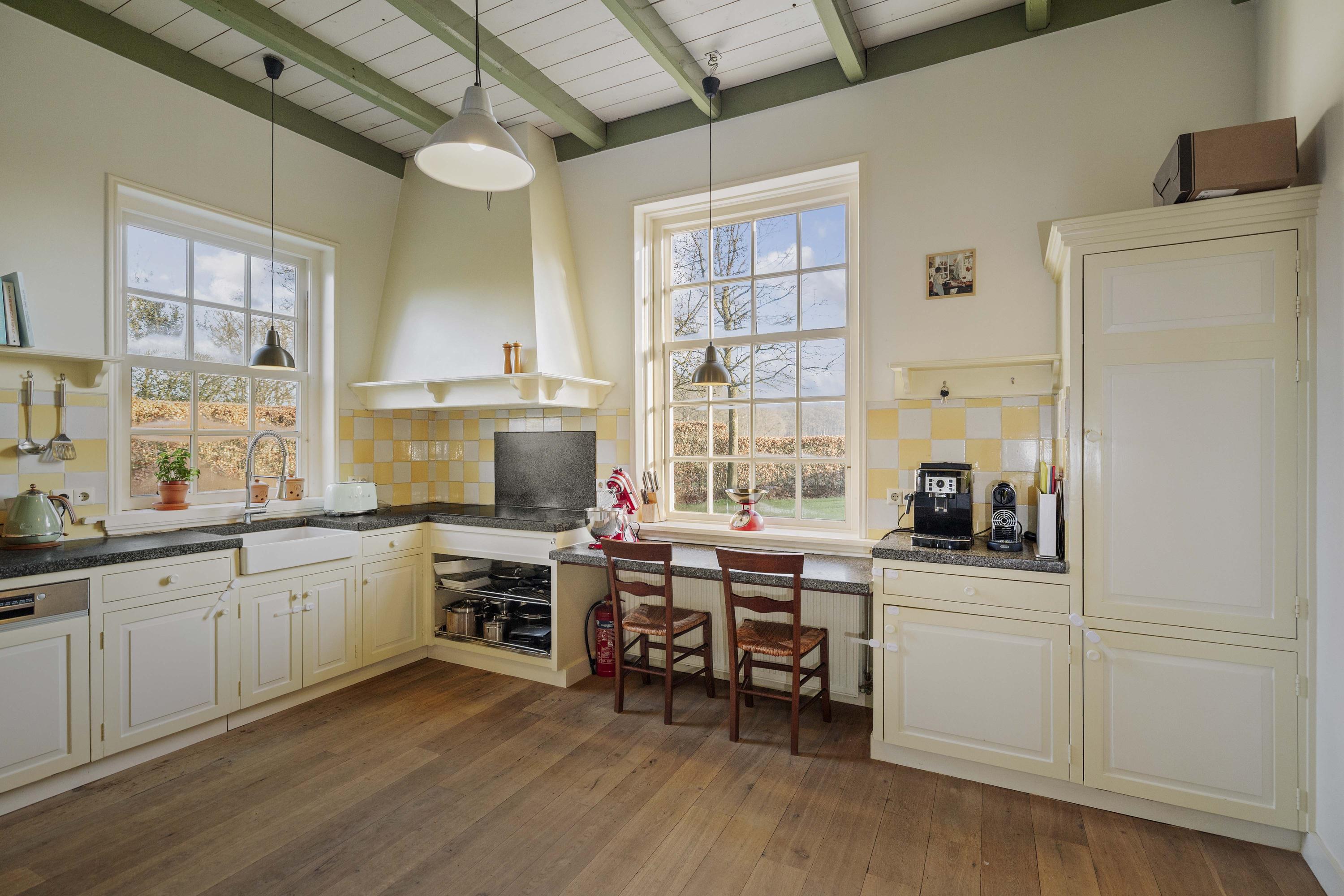 De keuken, met knusse opkamer, strookt qua look-and-feel helemaal met de nostalgie die het huis ademt, maar is verrassend modern en van alle gemakken voorzien; een keuken voor fijnproevers! De handgemaakte keuken is uitgerust met crèmekleurige houten fronten – er is hier veel bergruimte - en een werkblad van gezoete hardsteen. Koken gebeurt hier op de extra brede inductieplaat, en ook qua inbouwapparatuur is het piekfijn voor elkaar, met een koelvriescombinatie, een extra brede heteluchtoven (90 cm, SMEG) en een afwasmachine (Bosch). Onder de opkamer bevindt zich de tweede voorraadkelder.