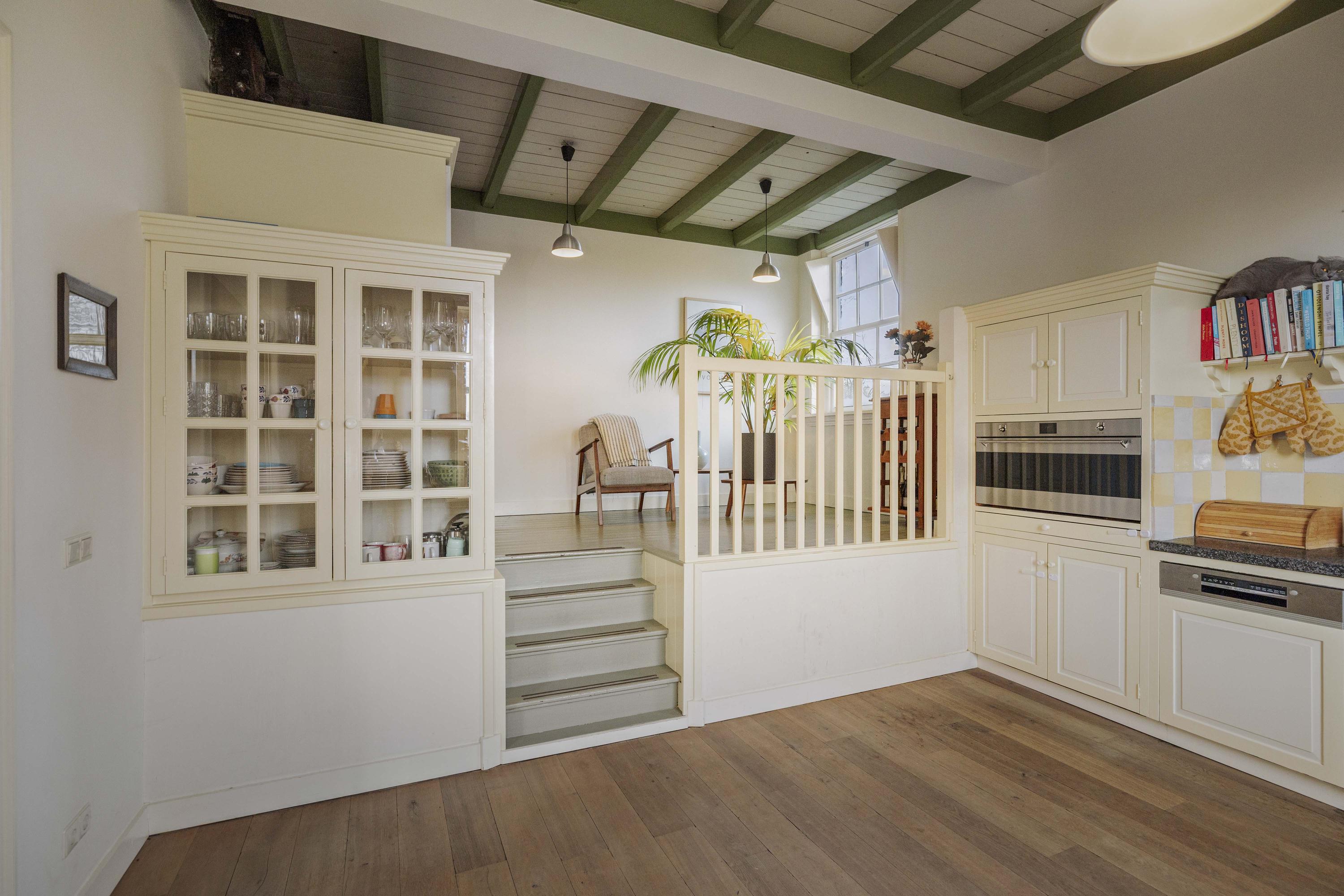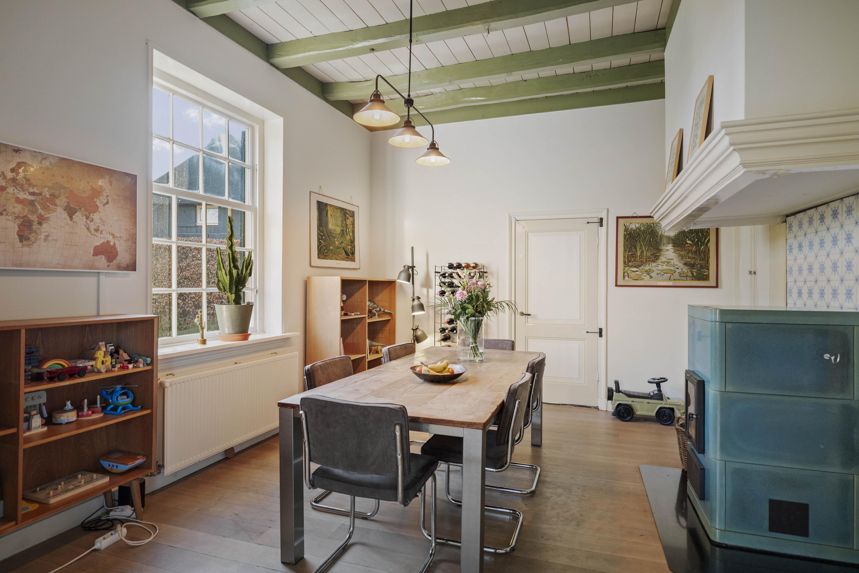 Aan de tuinzijde, in het voorhuis, bevinden zich de gezellige eetkamer en keuken. Ook hier ligt weer de fraaie eiken vloer. Een moderne tigchelkachel met aquablauw geglazuurde tegels houdt deze ruimte met gemak warm.