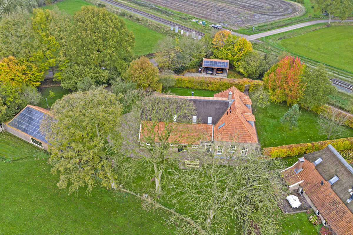 Het huis wordt omringd door een beeldige tuin. Er is een schuur met carport en aan de achterkant een afsluitbare tuingereedschapsberging (met op het dak 39 zonnepanelen - mooi uit het zicht), dus de auto’s staan droog, evenals de tuinspullen. Daarnaast is er een tweede houten bijgebouw (met op het dak 6 zonnepanelen) aanwezig, uitgevoerd in een landelijke stijl met potdekselwerk, Oud-Hollandse dakpannen en robuuste gebinten. Het bijgebouw biedt ruimte aan het parkeren van twee auto’s. Door de oriëntatie van het huis ligt er achter de woning een fijn zonneterras. Zowel aan de voor- als achterzijde zijn er grote gazons en de privacy wordt gewaarborgd door de manshoge beukenhagen. De gazons worden automatisch beregend via een ondergronds Rain Bird beregeningssysteem met pop-up sproeiers, aangesloten op een eigen grondwaterpomp en eenvoudig te bedienen via een app. Hierdoor kunnen het gras en de beplanting efficiënt en duurzaam worden bewaterd. Naast de beukenhagen beschikt de tuin eveneens over volwassen geboomte, waaronder vier appelbomen, een perenboom, een monumentale tamme kastanje alsmede een monumentale walnotenboom.