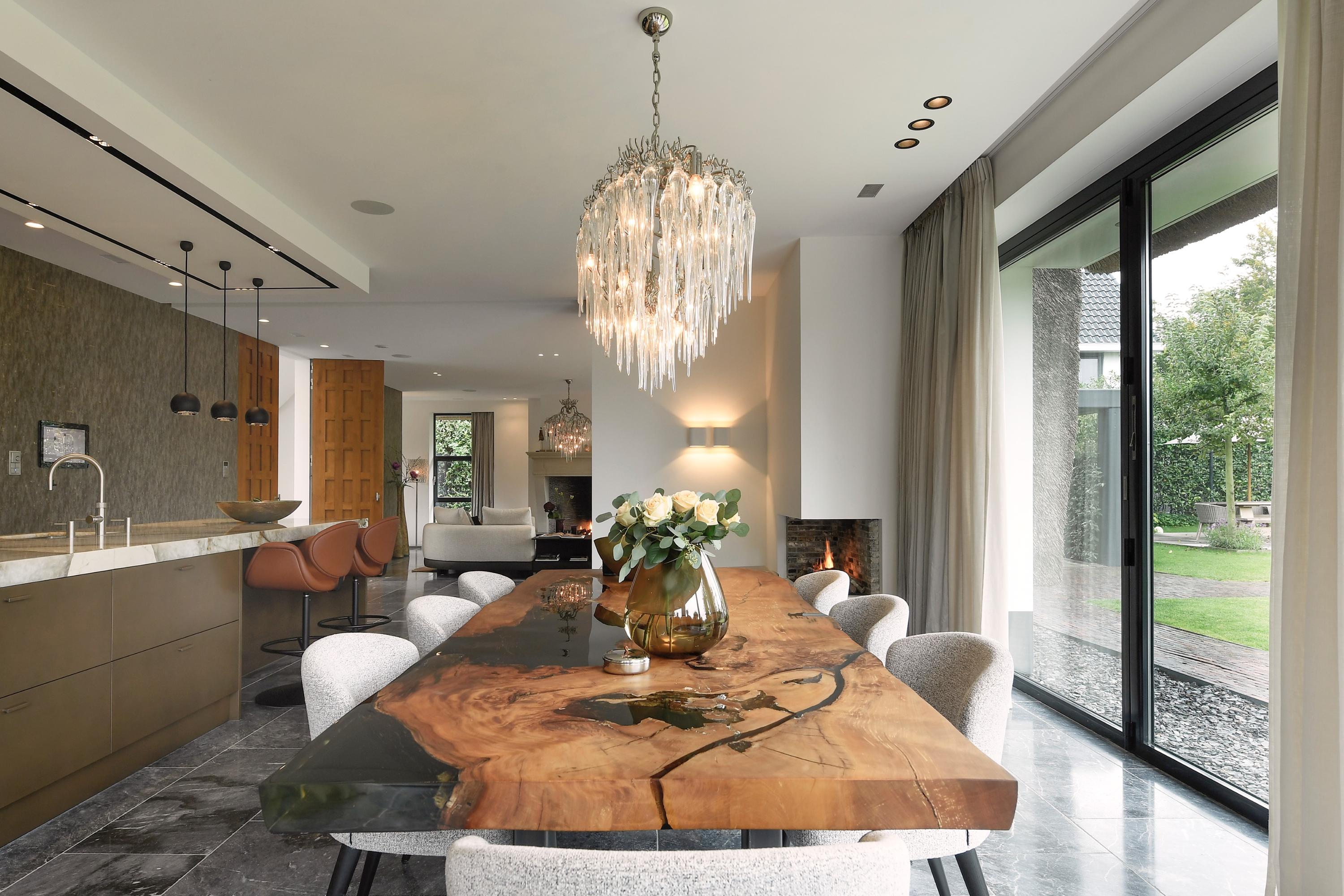 Hoge raampartijen en openslaande deuren zorgen voor een naadloze overgang tussen binnen en buiten.