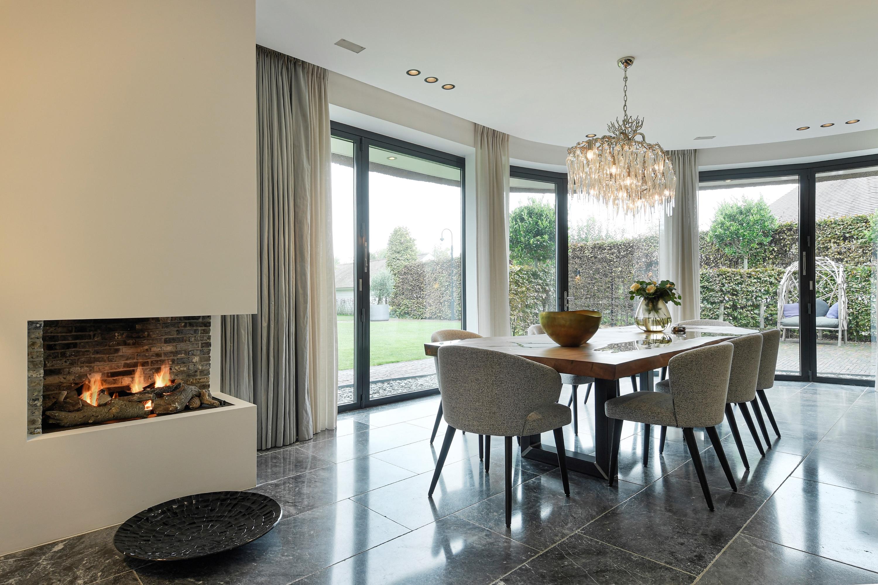 De royale woonkamer met open haard staat in verbinding met zowel de tuin als de eetkamer, en kan met houten schuifdeuren worden afgesloten.