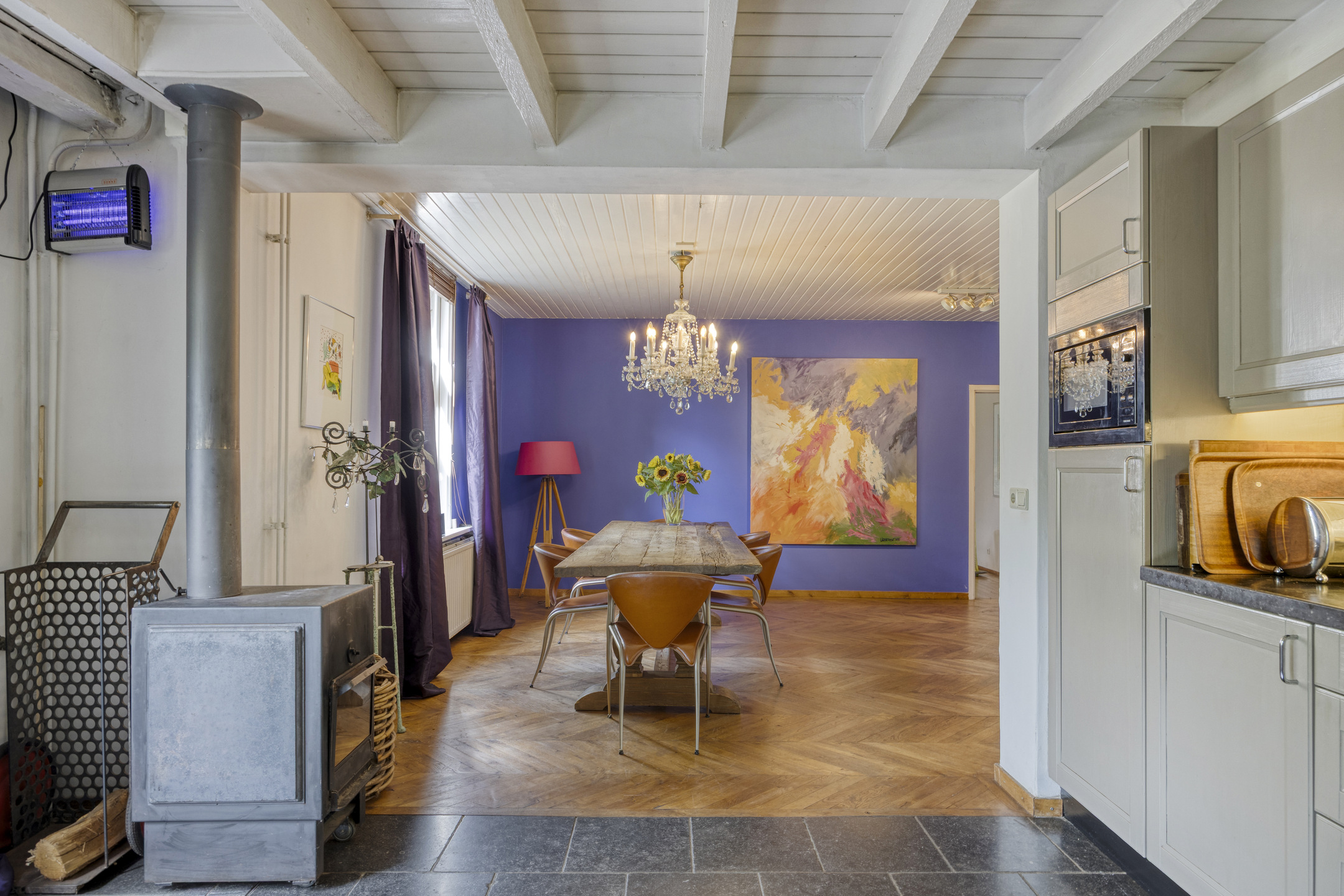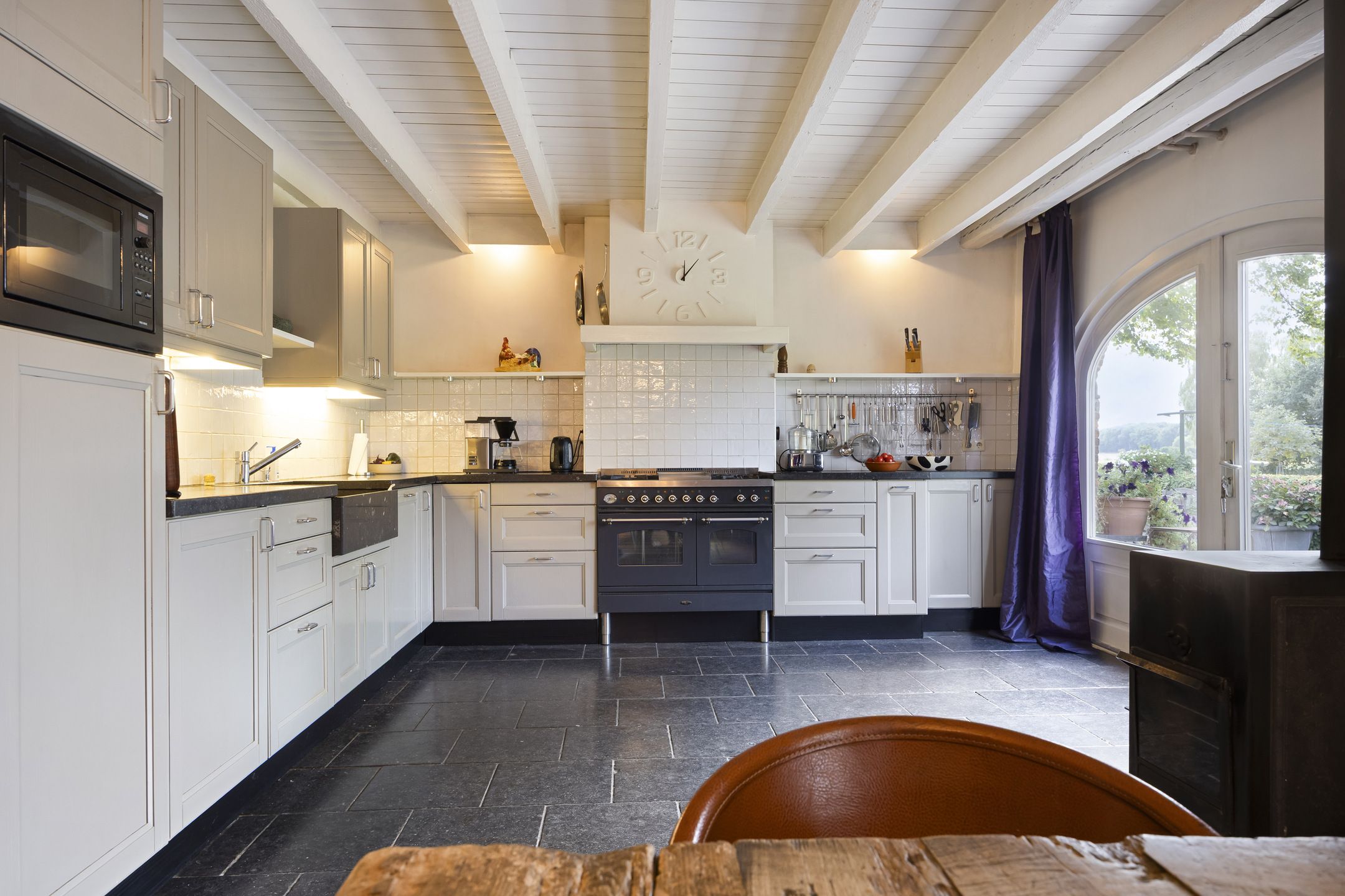 woonkeuken waarin geplaatst een in hoek opgestelde inbouwkeuken voorzien van een natuurstenen aanrechtblad met dubbele spoelbak, inbouw gasfornuis, -koeler -magnetron, -vaatwasser en een afzuigkap, tevens voorzien van een houtkachel, wandafwerking tegels en stucwerk, eiken visgraatvloer en deels natuurstenen vloer, plafond afgewerkt met houten schroten en balkenplafond, tuindeuren naar tuin/terras;